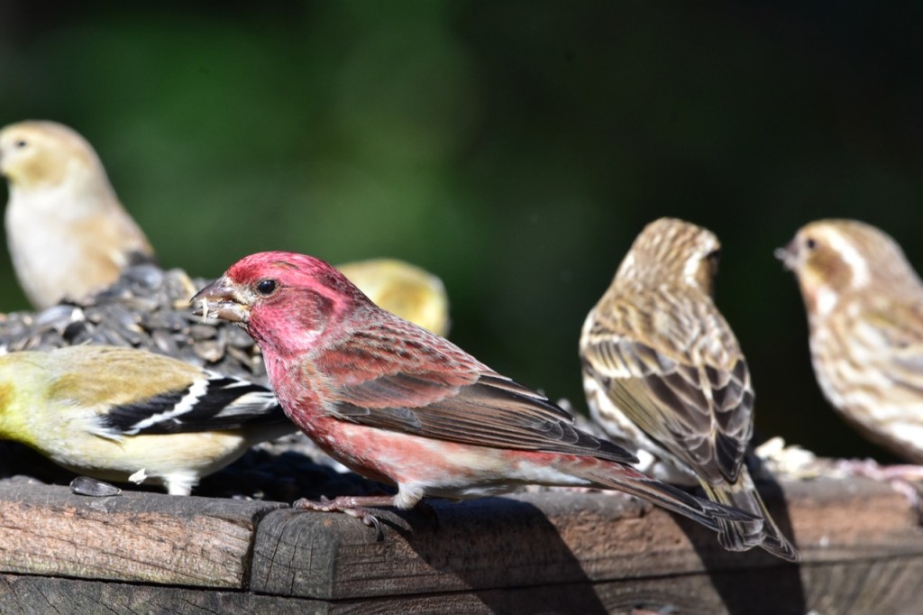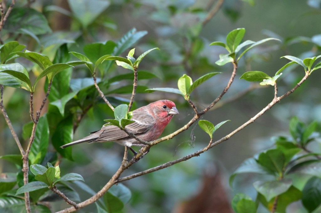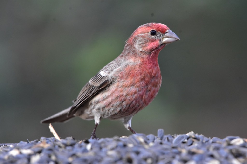 It is very hard to tell a Purple Finch from a House Finch when they both have the raspberry coloring. It is only possible once you see their chest. The House Finch has brown streaks on its chest while the Purple Finch doesn’t.