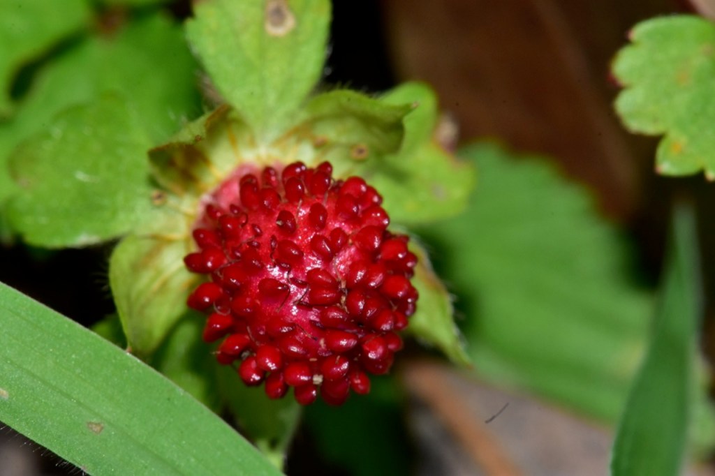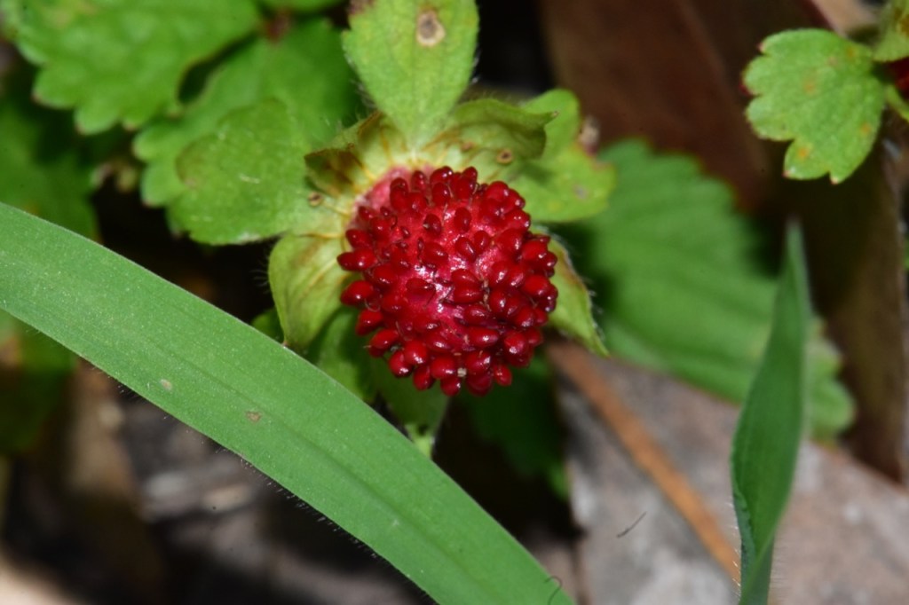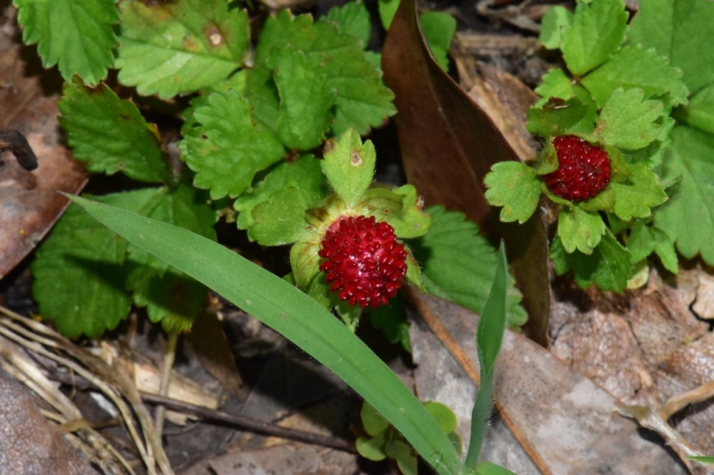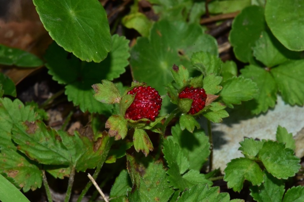 Mock or Indian Strawberry is an invasive plant. The small, red, strawberry-like berries are edible, but virtually flavorless.