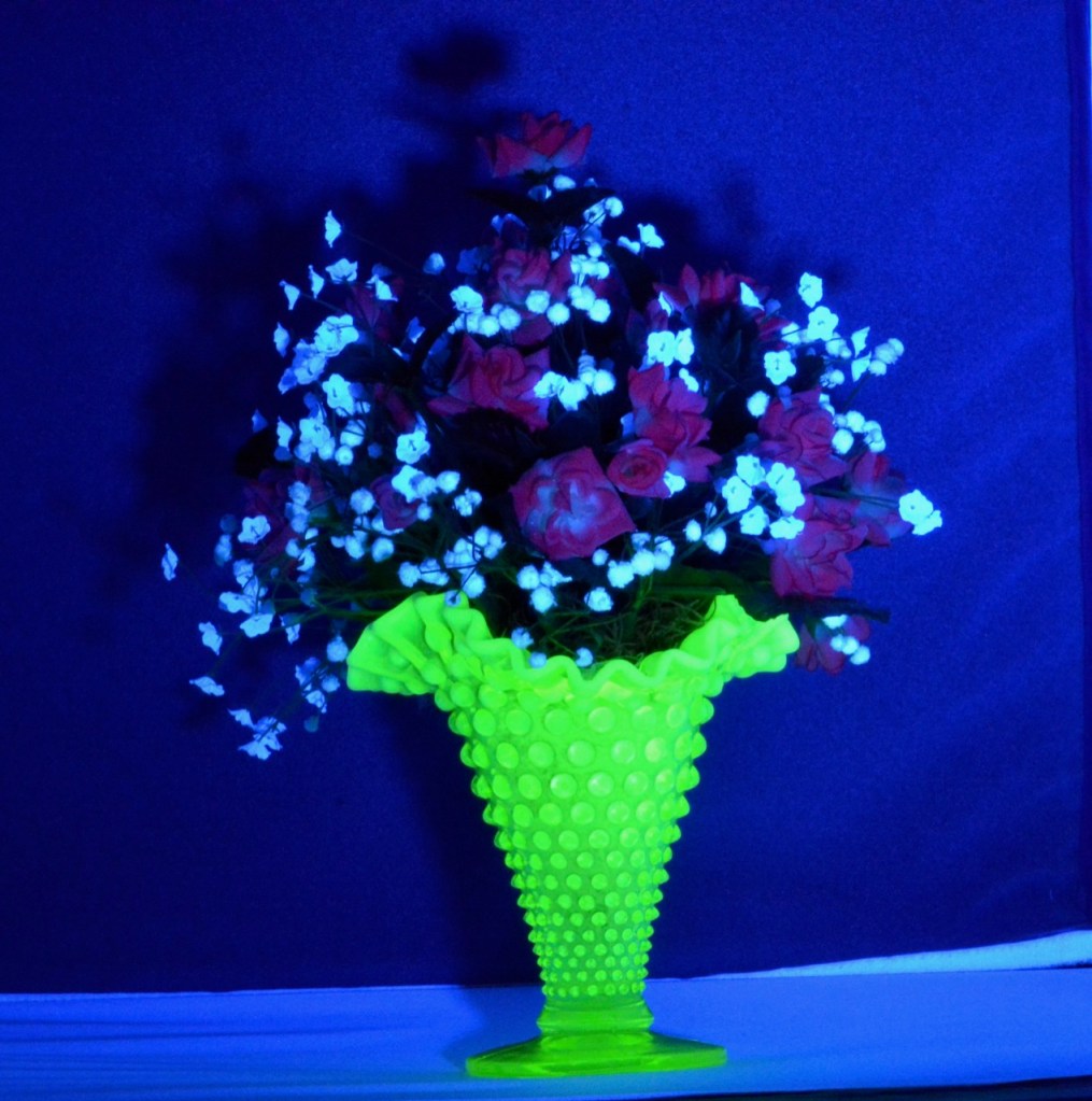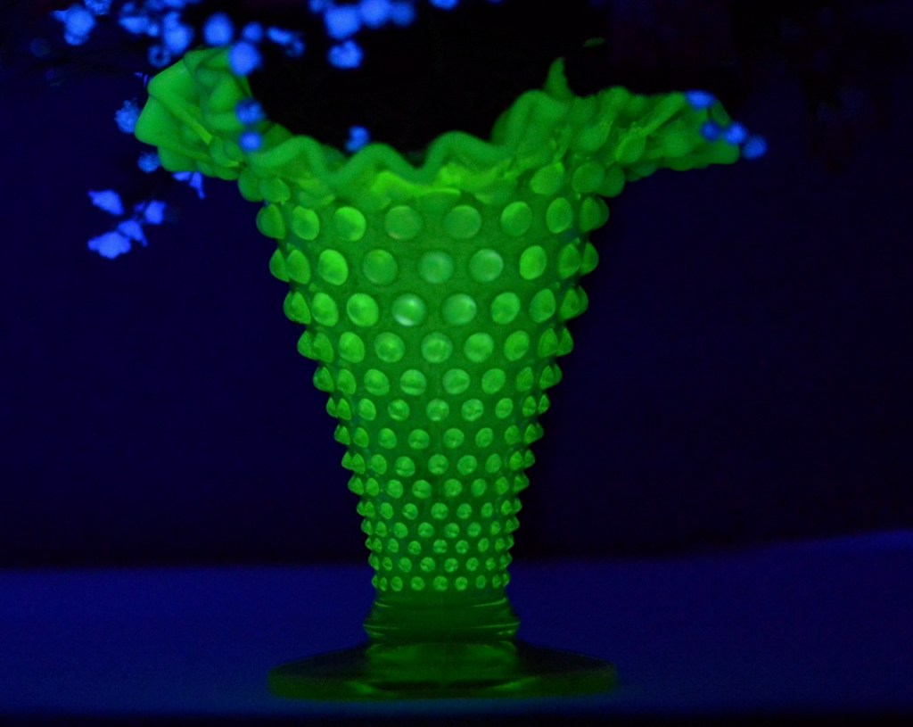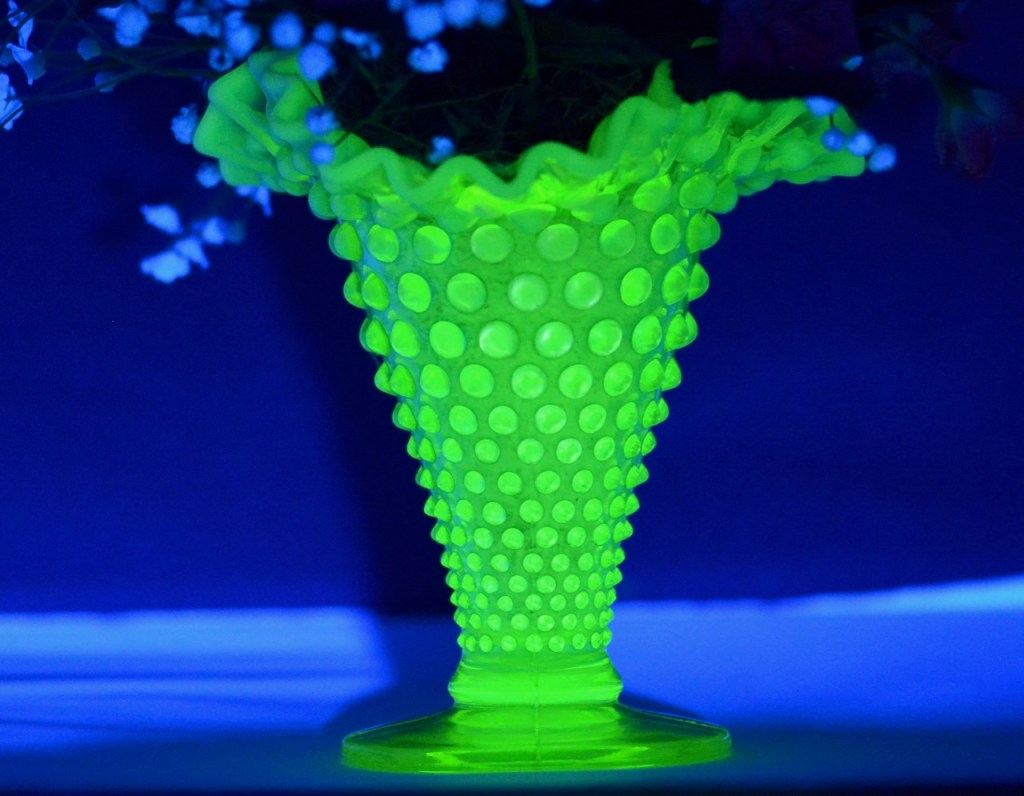Fenton Art Glass was well-known for its glass-working techniques and the many colors it produced, some of which used uranium 238, which is radioactive. Fenton Art Glass had to be licensed through the United States Nuclear Regulatory Commission to use the radioactive material. If you expose vaseline glass to UV light and it glows green, then it contains uranium.