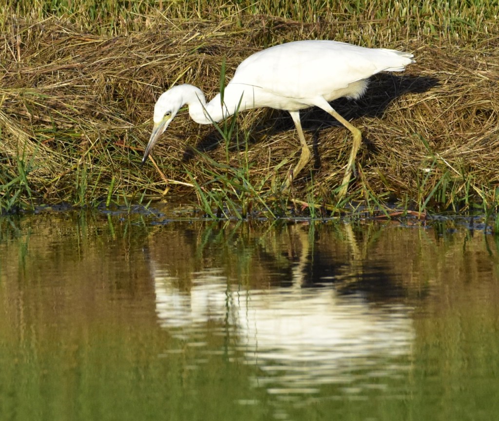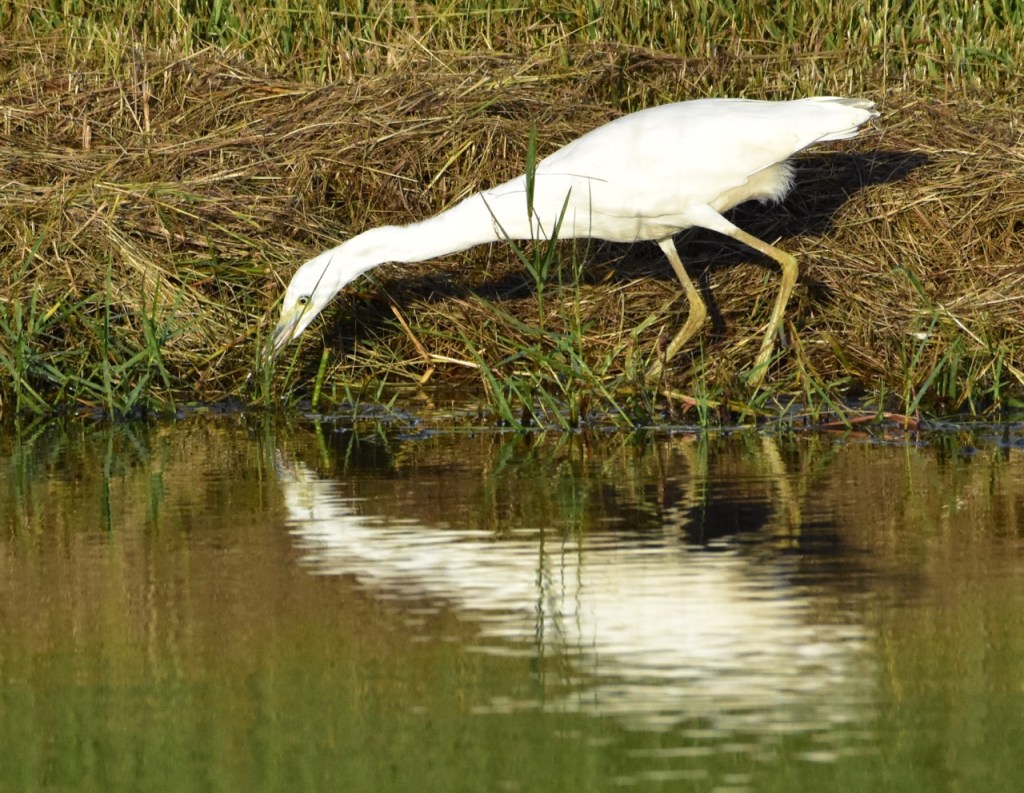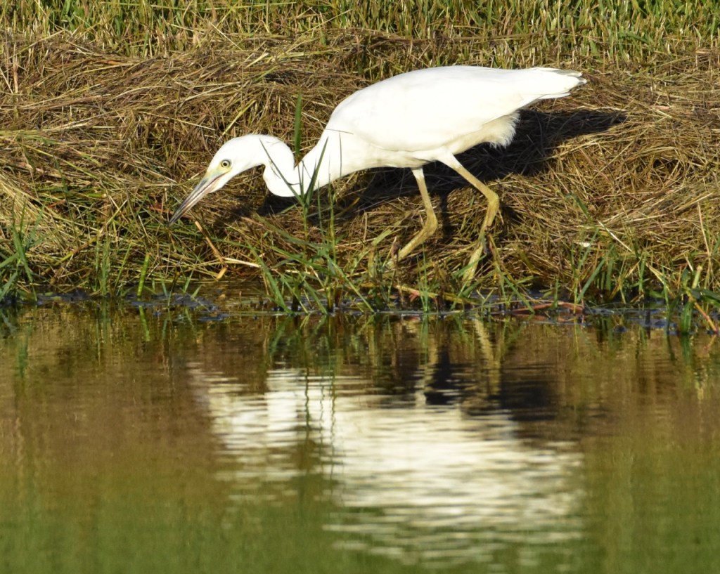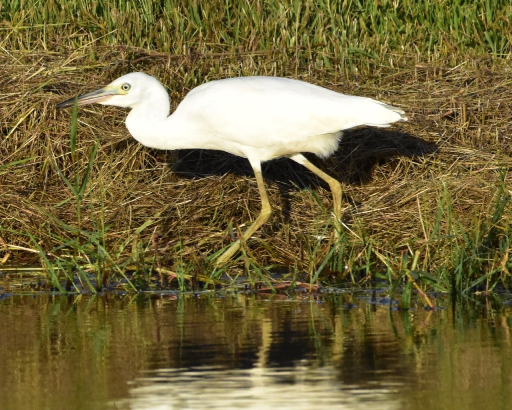Juvenile Little Blue Herons are entirely white, except for vague dusky tips to the outer primaries. Adult Little Blue Herons are very dark all over. At close range or in good light, they have a rich purple-maroon head and neck and dark slaty-blue body. They have yellow eyes, greenish legs, and a bill that is pale blue at the base, black at the tip. Immatures molting into adult plumage are a patchwork of white and blue. https://www.allaboutbirds.org/guide/Little_Blue_Heron/id