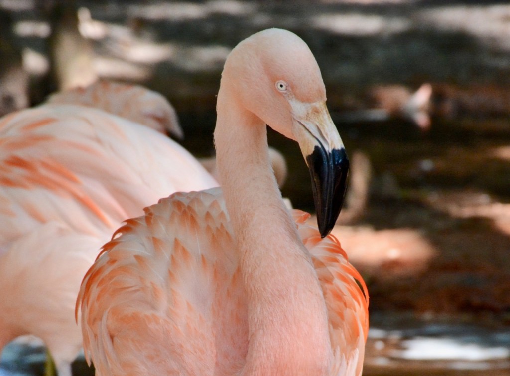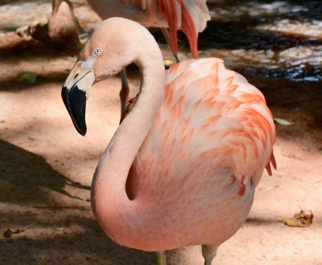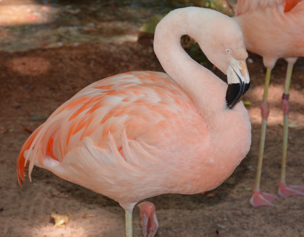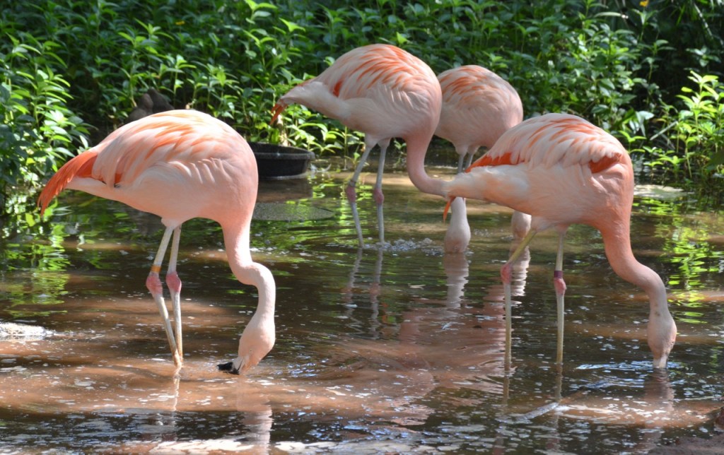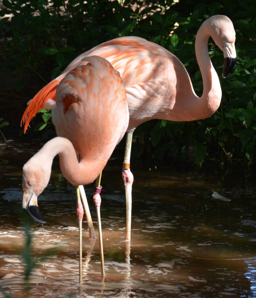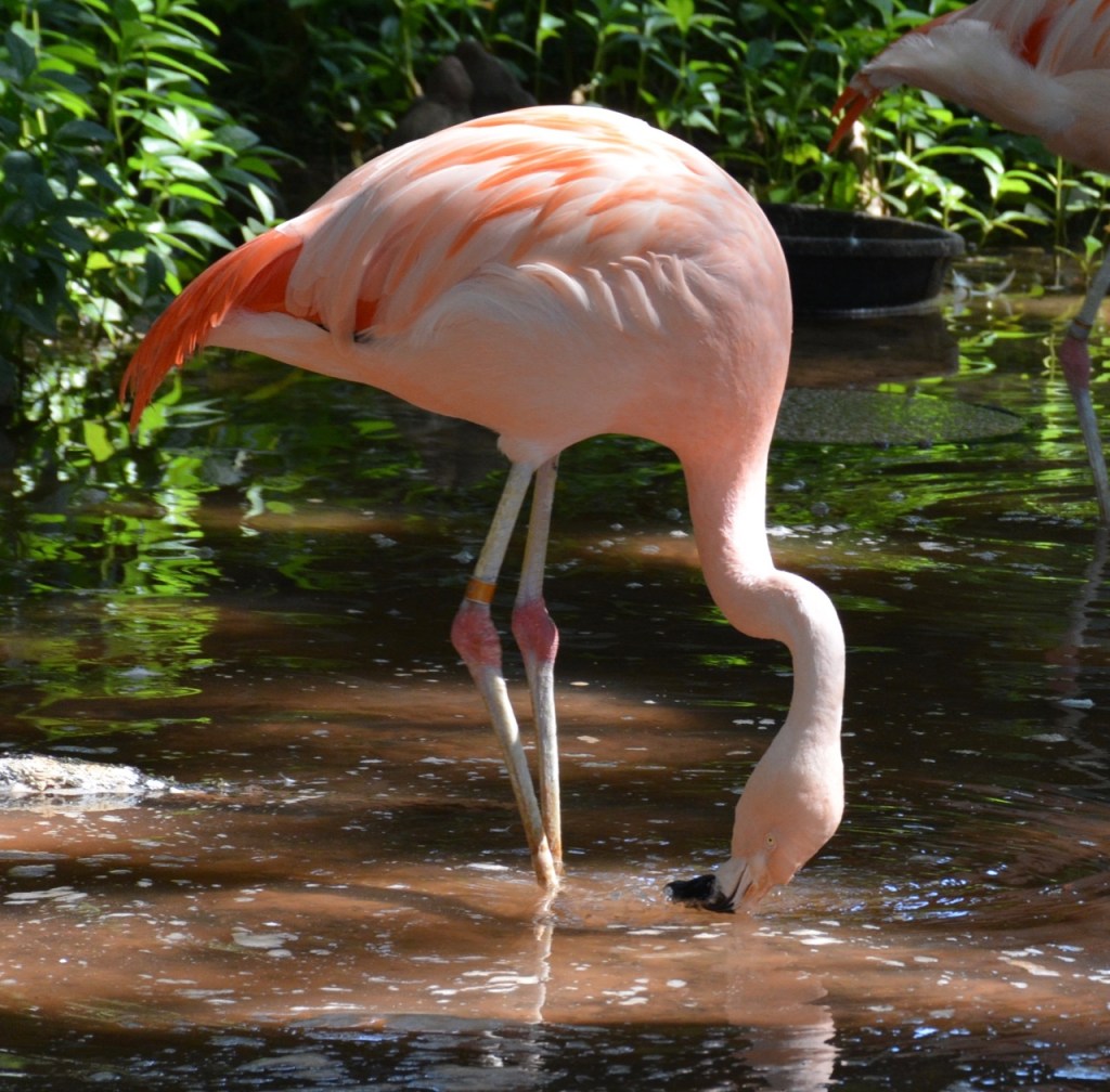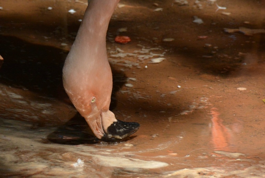 All flamingos feed with their bills upside-down. They tip their head into the water and filter feed, using special hair like adaptations in the top half of their bill, to gather the microorganisms that make up their diet.