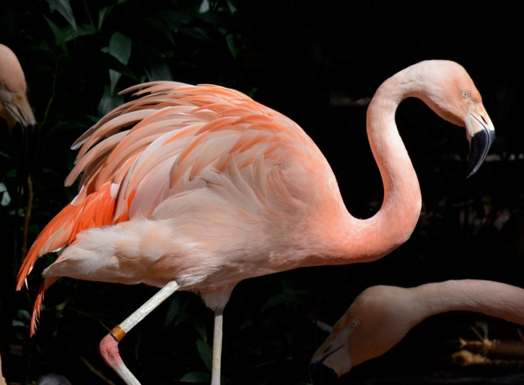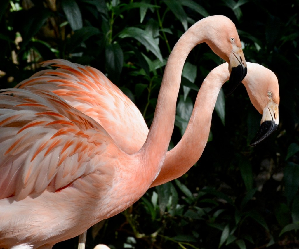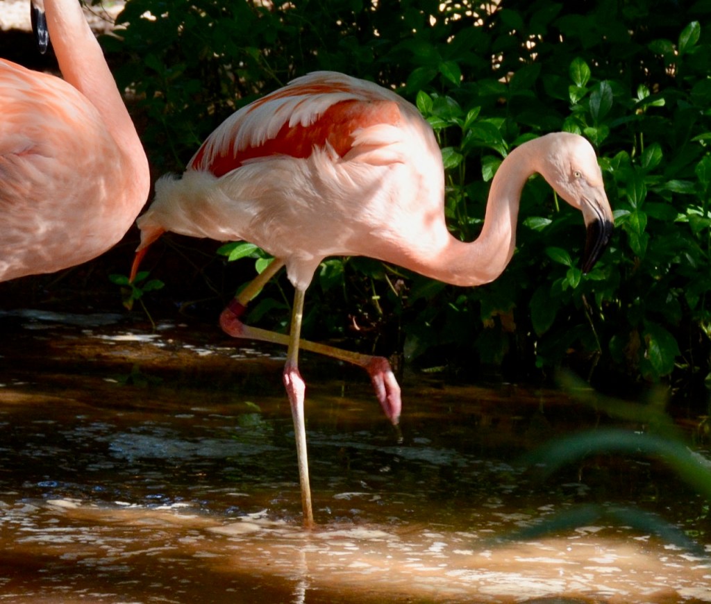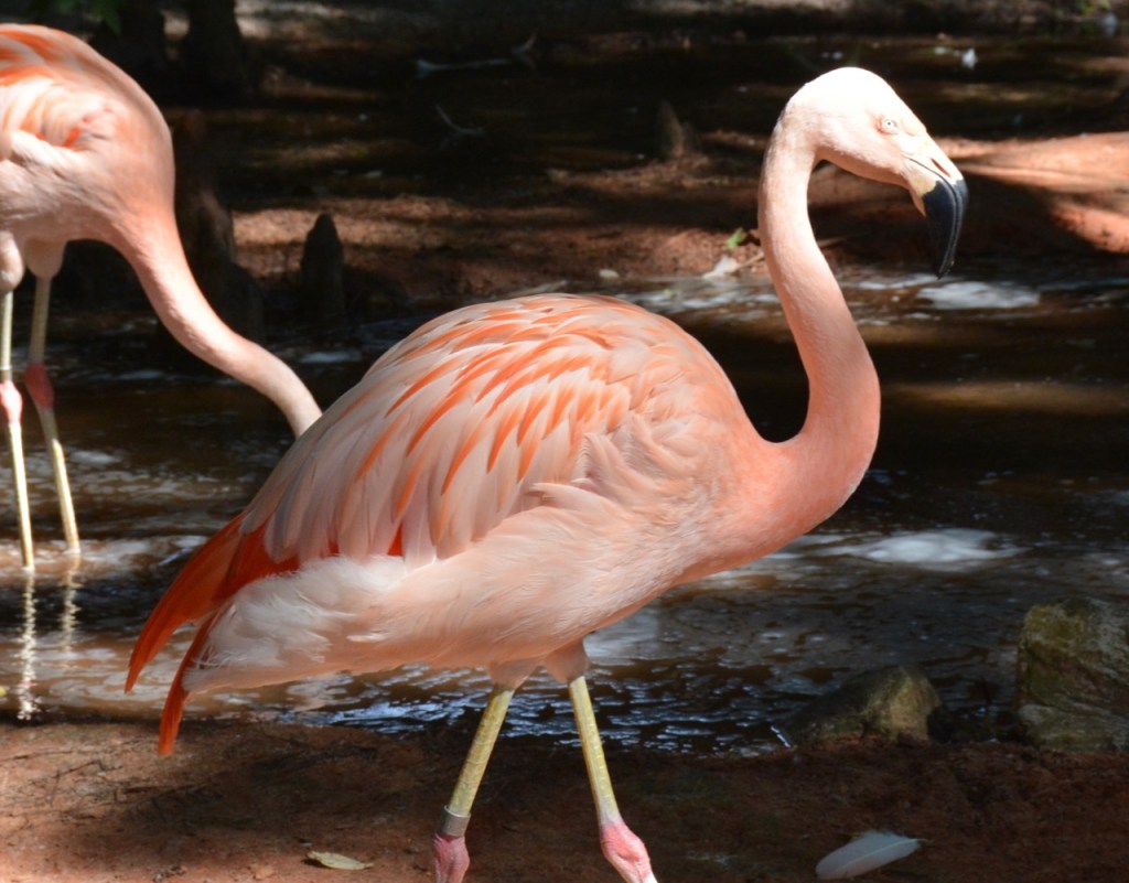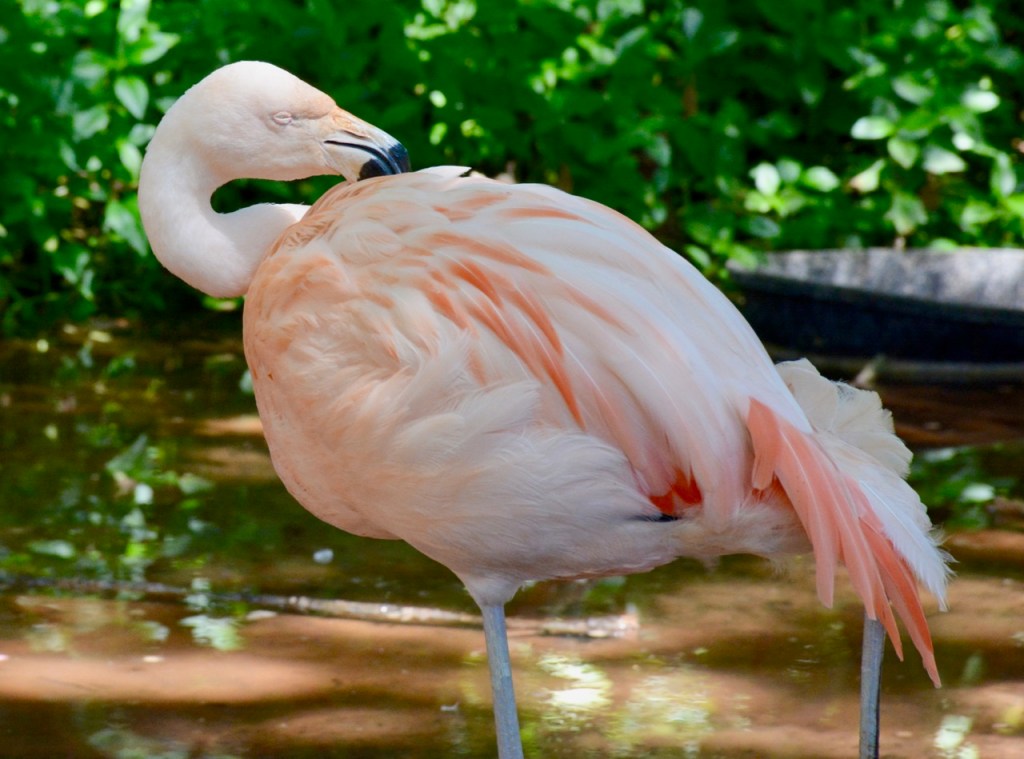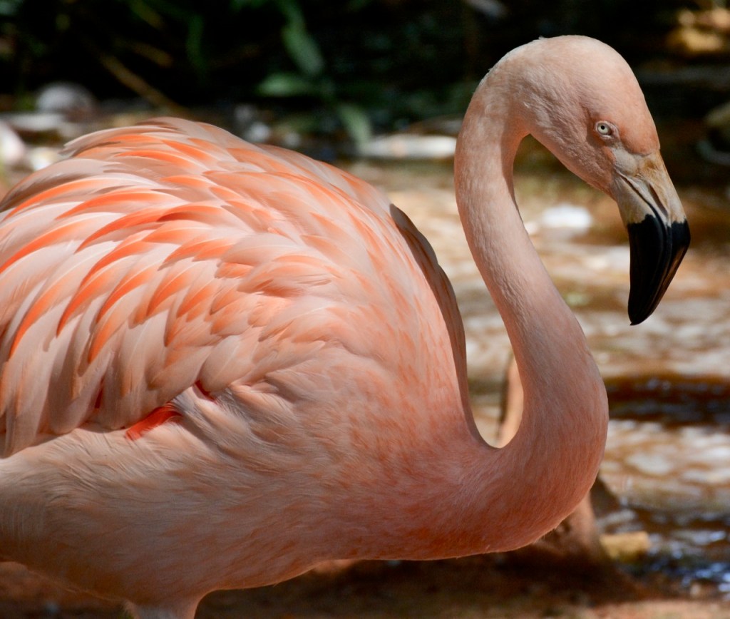 All flamingos feed with their bills upside-down. They tip their head into the water and filter feed, using special hair like adaptations in the top half of their bill, to gather the microorganisms that make up their diet.