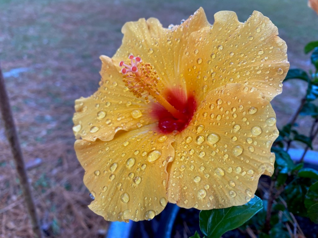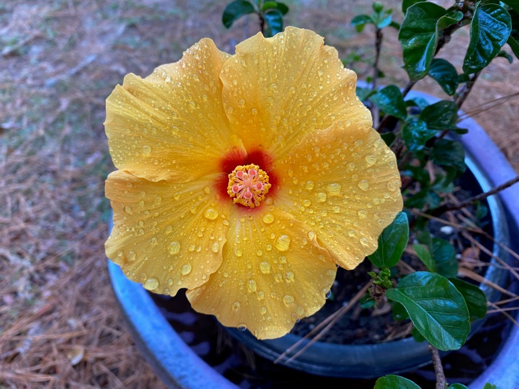 I thought this hibiscus had finished flowering when it was at my mom’s house. I brought it over to my house and re-potted it. After a few weeks, it started to flower again. My neighbor commented on what a pretty flower I had growing in my yard. It is very pretty.