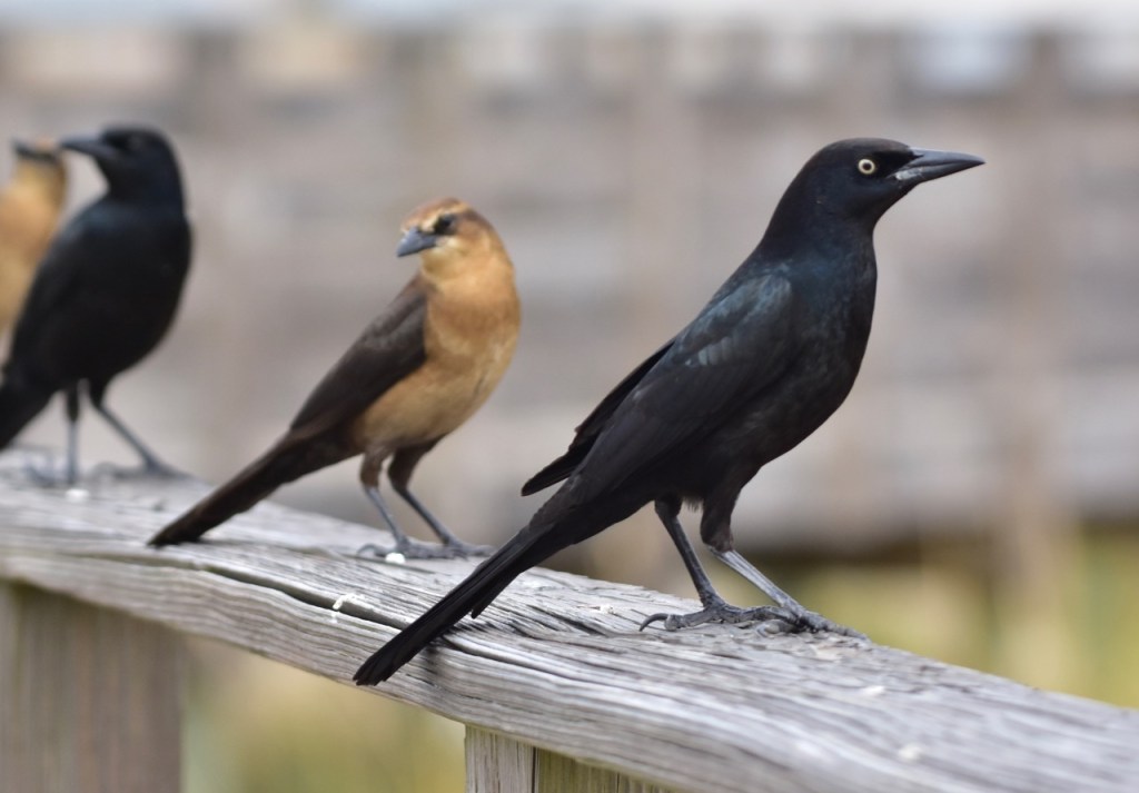 Female Boat-tailed Grackles are dark brown above and russet below, with a subtle face pattern made up of a pale eyebrow, dark cheek, and pale “mustache” stripe.