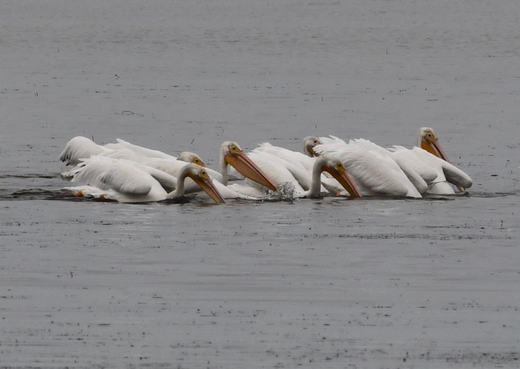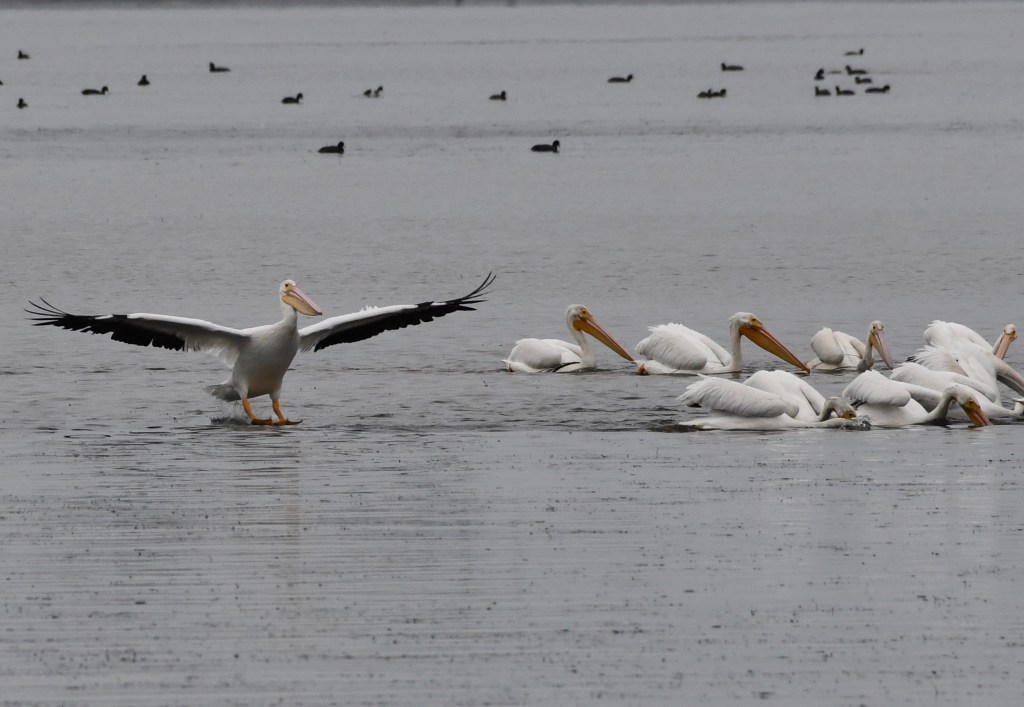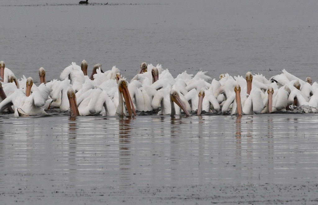 American White Pelicans feed from the water’s surface, dipping their beaks into the water to catch fish and other aquatic organisms. One of our largest flying birds: considerably larger than a Bald Eagle; smaller than a California Condor.