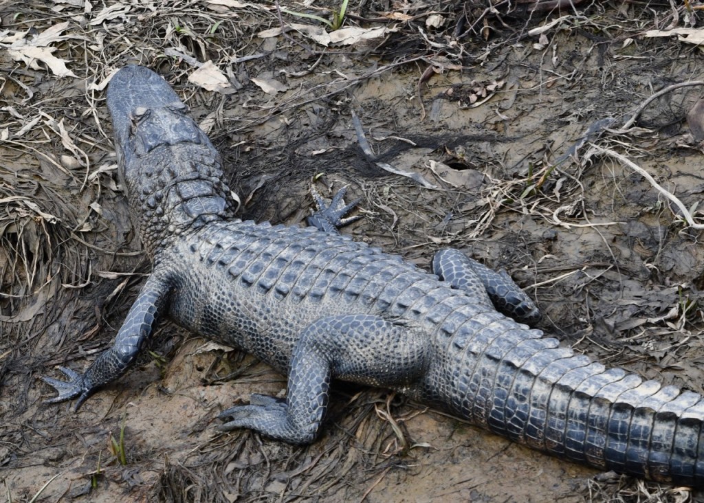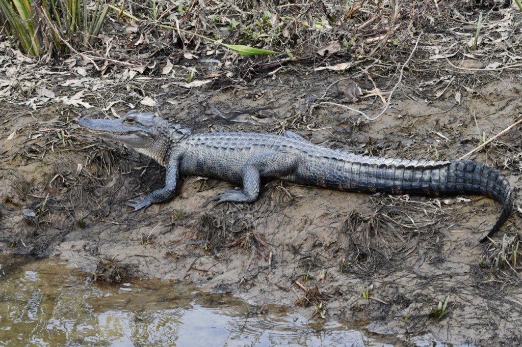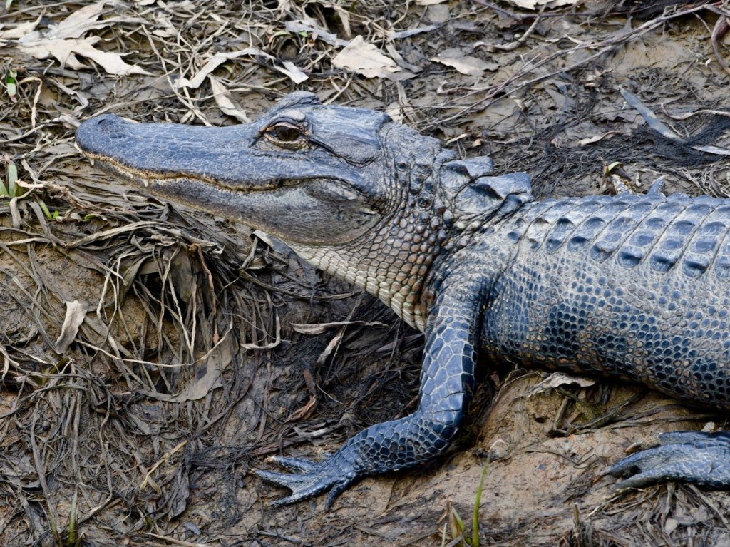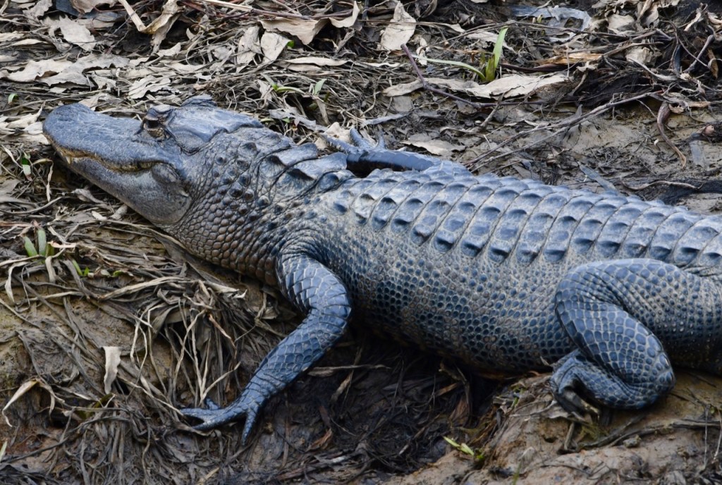 American alligators are large crocodilians found only in the United States. As a cold-blooded reptile, alligators undergo dormancy when the weather becomes cold. They are known to dig tunnels 65 feet (20 meters) long to protect themselves from extreme heat and cold.
