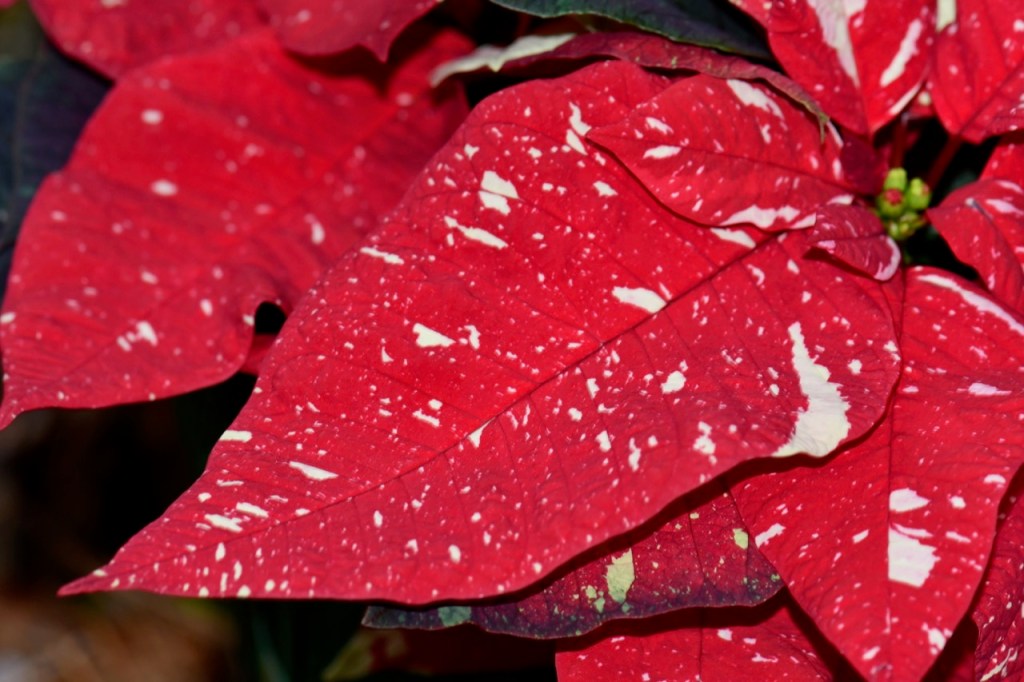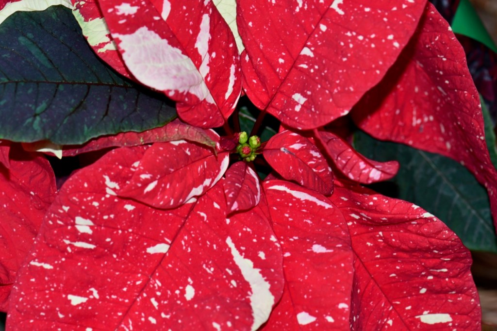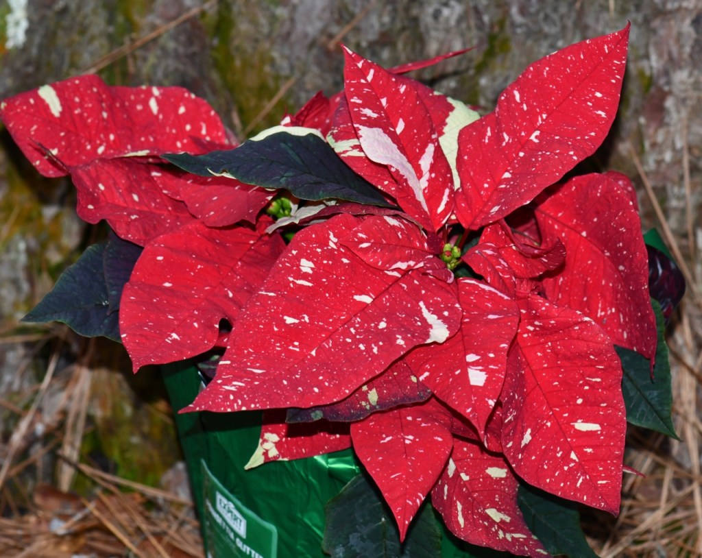 Red Glitter is a mid season novelty poinsettia with dark green leaves and horizontal bright red bracts w/ white flecks & markings..