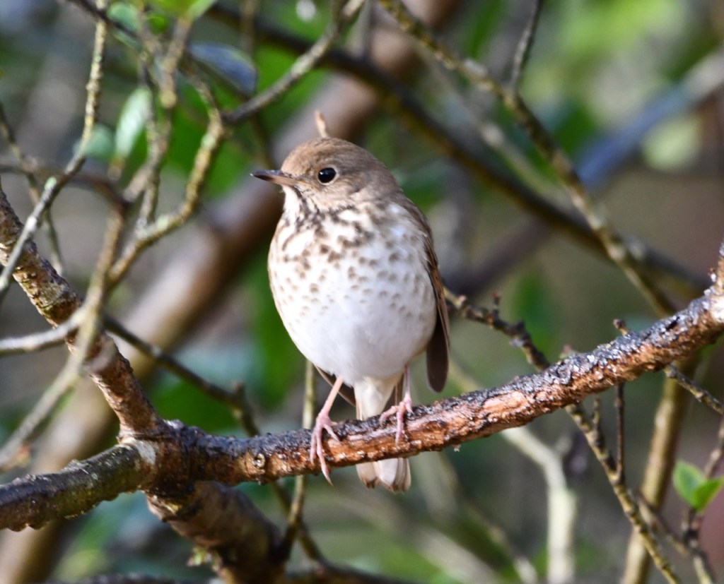 The Hermit Thrush is rich brown on the head and back, with a distinctly warm, reddish tail. The underparts are pale with distinct spots on the throat and smudged spots on the breast. With a close look you may see a thin pale eyering (not a bold one). https://www.allaboutbirds.org/guide/Hermit_Thrush/id