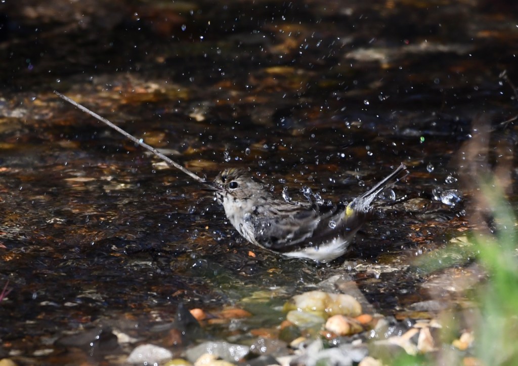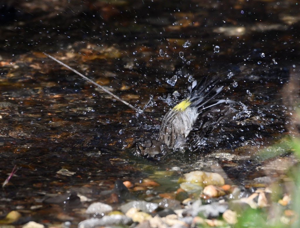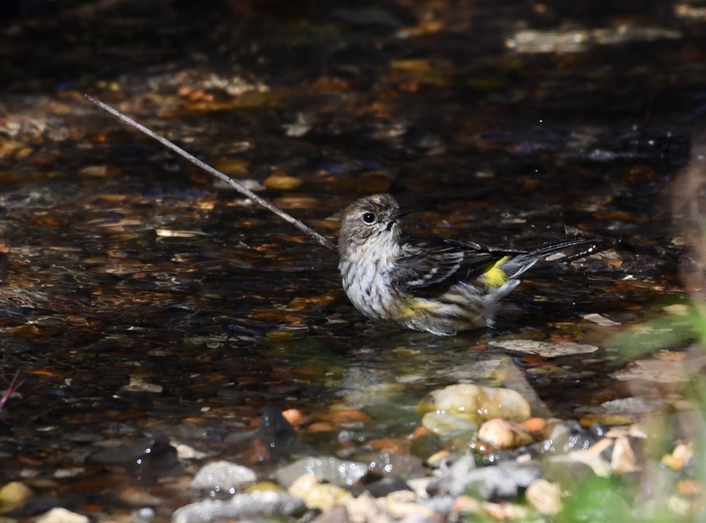 This Yellow-rumped Warbler is one of many wintering in my back yard. They enjoy taking a bath in the spring fed creek behind my house.