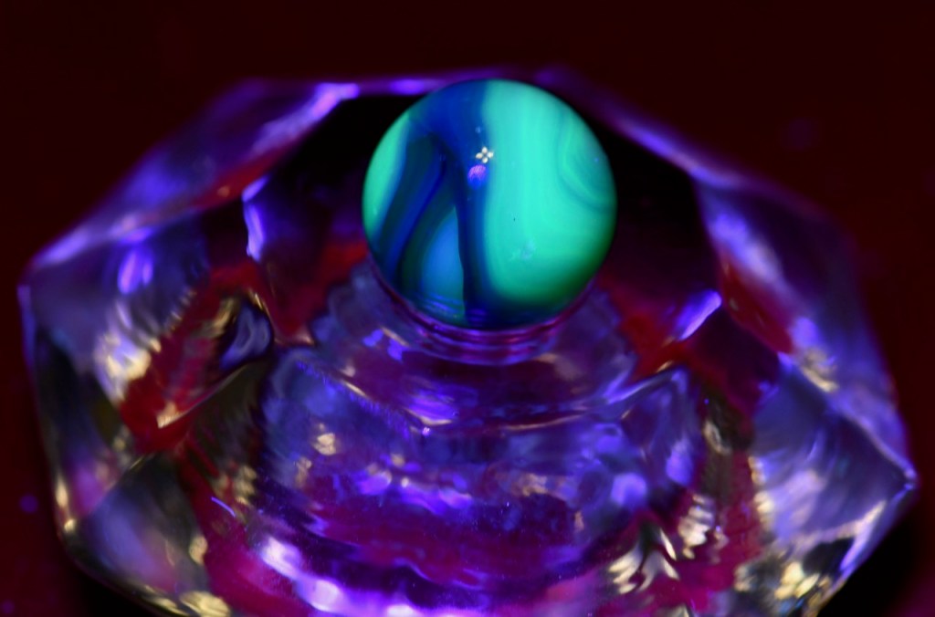 Because of the uranium content, these marbles glow bright green under ultraviolet light. The most typical color of uranium glass is pale yellowish-green, which in the 1930s led to the nickname Vaseline glass based on a perceived resemblance to the appearance (which was a yellow-green color) of Vaseline brand petroleum jelly as formulated and commercially sold at that time. Specialized collectors still define Vaseline glass as transparent or semi-transparent uranium glass in this specific color. https://stemcelltulsa.com/products/yellow-uranium-glass-ball