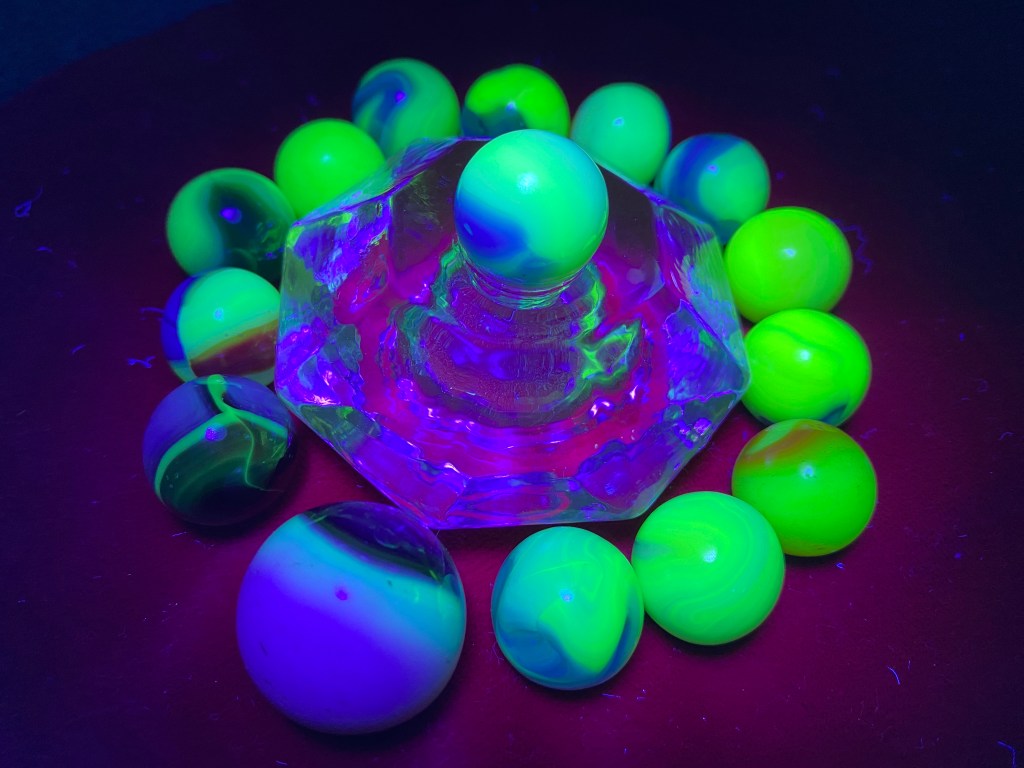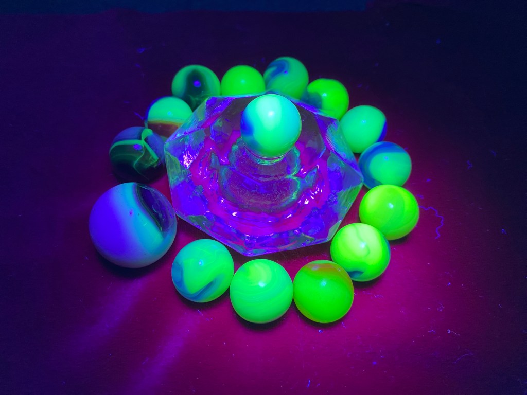 Marbles Glowing Green lisacomerphotosFebruary 28, 2023Featured Post navigation PreviousNext Glass mixed with Uranium Oxide will fluoresce yellow-green under a UV light. Share this: Click to share on X (Opens in new window) X Click to share on Facebook (Opens in new window) Facebook Like Loading... Related