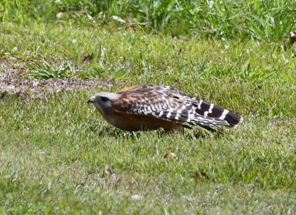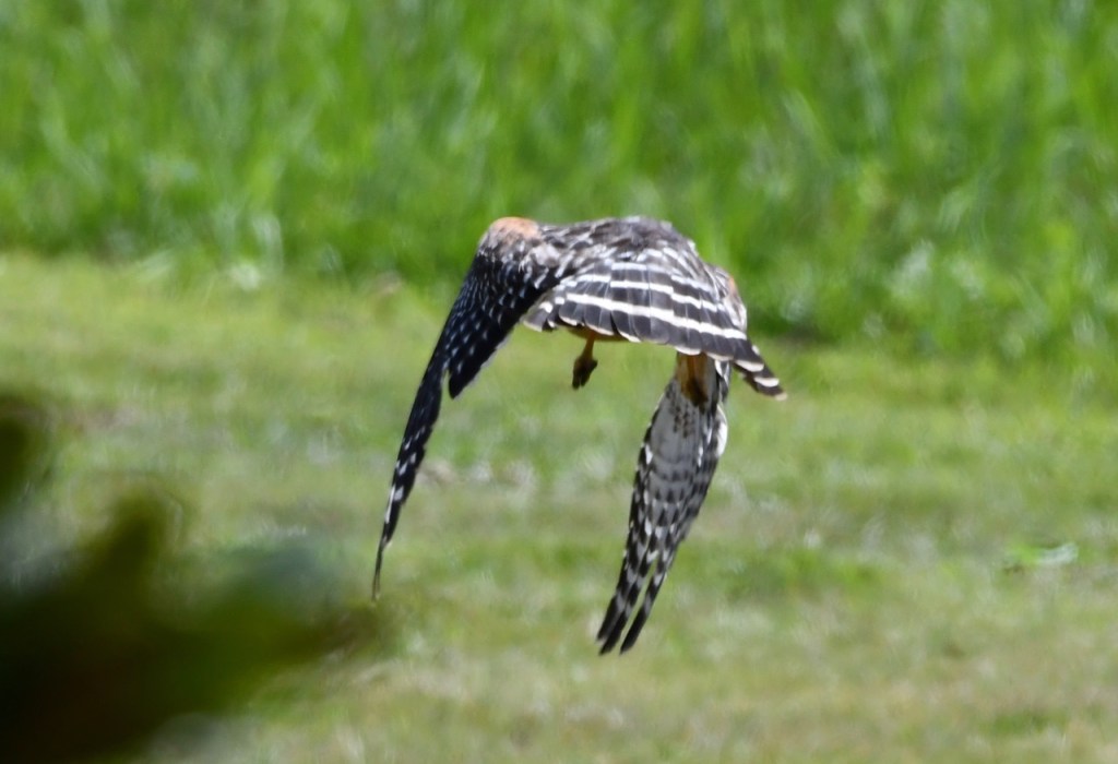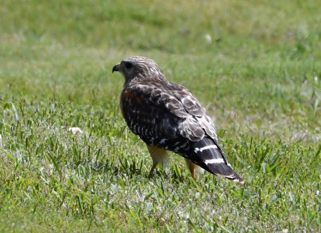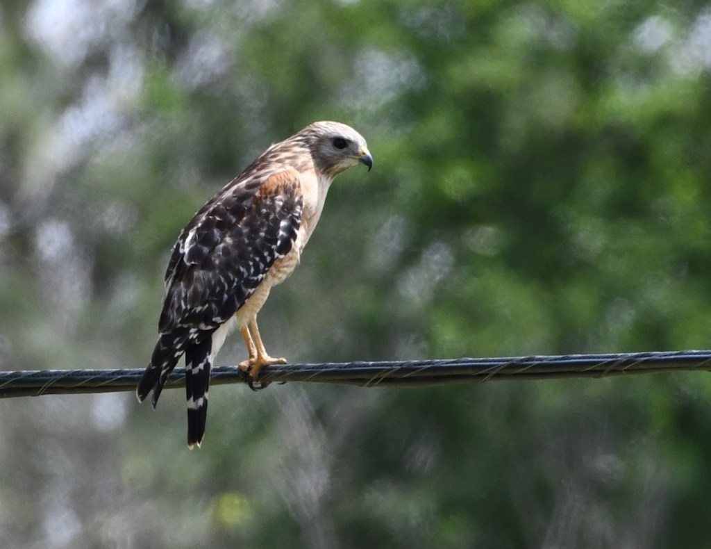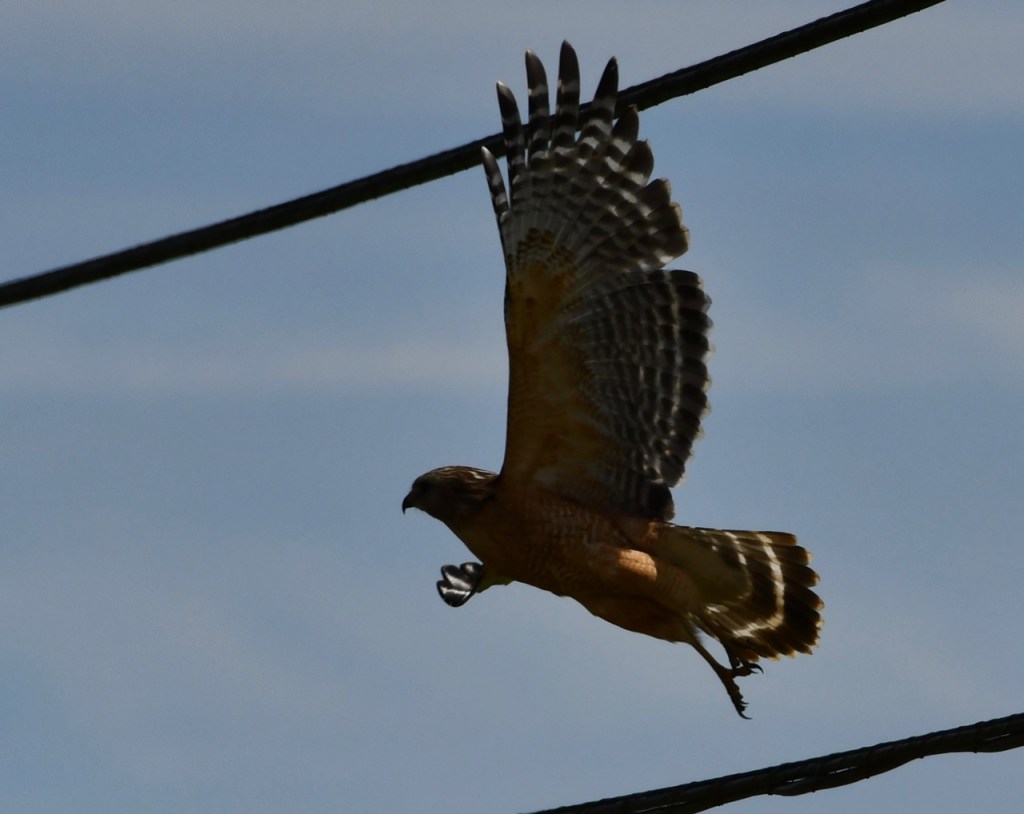 Red-shouldered Hawks are one of our most distinctively marked common hawks, with barred reddish-peachy underparts and a strongly banded tail. https://www.allaboutbirds.org/guide/Red-shouldered_Hawk/overview