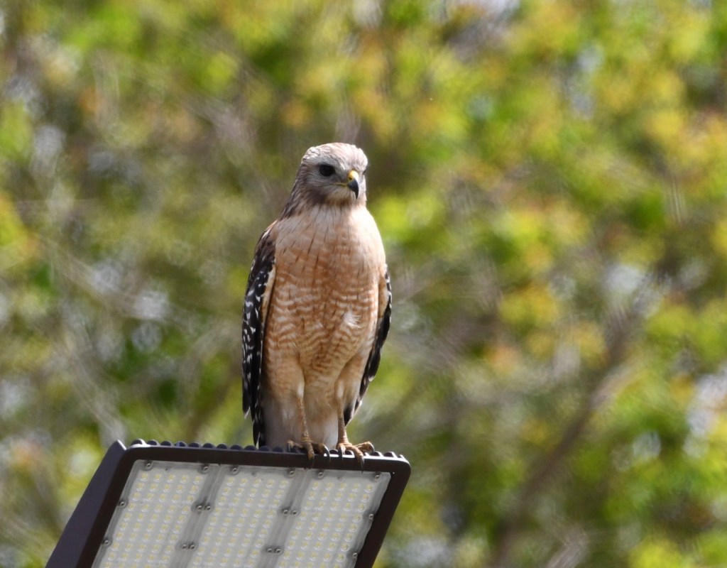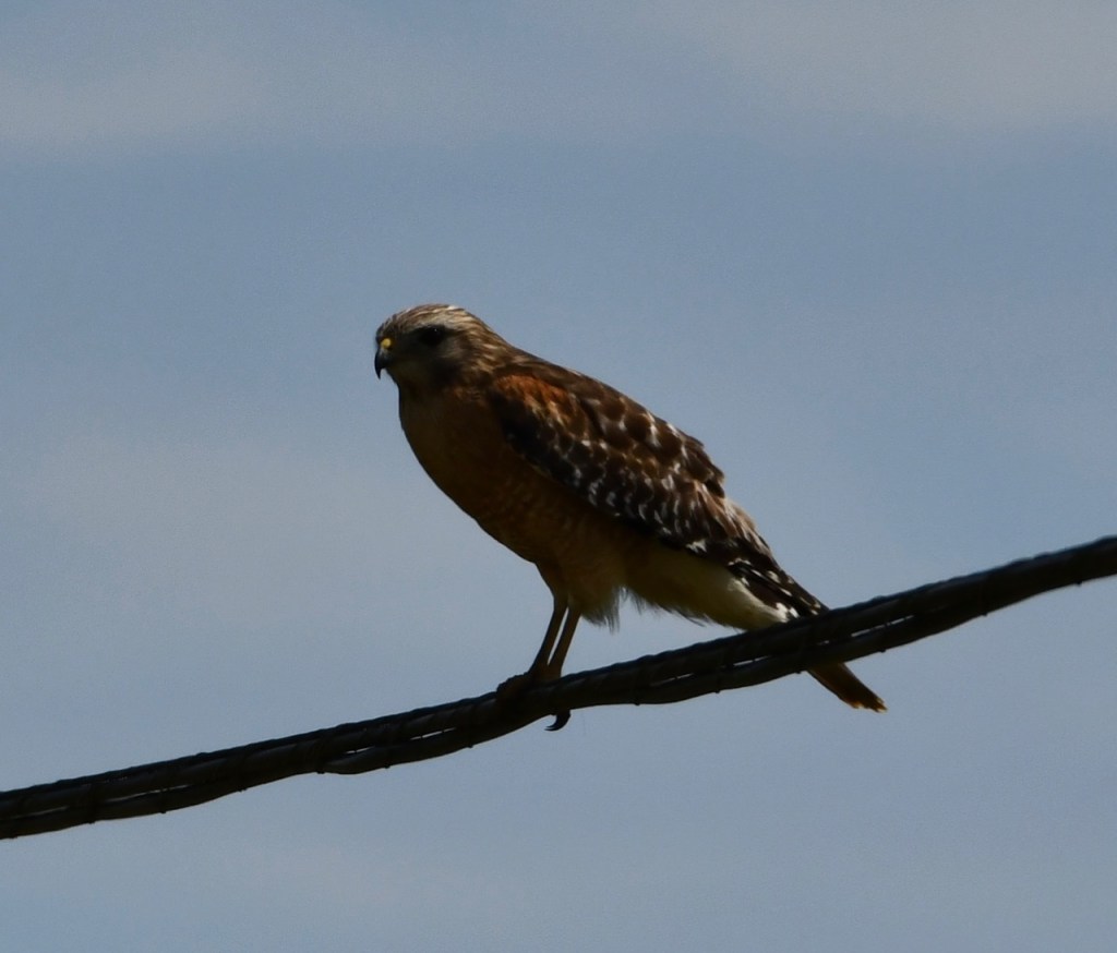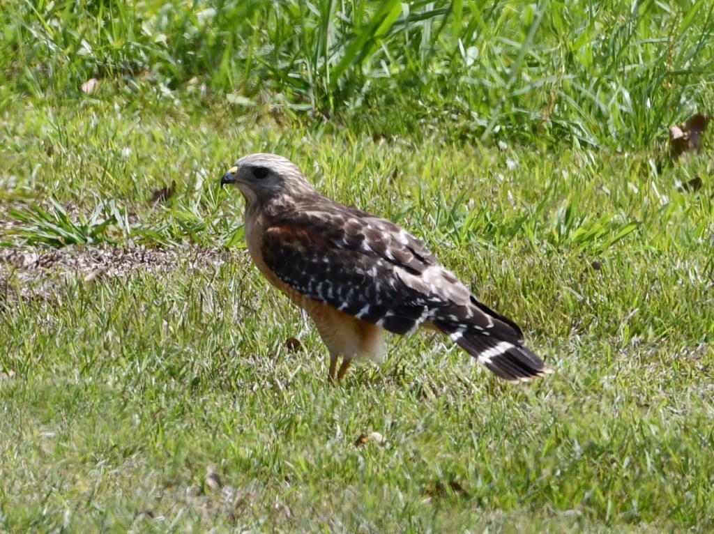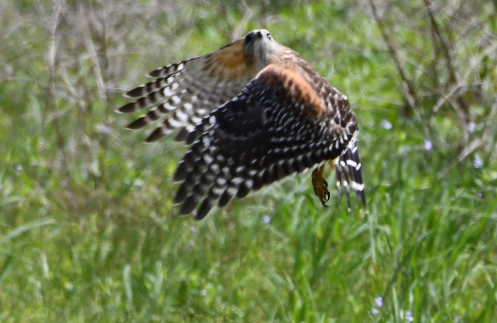 Red-shouldered Hawks are one of our most distinctively marked common hawks, with barred reddish-peachy underparts and a strongly banded tail. https://www.allaboutbirds.org/guide/Red-shouldered_Hawk/overview