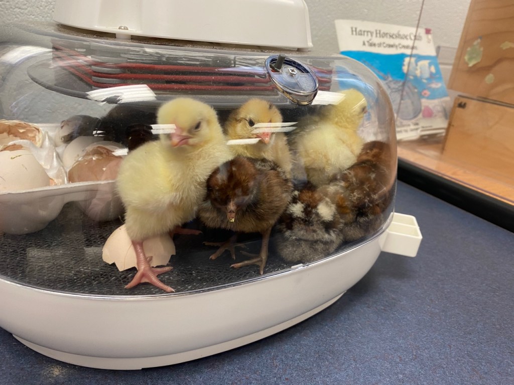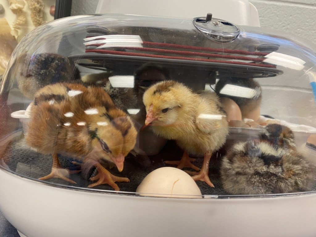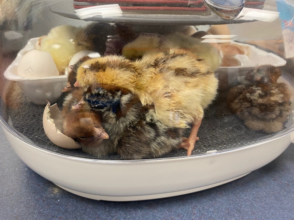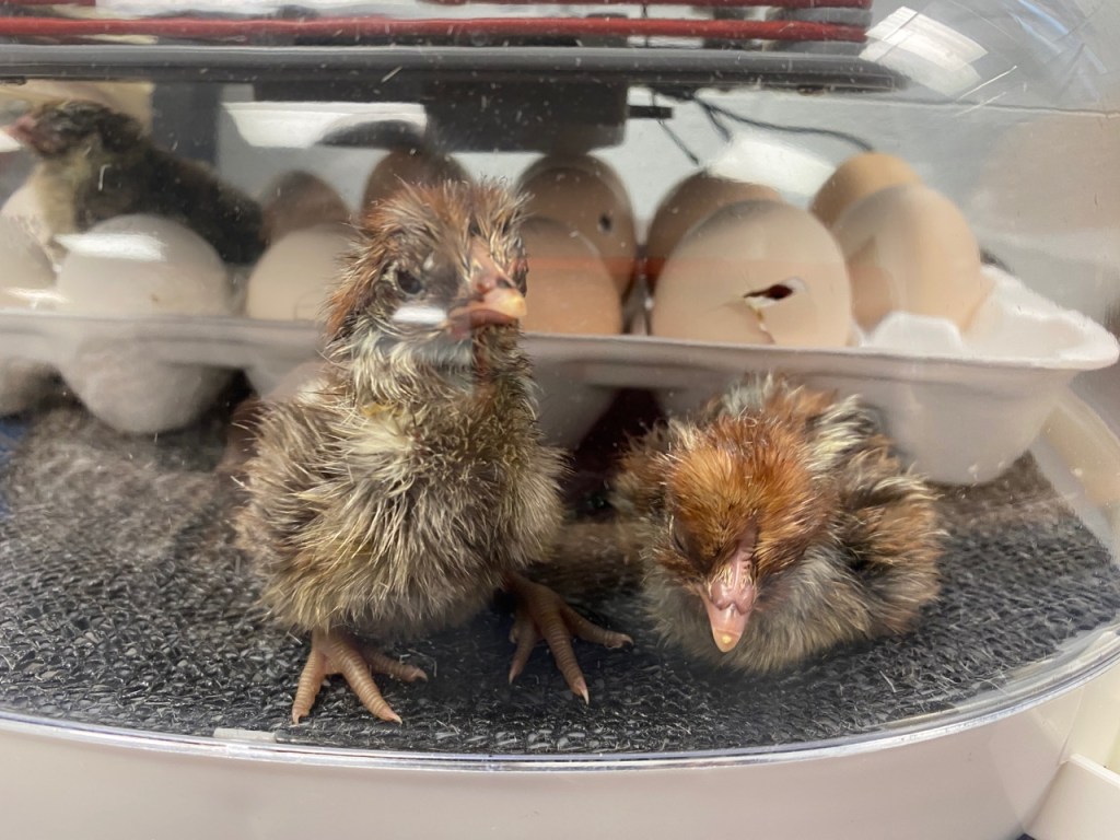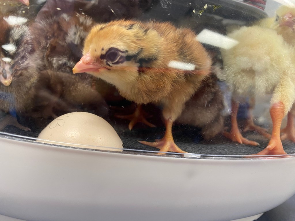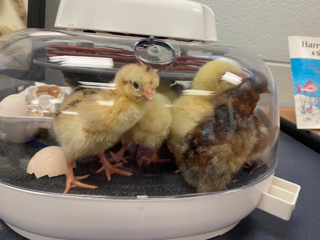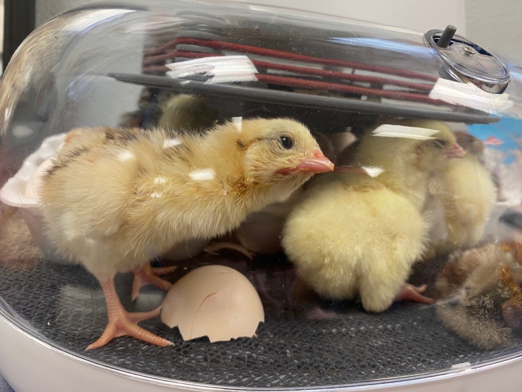 Eggs and incubator were brought to my school by A & B Homestead. 3 types of chicken eggs were being incubated in a Harris Farms Nurture Right 360: Egyptian Fayoumis, Brown Indio Gigante, and White French Bresse. The eggs were incubated and rotated for 18 days. On the last 3 days, the incubator went into lock down to allow the chickens to hatch. The incubator could not be opened during that time so that the egg membrane didn’t dry out and shrink wrap the chick. If that happens, the chicken can’t move and hatch out of the egg. The first hole in the egg is called a “pip.” The chick will rest and then make a zip, a line opening around the top of the egg. It was a lot of fun to watch the chicks fall asleep, wake up, and then move all around the incubator. After 21 days, the chicks are ready to be removed and moved to a new home.Egyptian Fayoumis ChickensChicks need to rest after they hatch.White French Bresse ChickensIndio Gigante Chicken