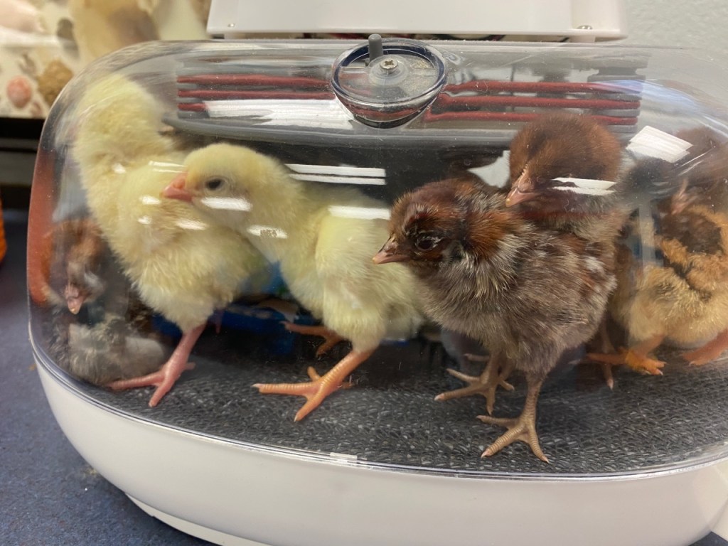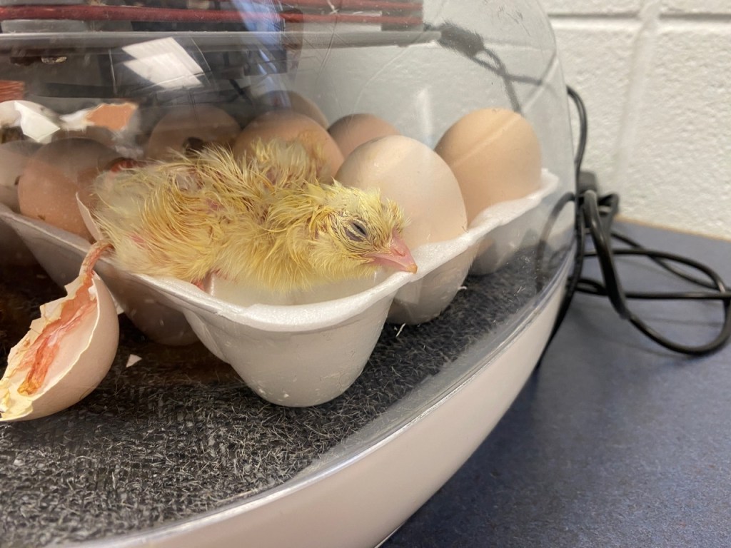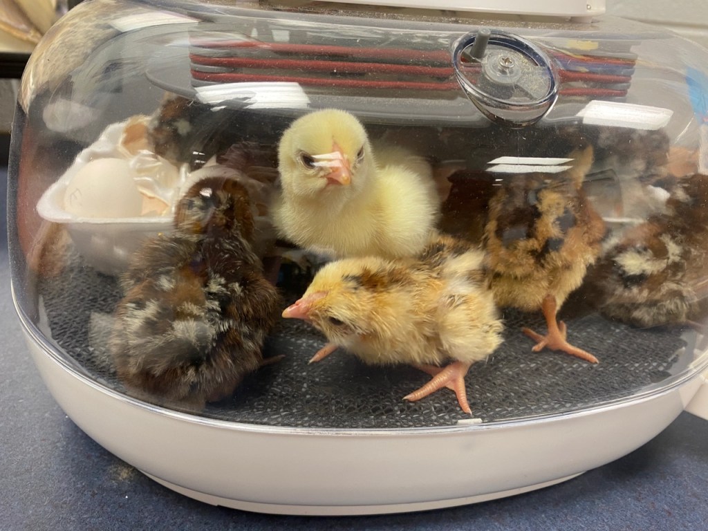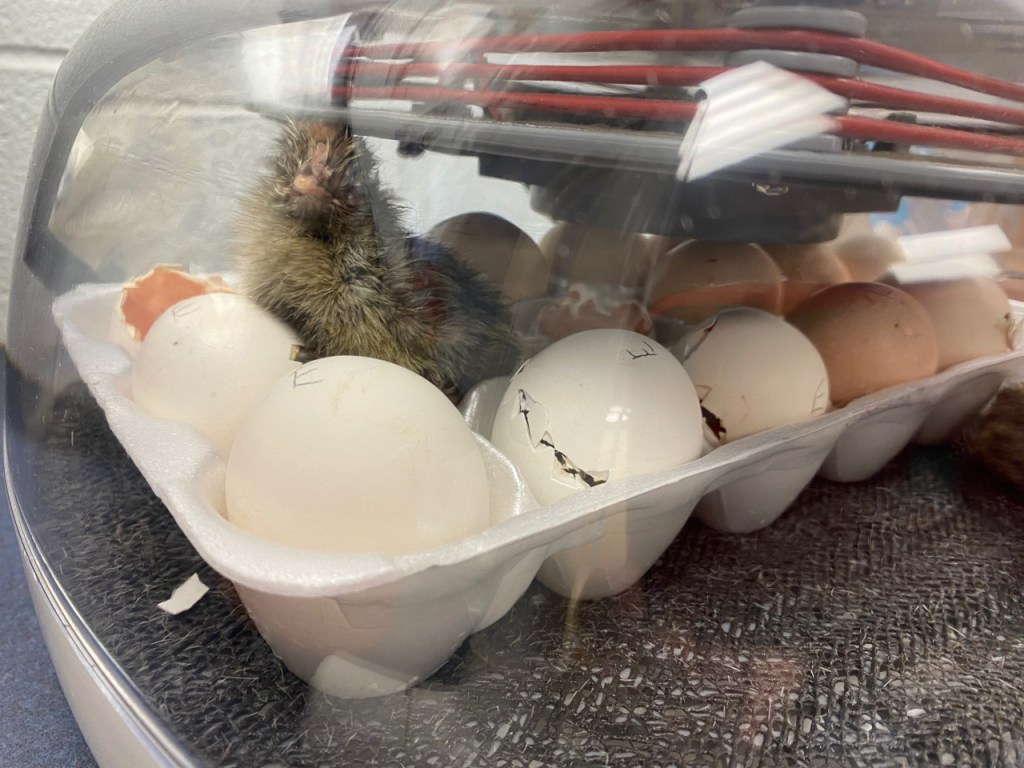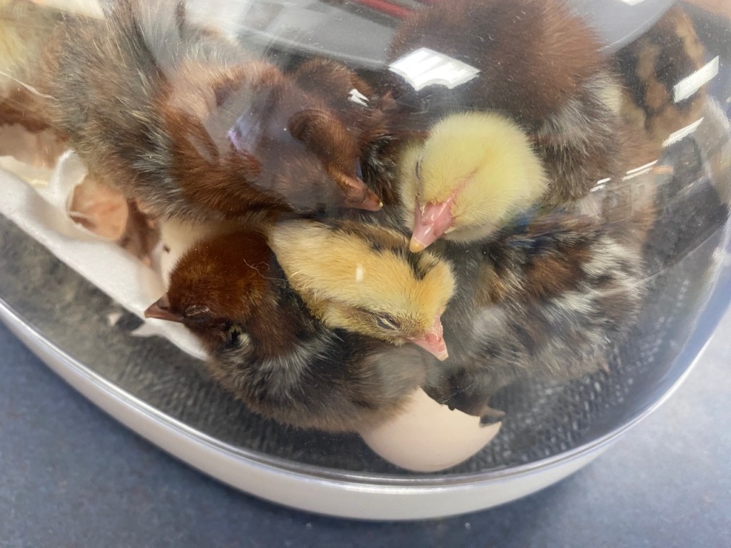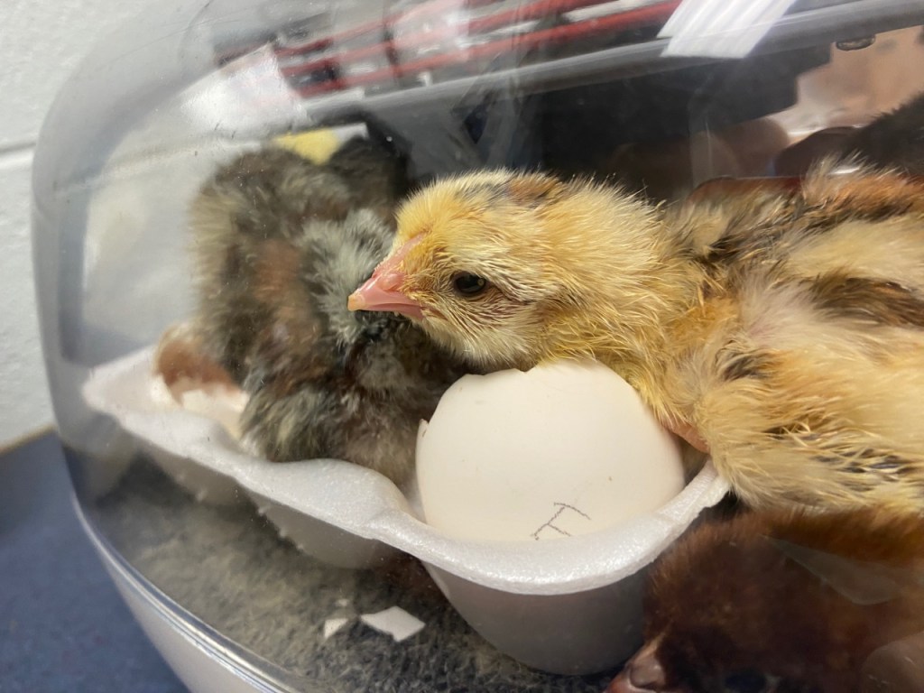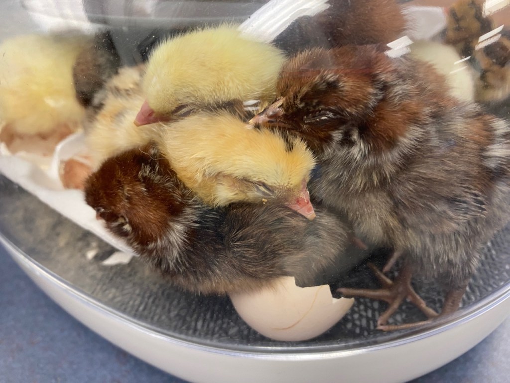 Eggs and incubator were brought to my school by A & B Homestead. 3 types of chicken eggs were being incubated in a Harris Farms Nurture Right 360: Egyptian Fayoumis, Brown Indio Gigante, and White French Bresse. The eggs were incubated and rotated for 18 days. On the last 3 days, the incubator went into lock down to allow the chickens to hatch. The incubator could not be opened during that time so that the egg membrane didn’t dry out and shrink wrap the chick. If that happens, the chicken can’t move and hatch out of the egg. The first hole in the egg is called a “pip.” The chick will rest and then make a zip, a line opening around the top of the egg. It was a lot of fun to watch the chicks fall asleep, wake up, and then move all around the incubator. After 21 days, the chicks are ready to be removed and moved to a new home.Egyptian Fayoumis ChickensChicks need to rest after they hatch.White French Bresse ChickensIndio Gigante Chicken