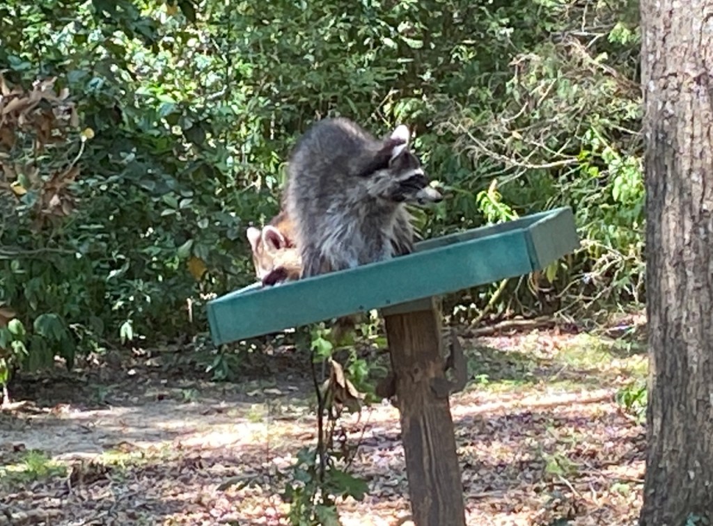 I’ve seen these two raccoons visit my bird feeders separately, but today they happily shared and visited together. No wonder my bird feed is always gone when I go to check the feeders.