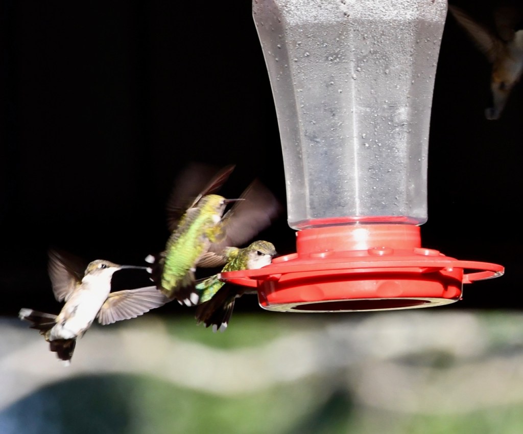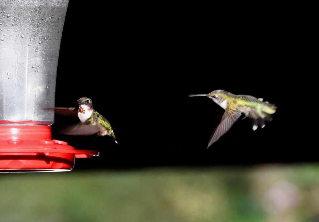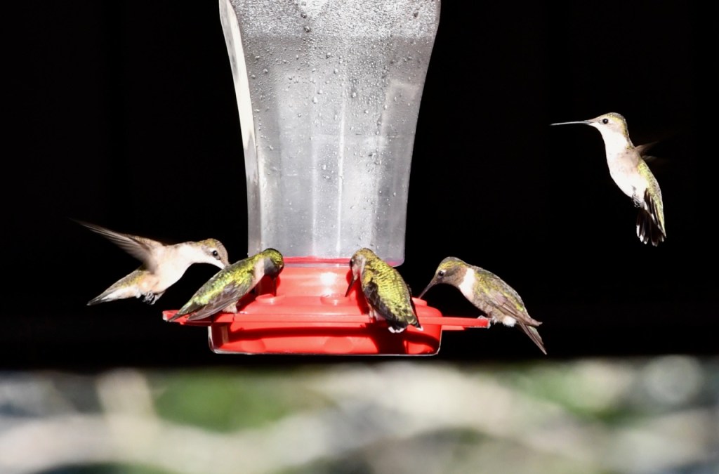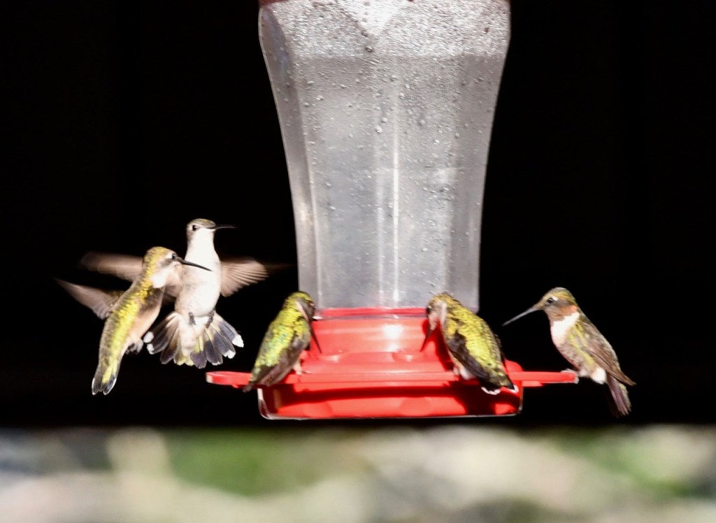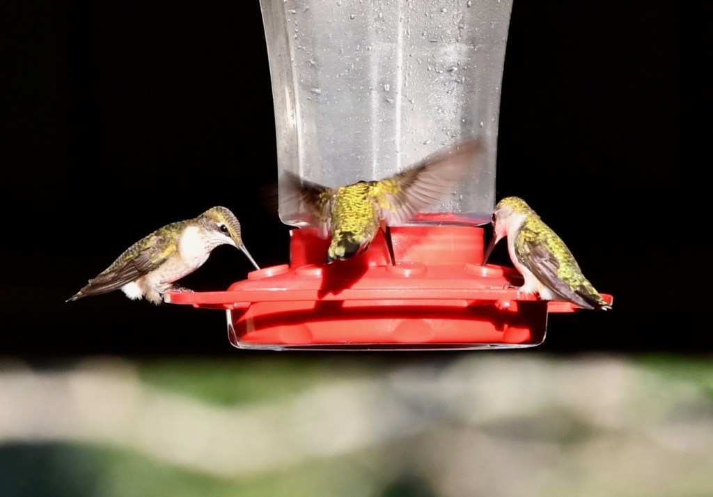 My mother’s neighbor hangs about 7 hummingbird feeders in their yard during migration. It is always fun to stand at the edge of my mom’s yard and watch all the Ruby-throated Hummingbirds flying from feeder to feeder. I live just 2 miles down the road, but I never see this many hummingbirds on my feeders.