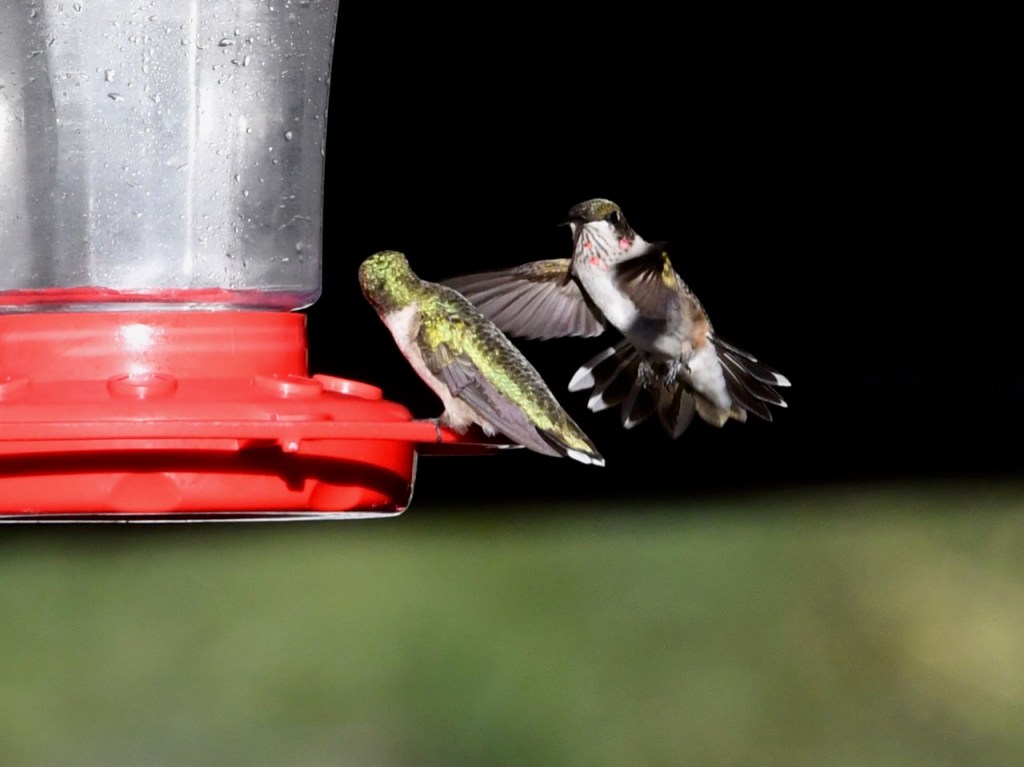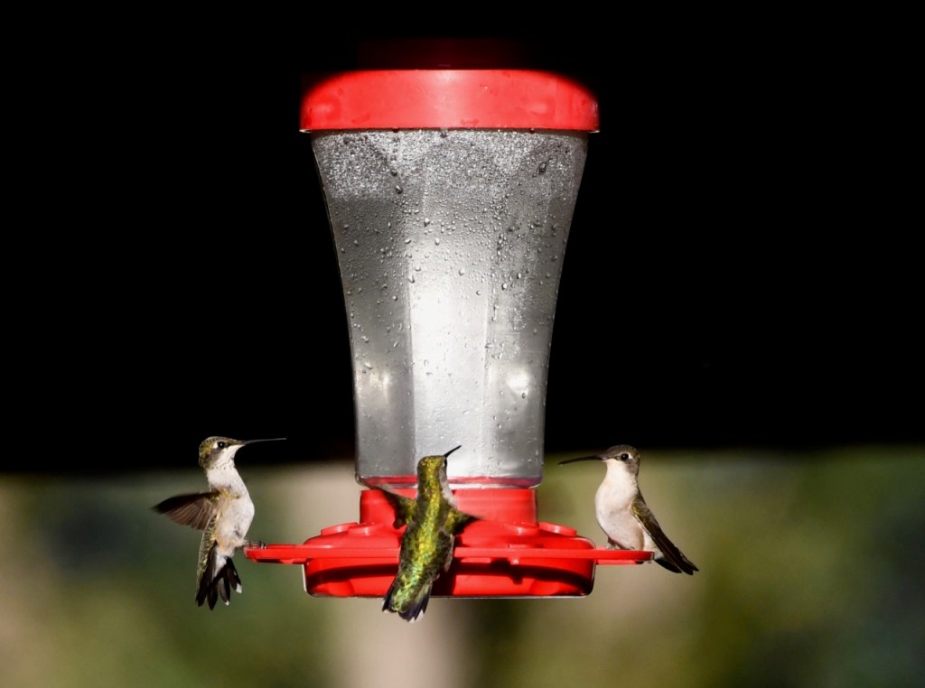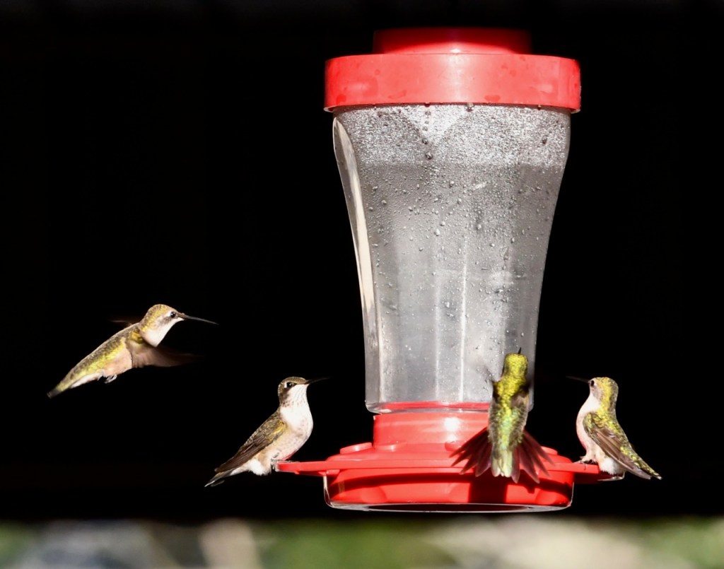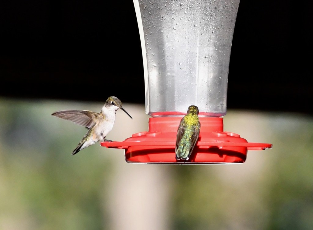 My mother’s neighbor hangs about 7 hummingbird feeders in their yard during migration. It is always fun to stand at the edge of my mom’s yard and watch all the Ruby-throated Hummingbirds flying from feeder to feeder. I live just 2 miles down the road, but I never see this many hummingbirds on my feeders.