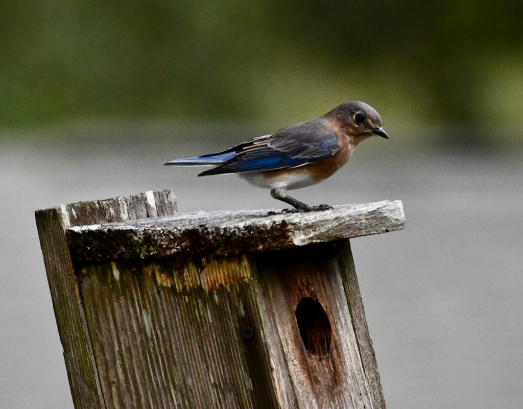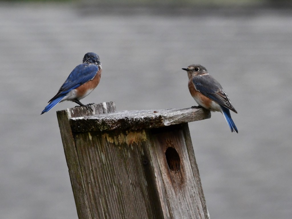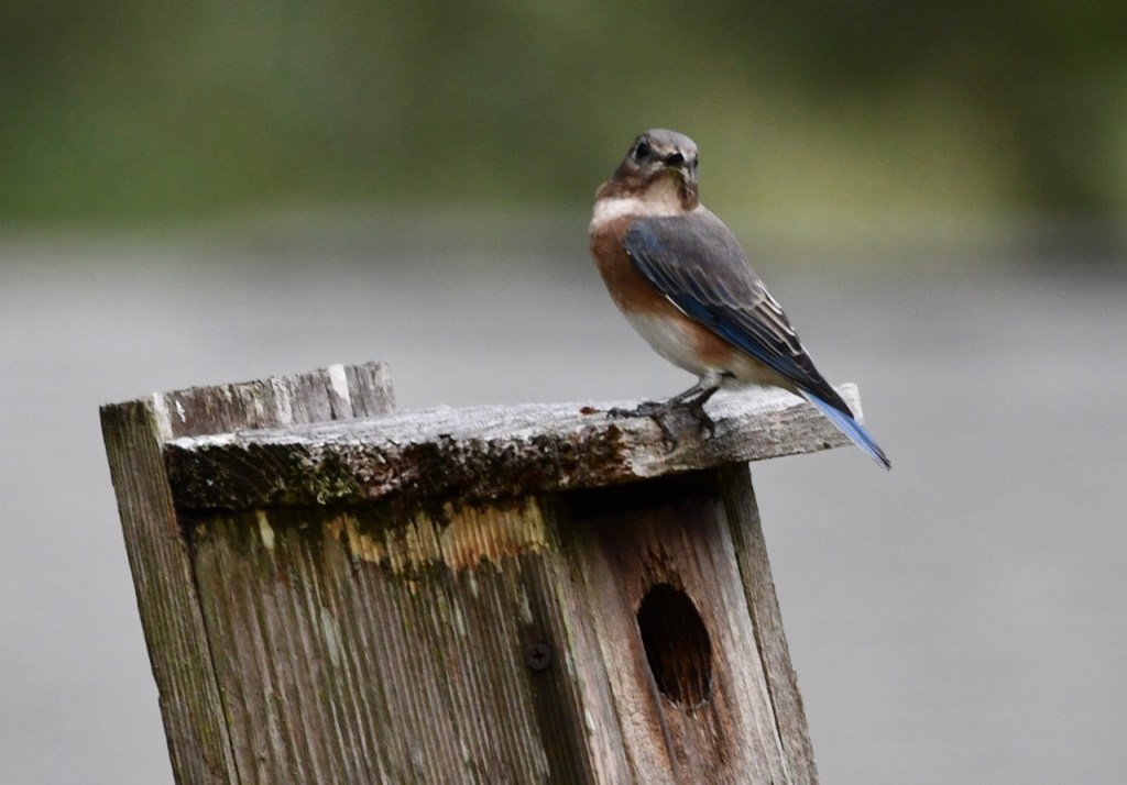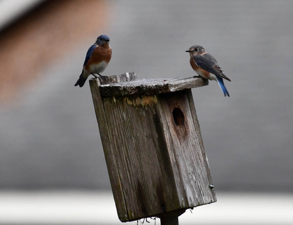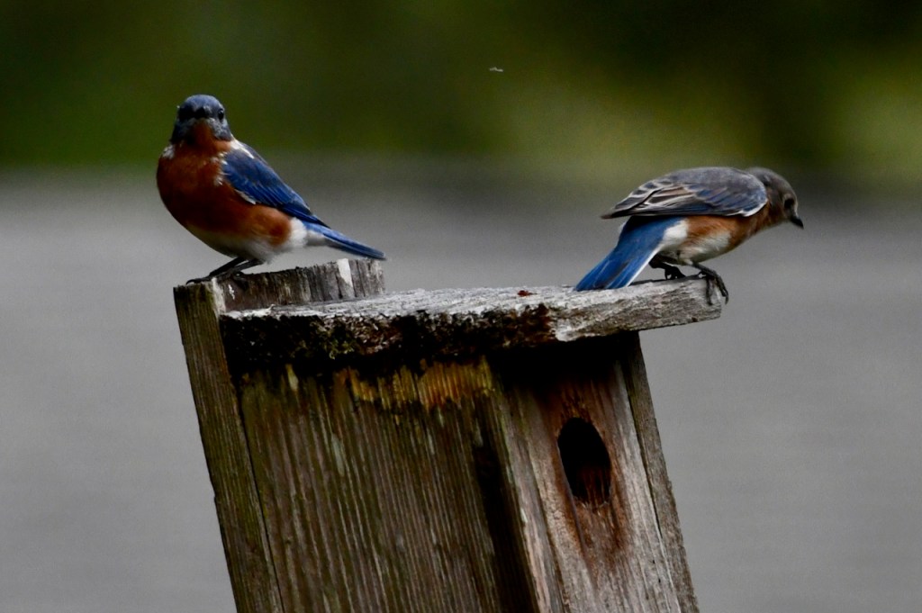 I noticed 2 Bluebirds sitting on top of the Bluebird house when I arrived home tonight. They look like juvenile birds. After a few minutes, a 3rd Bluebird flew down and chased the 2 away.
