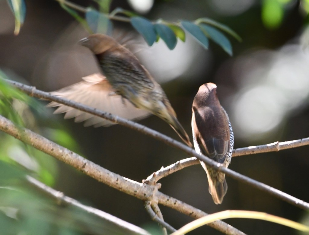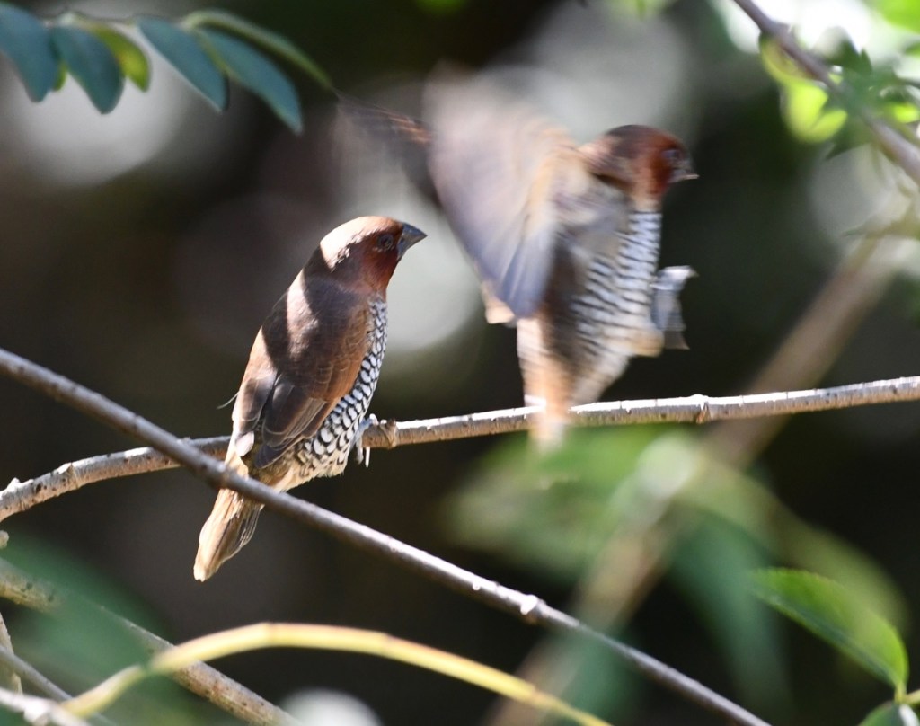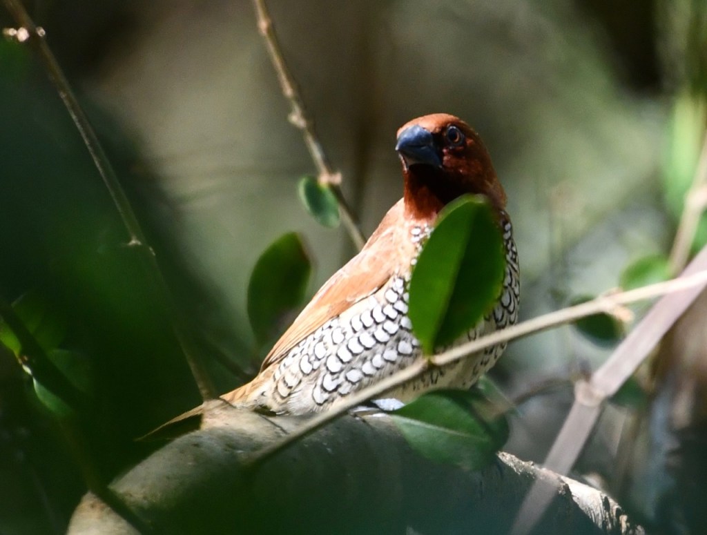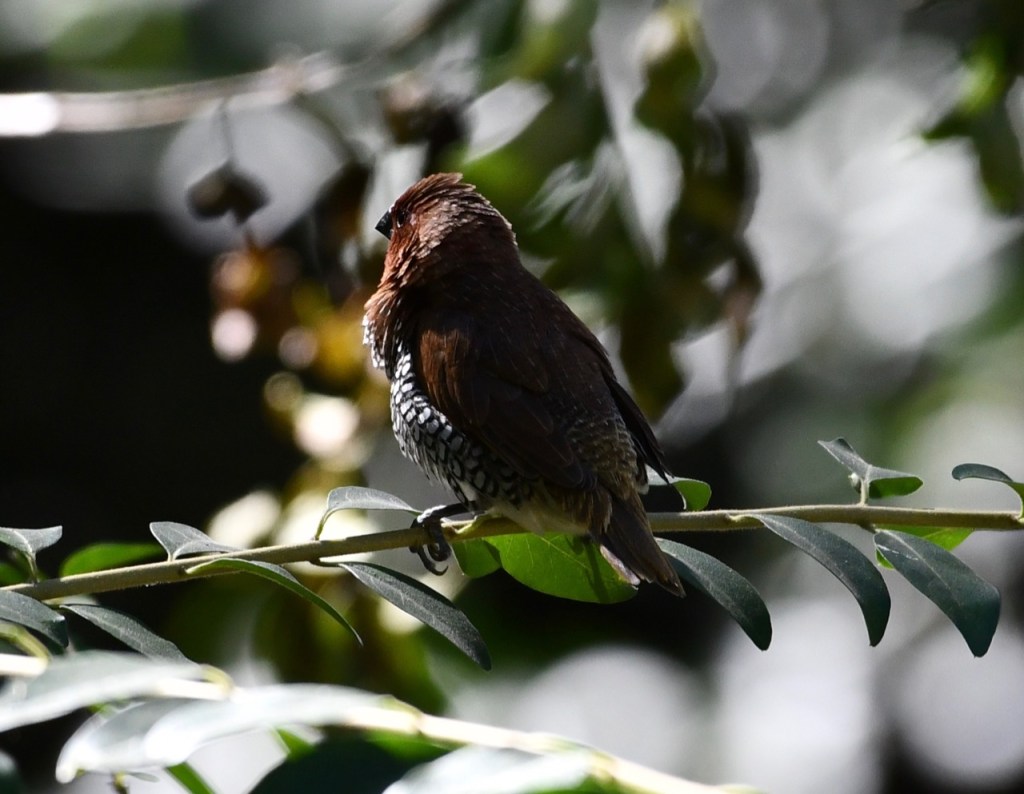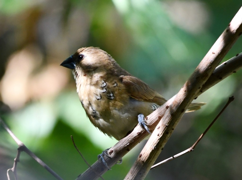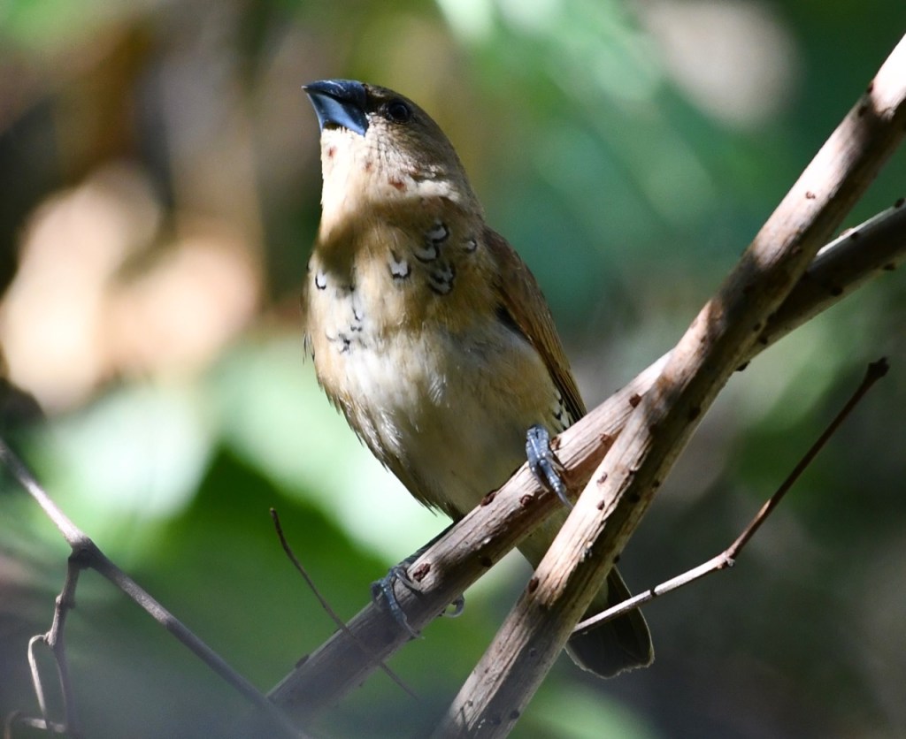 The scaly-breasted munia or spotted munia, known in the pet trade as nutmeg mannikin or spice finch, is a sparrow-sized estrildid finch native to tropical Asia. https://en.wikipedia.org/wiki/Scaly-breasted_munia