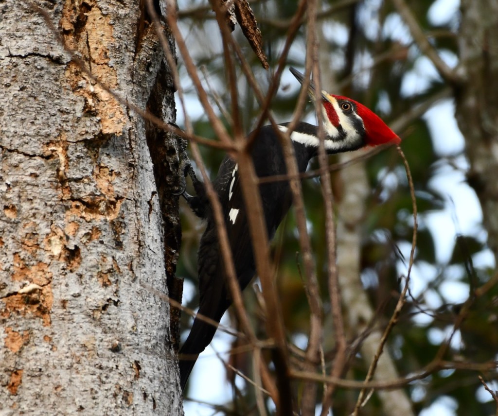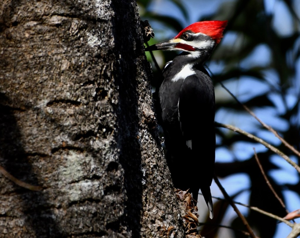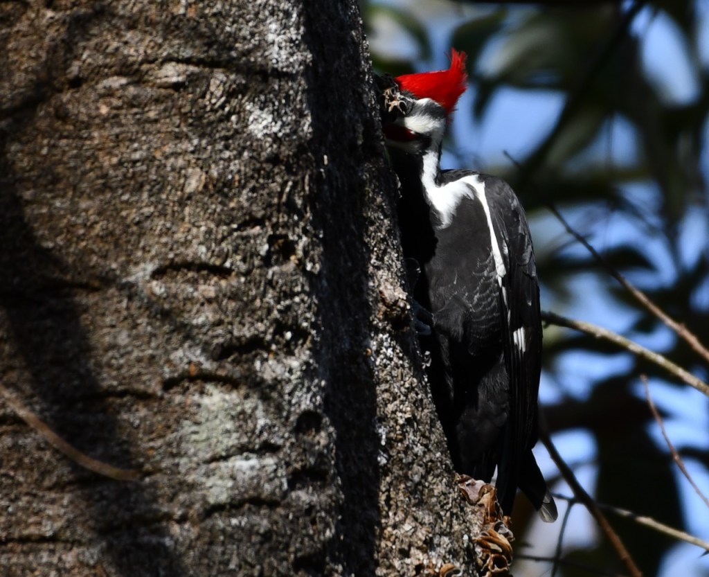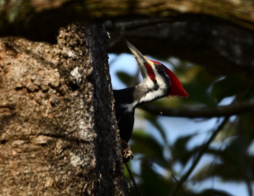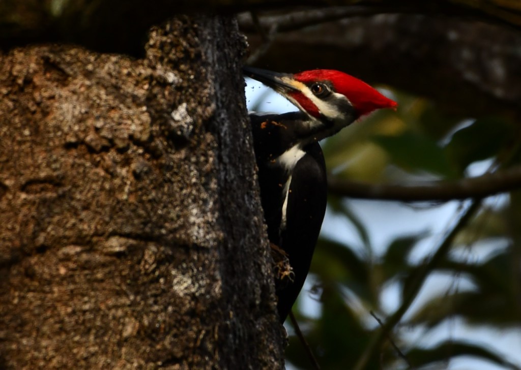 This pair of Pileated Woodpeckers must live close to my neighborhood. I see or hear them at least once a week. I was very lucky that they came into my yard and I could get close for some photos. Pileated Woodpeckers are the biggest woodpecker. They are about the size of a crow. I love the red stripe on the male woodpecker’s cheek. The female has a black stripe. Both have the red crest.