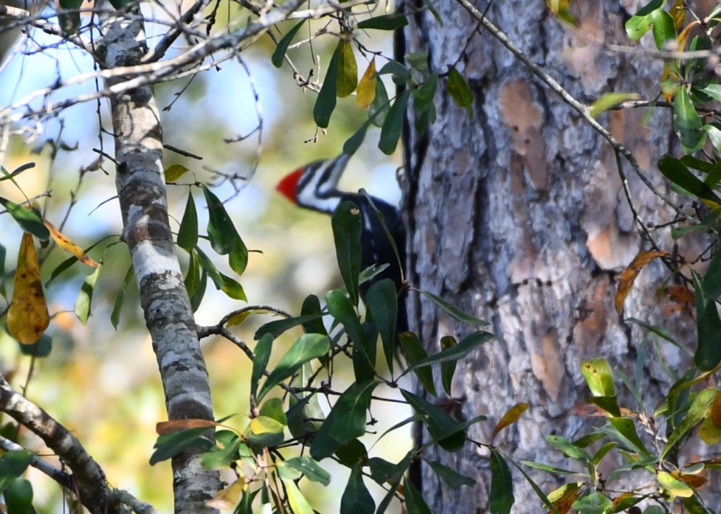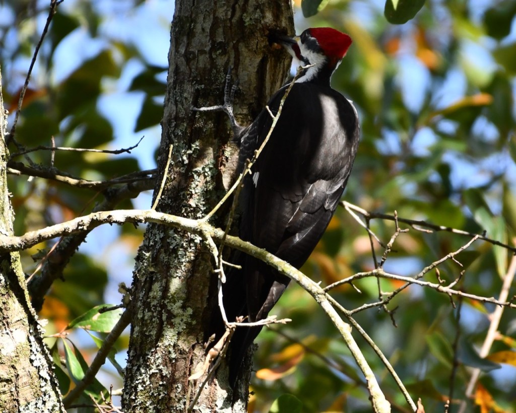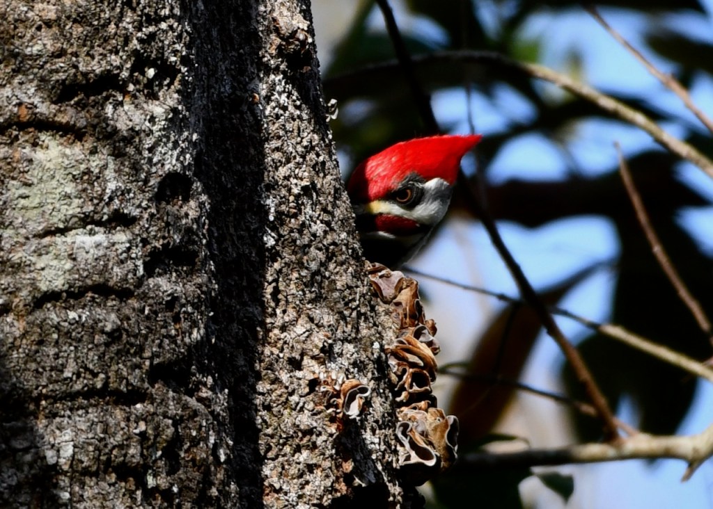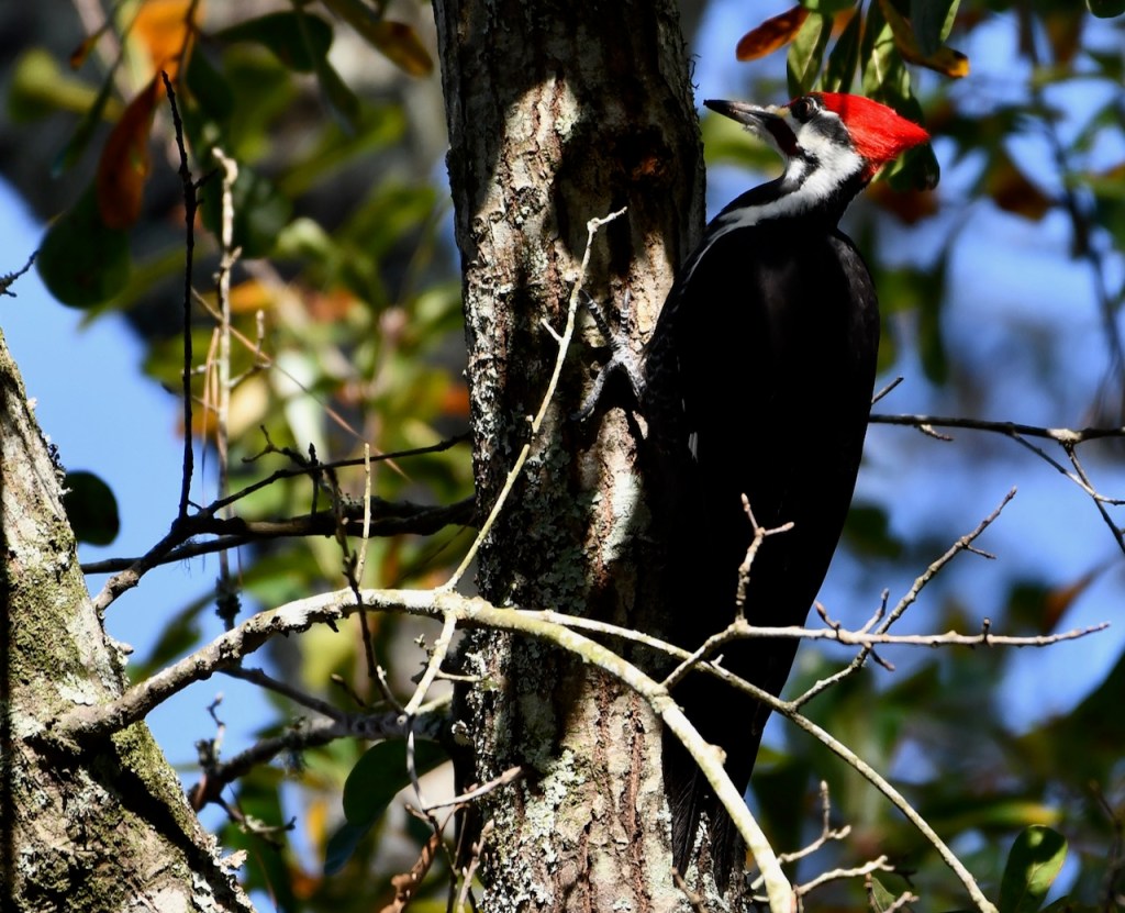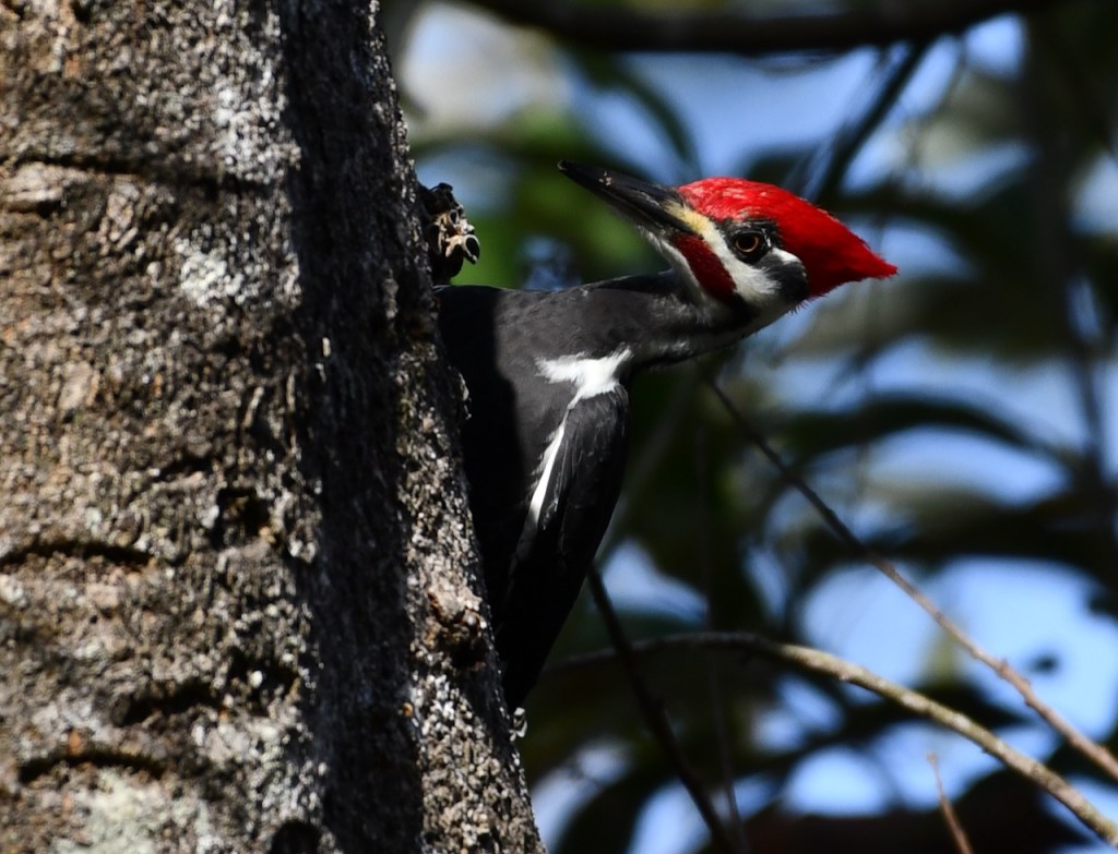 This pair of Pileated Woodpeckers must live close to my neighborhood. I see or hear them at least once a week. I was very lucky that they came into my yard and I could get close for some photos. Pileated Woodpeckers are the biggest woodpecker. They are about the size of a crow. I love the red stripe on the male woodpecker’s cheek. The female has a black stripe. Both have the red crest.
