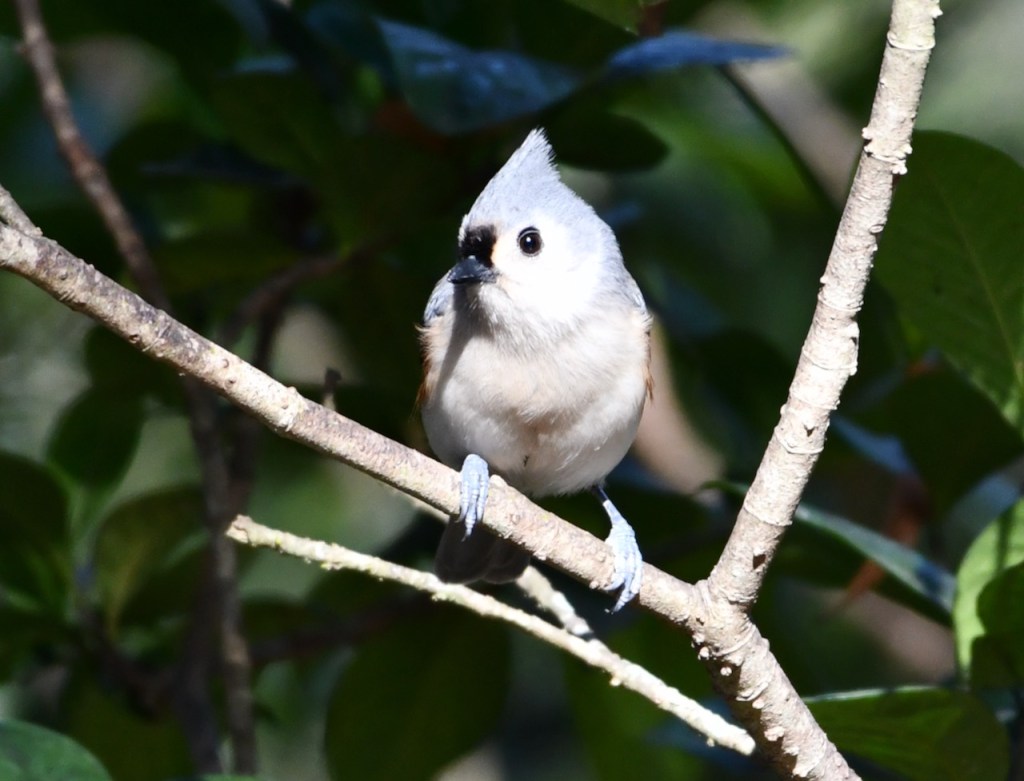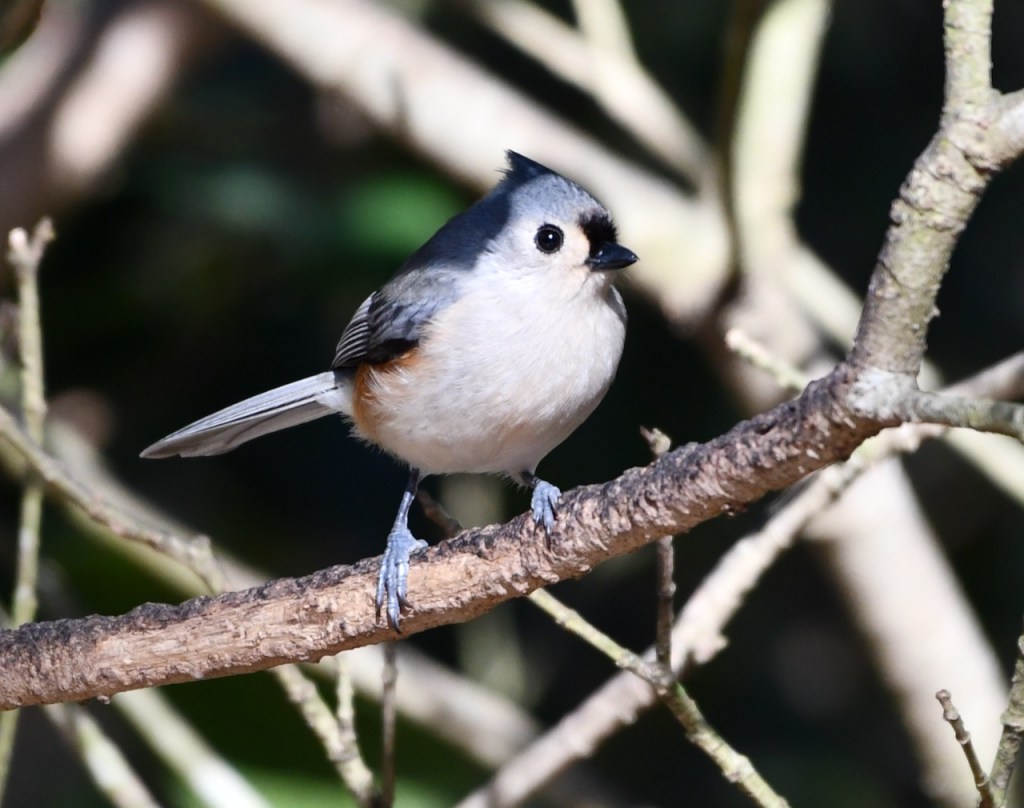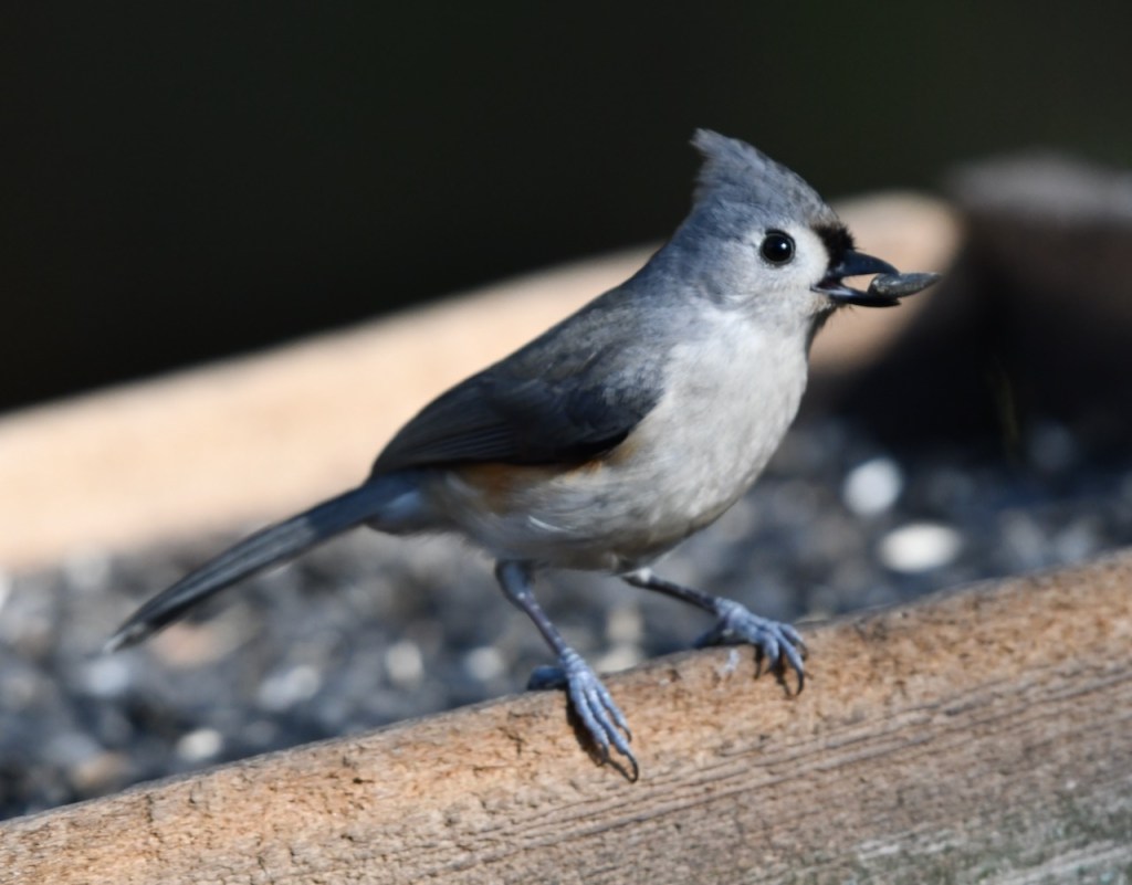 This rather tame, active, crested little bird is common all year in eastern forests, where its whistled peter-peter-peter song may be heard even during mid-winter thaws. It is related to the chickadees, and like them it readily comes to bird feeders, often carrying away sunflower seeds one at a time. https://www.audubon.org/field-guide/bird/tufted-titmouse