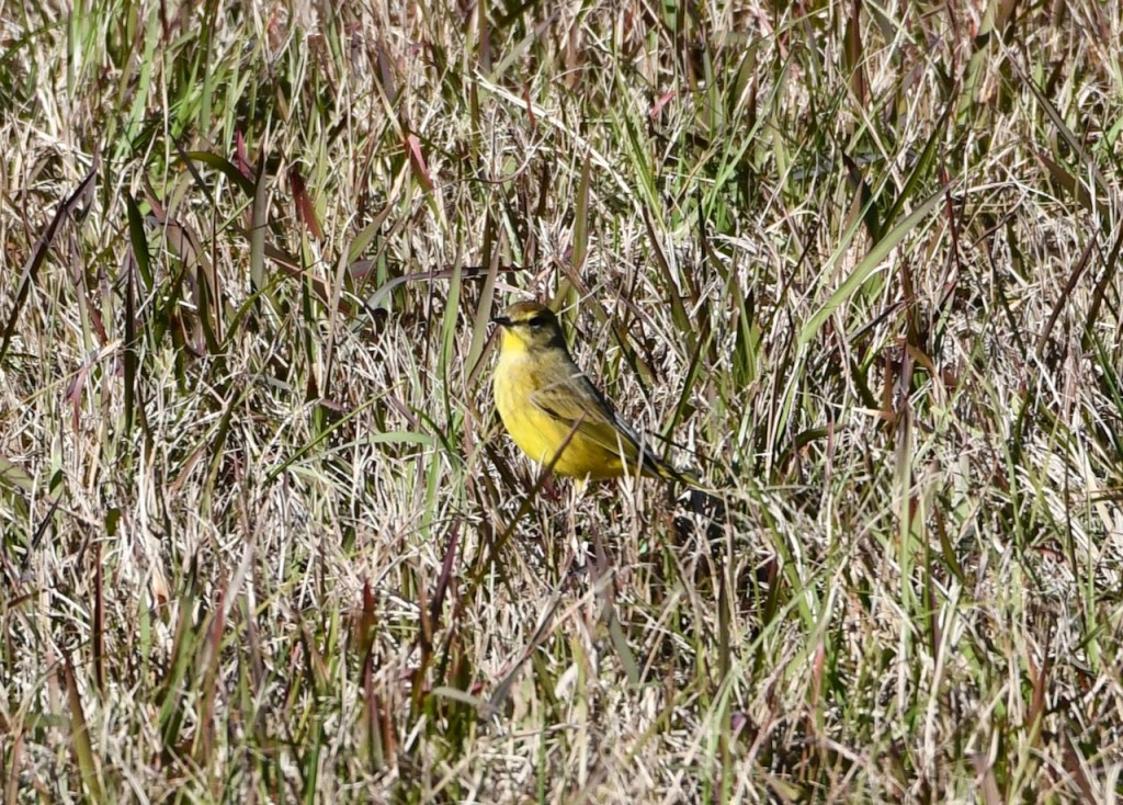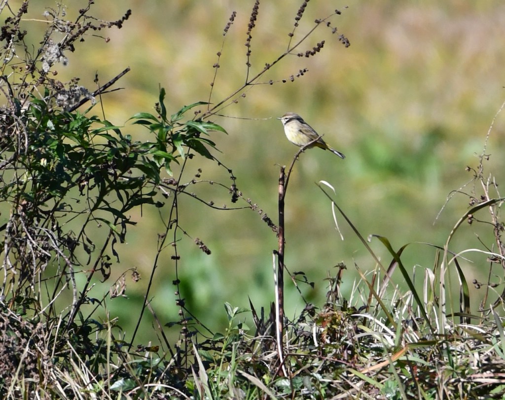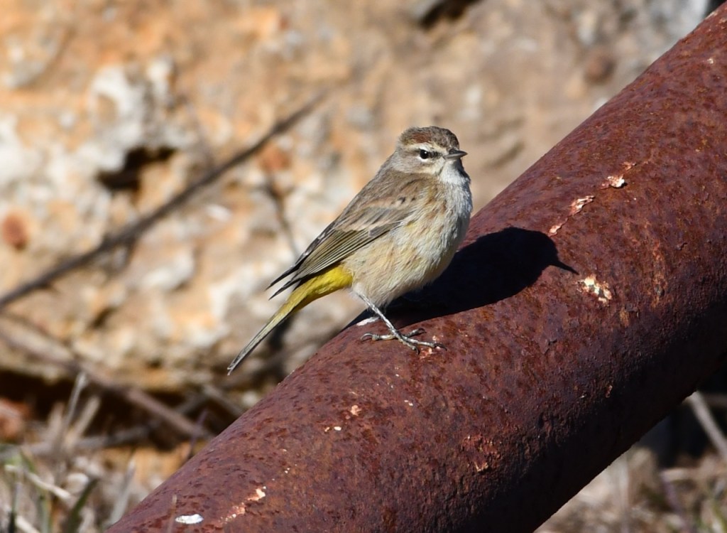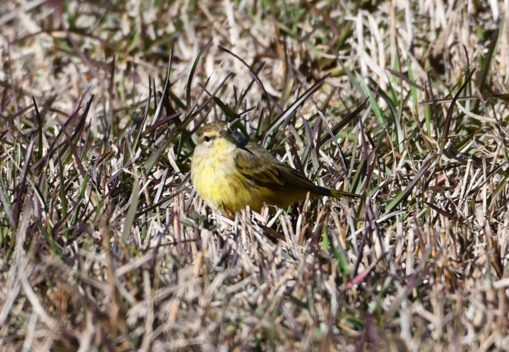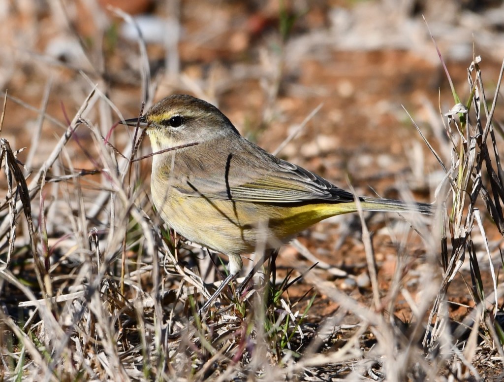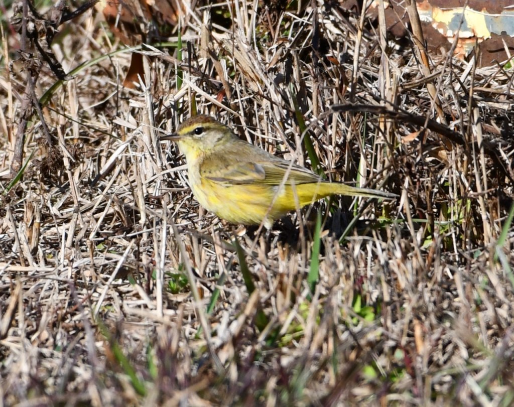I spotted these Palm Warblers on the hillside at the Magnolia Landfill. They were doing exactly what the field guide above said they would be doing.
