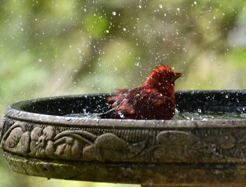 My birdbath is great for bringing hard to spot birds out in the open. The only trouble is that it is usually in the afternoon when the sun is behind the birds and the bird is in silhouette. I was able to get a little better light on this Scarlet Tanager so that you can see the beautiful colors and darker wings.