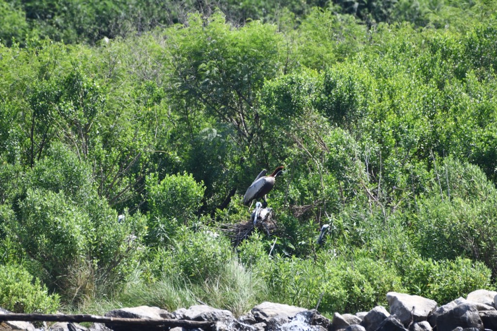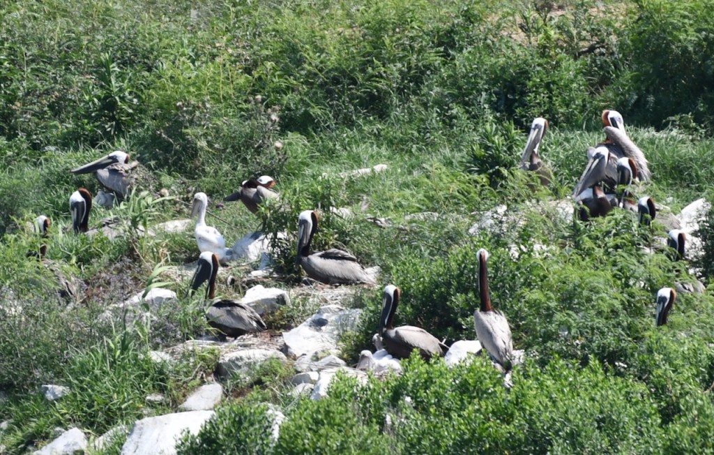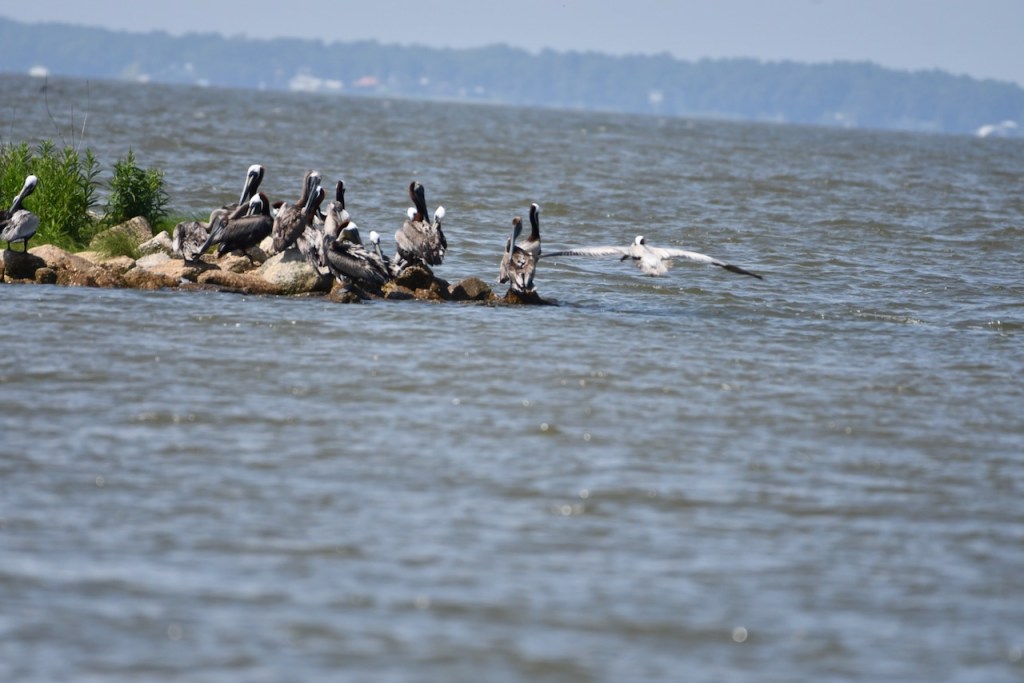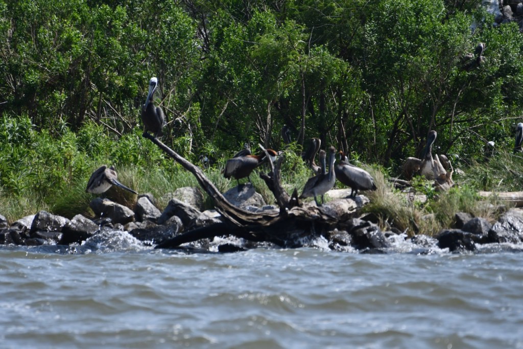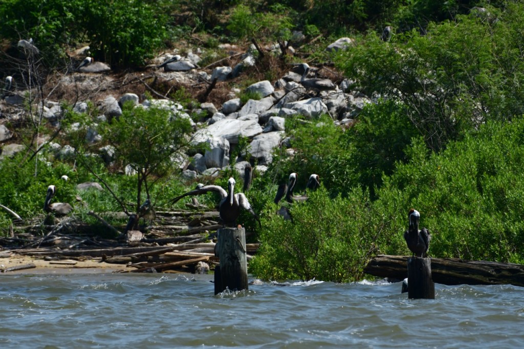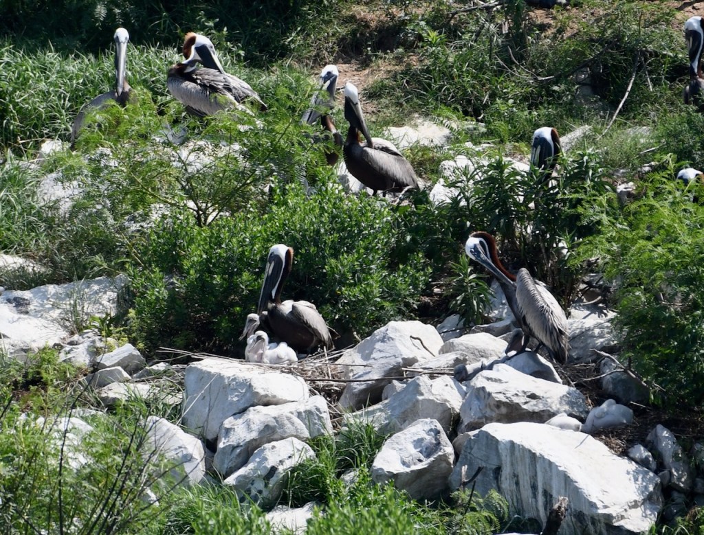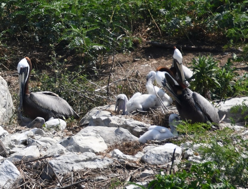Gaillard Island is a man made island in the middle of Mobile Bay. It was created from sand and silt dredged from the shipping channel. It is off limits to people so it is a safe haven for the birds that nest there. It is known as a Brown Pelican rookery. As you travel around the island, you can see Brown Pelicans nesting in the rocks. You have to look closely to see the baby pelicans because they blend in with the white rocks.