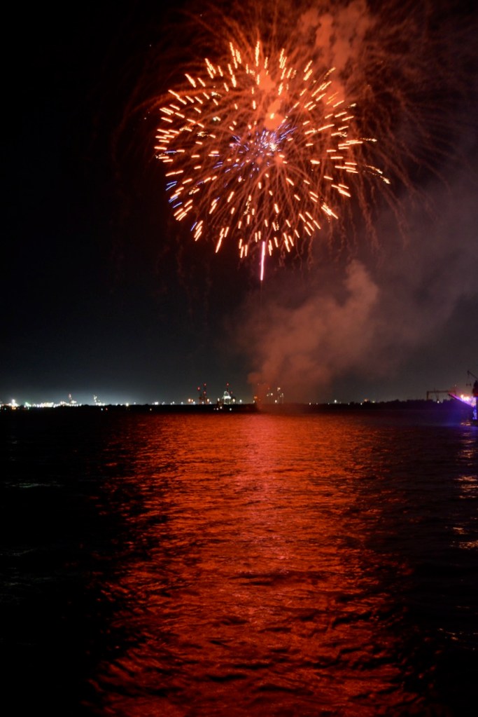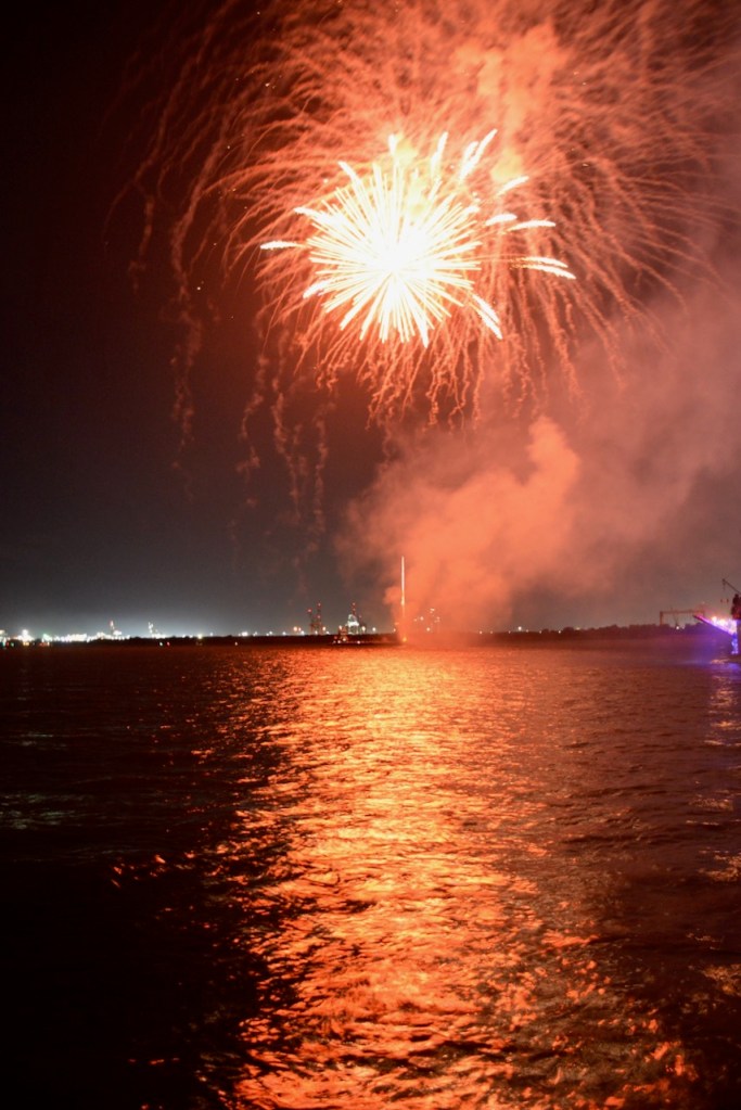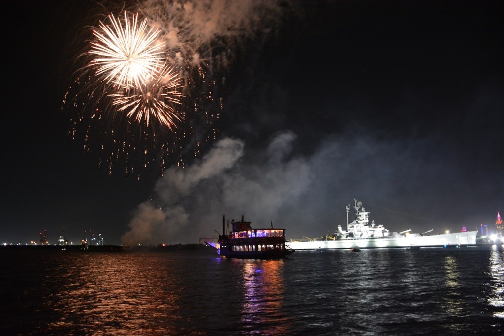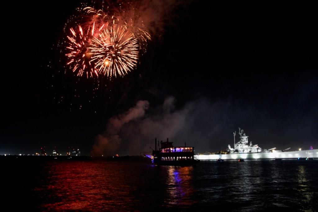 Aboard the Historical Blakeley State Park cruise boat, we had an unobstructed view of the fireworks, just not of the USS Alabama. The Perdido Queen sat in front of the ship during the fireworks and only moved when it was time to go. The USS Alabama is very impressive from the waterfront side and makes you think of what it must have looked like during WWII.