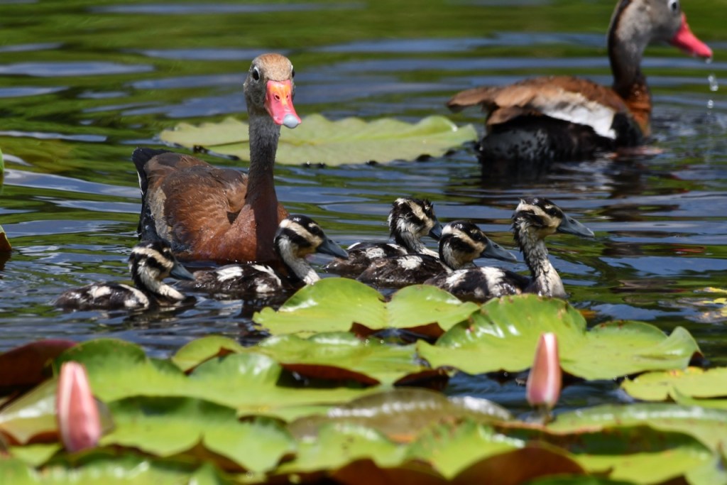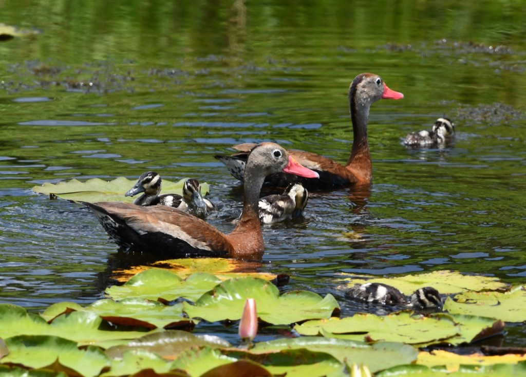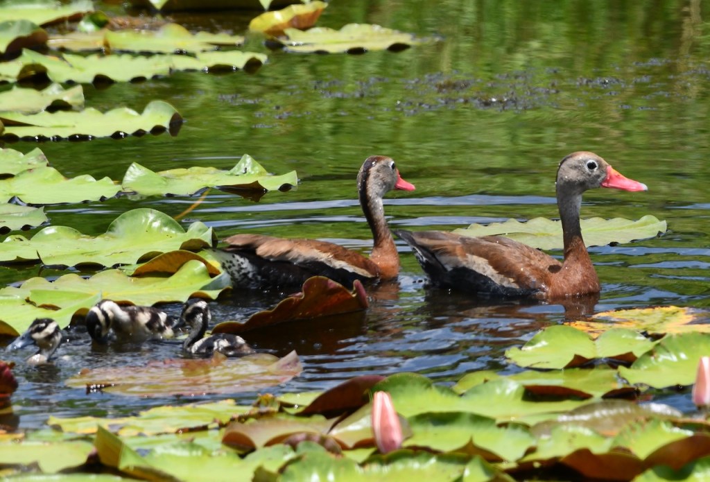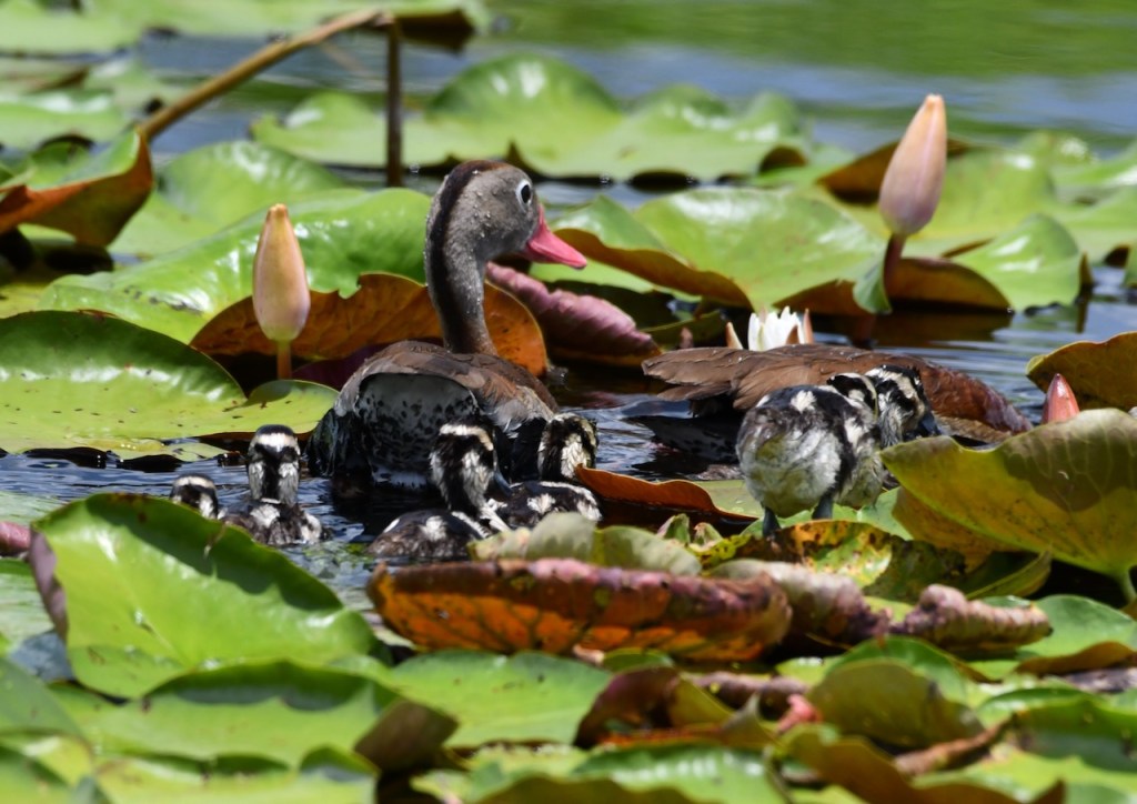 The Black-bellied Whistling Ducks had moved to the smaller lily pond at the Claude Peteet Mariculture Center when I drove through yesterday. It made for closer photos since the pond is beside the parking area. There are fewer ducklings than the last time, so it may be a different family of ducks.