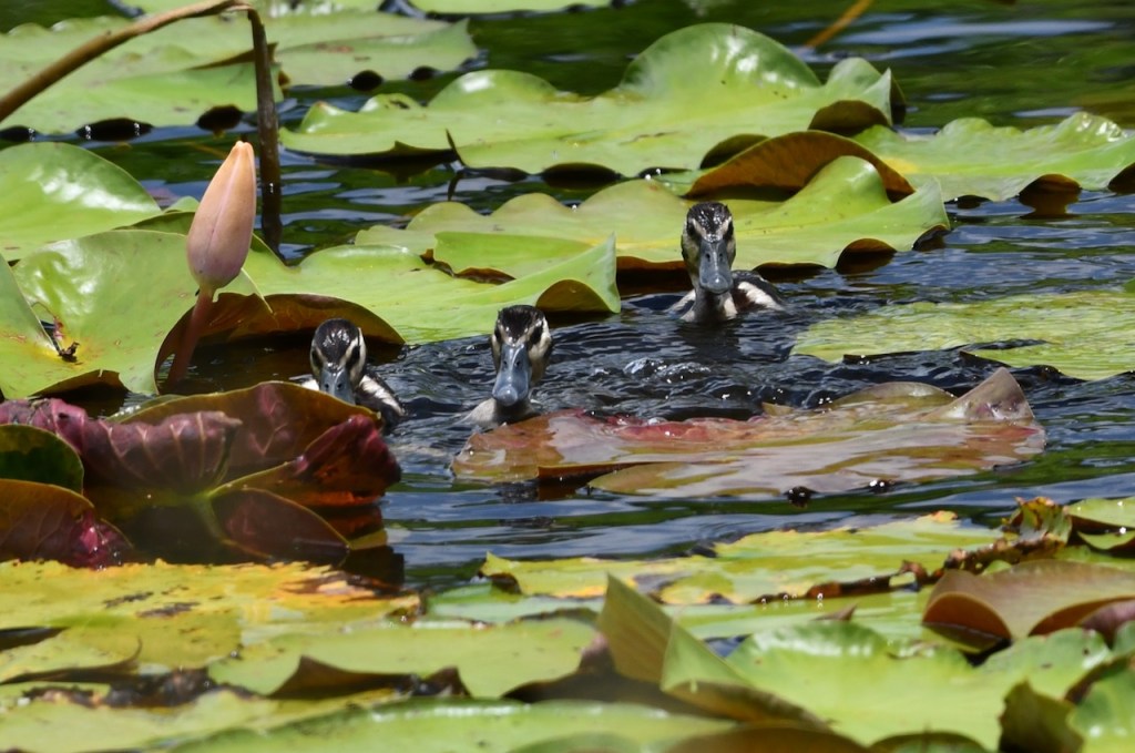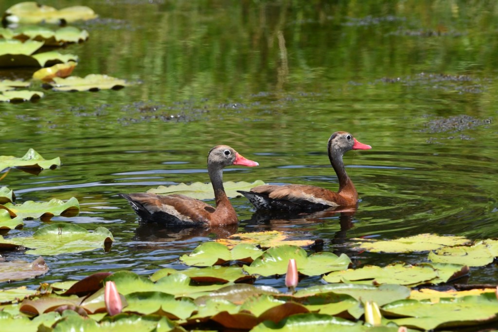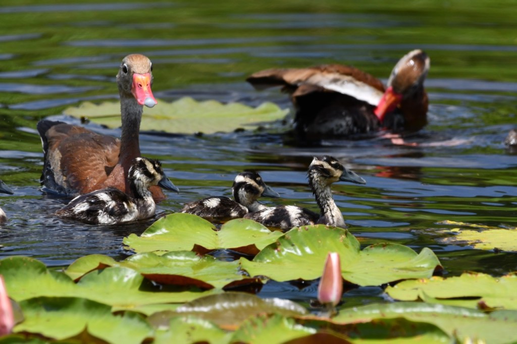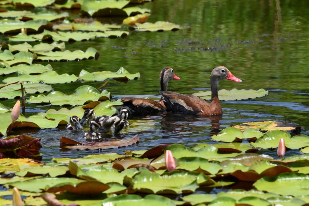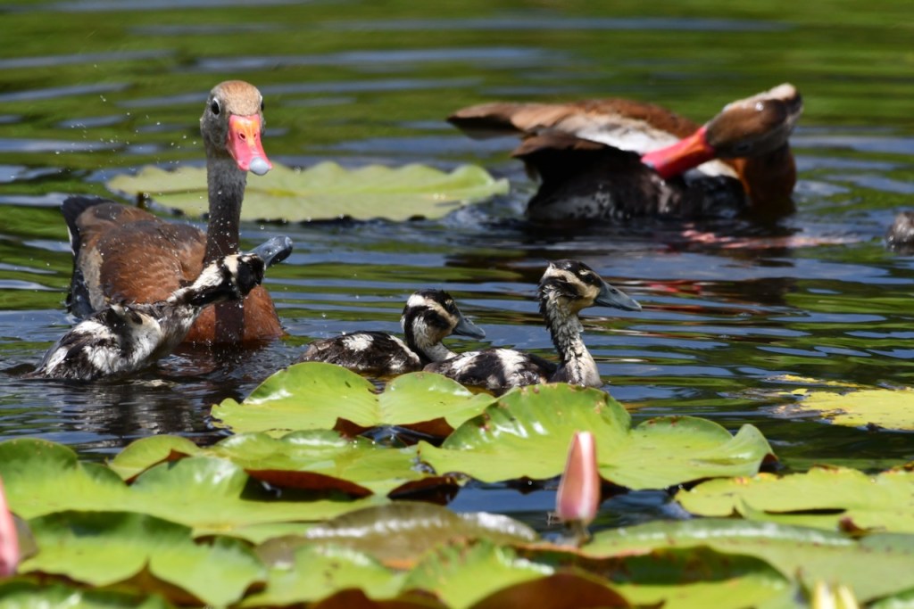 The Black-bellied Whistling Ducks had moved to the smaller lily pond at the Claude Peteet Mariculture Center when I drove through yesterday. It made for closer photos since the pond is beside the parking area. There are fewer ducklings than the last time, so it may be a different family of ducks.
