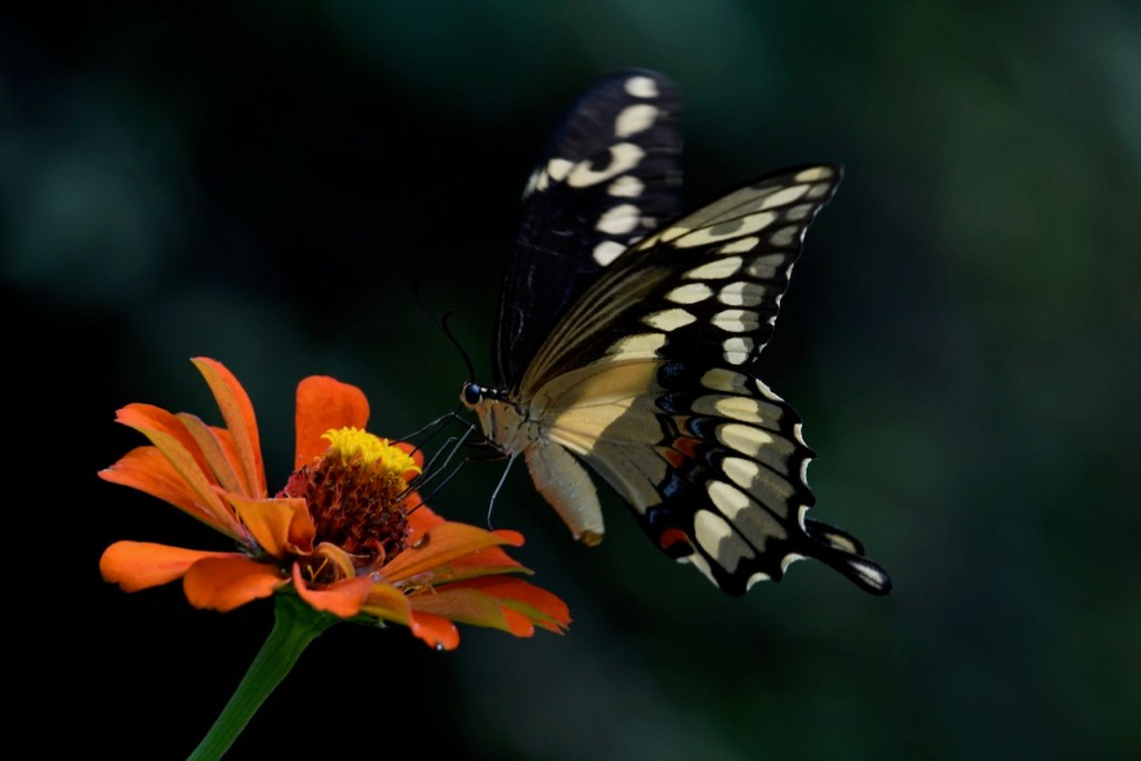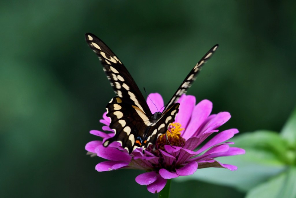 I planted zinnias in a pot last summer. I just thought they would bloom only one year. This summer, zinnias started blooming all around the pot from last year. Apparently those zinnias seeded the area around the pot and they waited to grow until this summer. It was quite a nice surprise. This Giant Swallowtail butterfly was happy to find them as well.