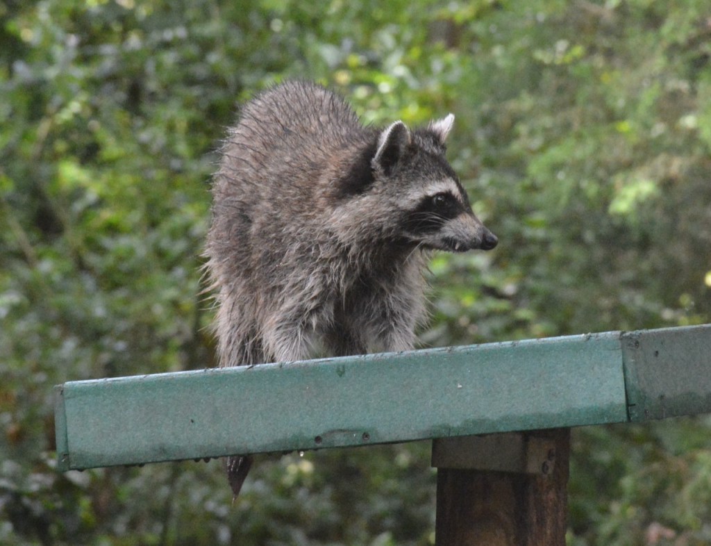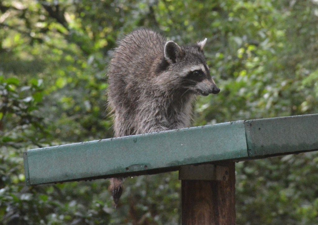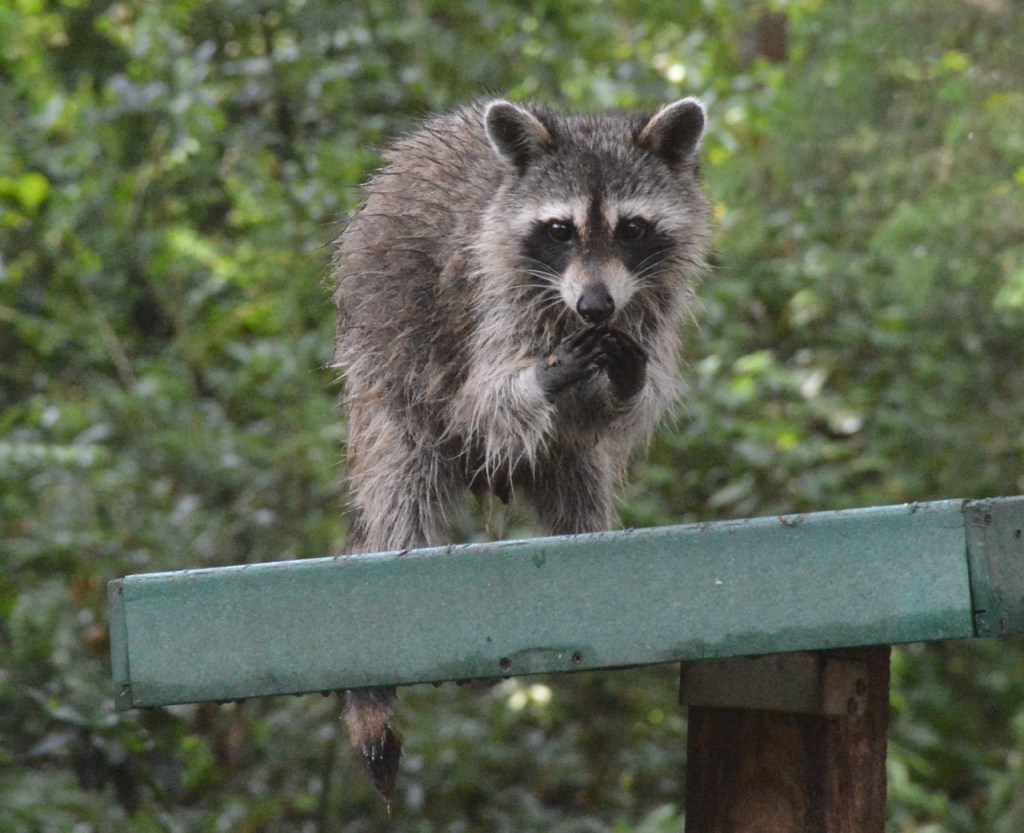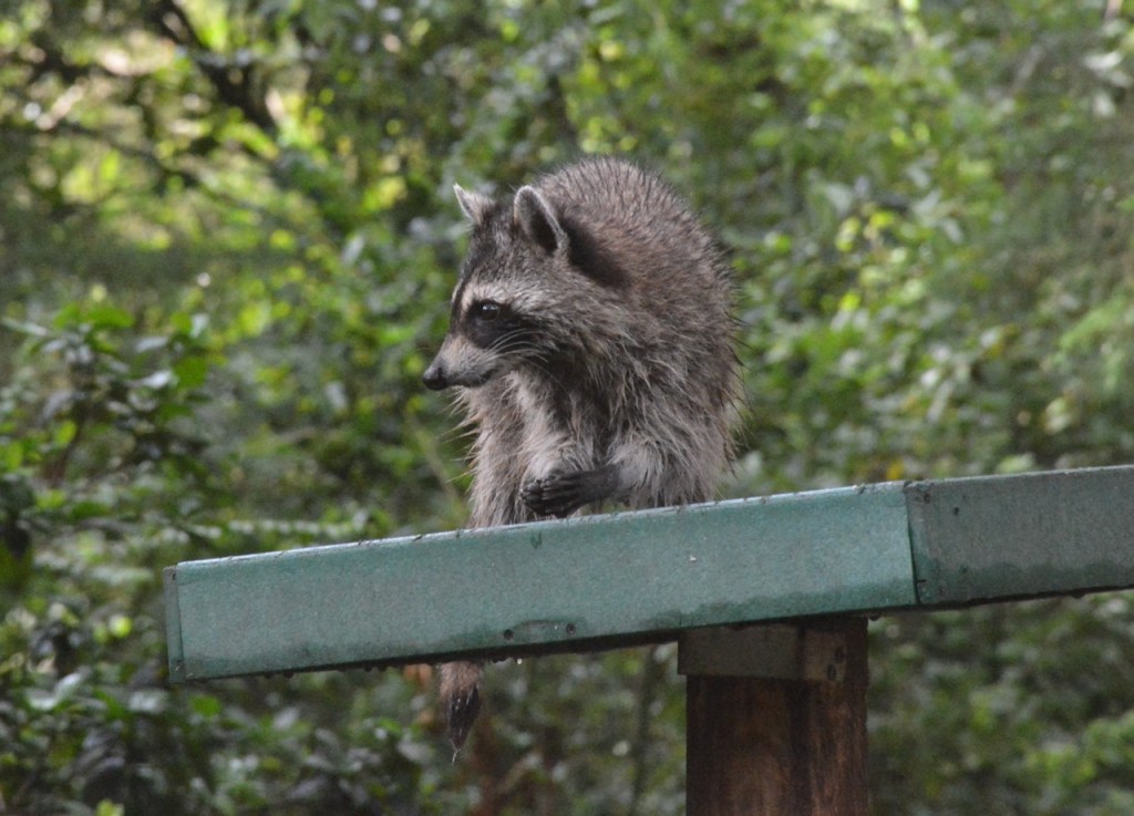 There are at least two different raccoons that come to my bird feeder. In order to get a photo, I have to take the picture through my sliding glass door. If I go outside, the raccoons immediately run away. I think they are cute.