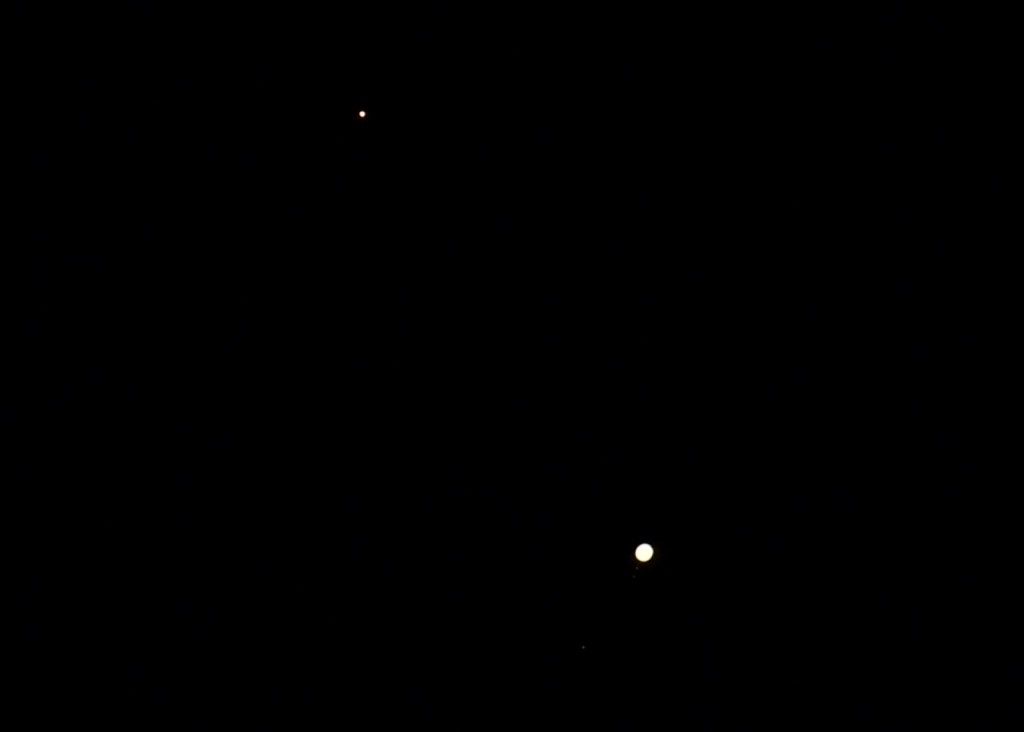 With the naked eye, these two planets looked like they were side by side and glowing brightly. When I used my camera zoom to take a photo, you could see the distance between them. I wish the camera could have taken the photo the way my eye saw it.