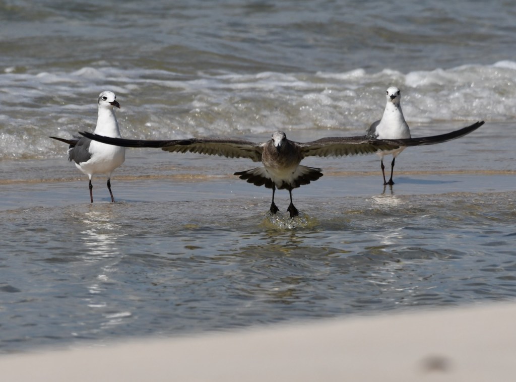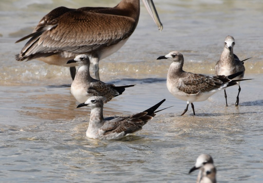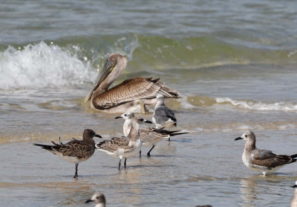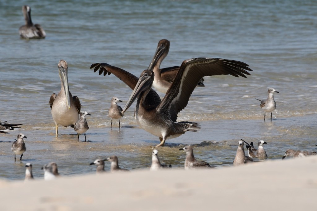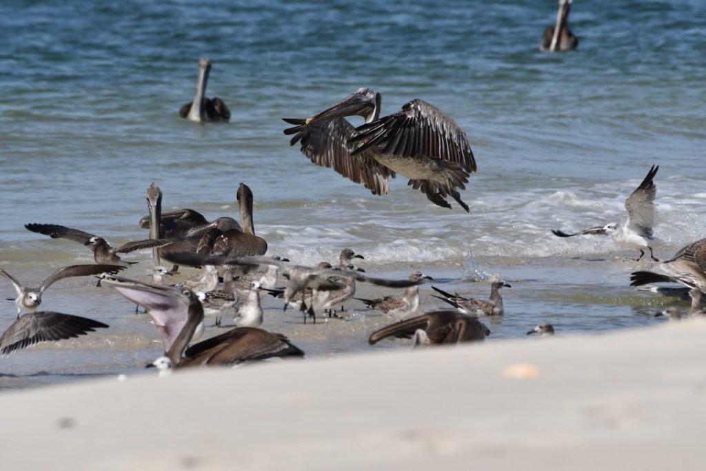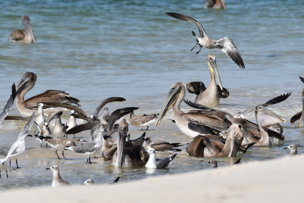 I drove to Fort Morgan today to see if there were any interesting migrating birds. All I found were these pelicans, terns, and gulls. There must have been a school of fish or minnows in this area between the sand bars because the birds were having a party scooping up food.