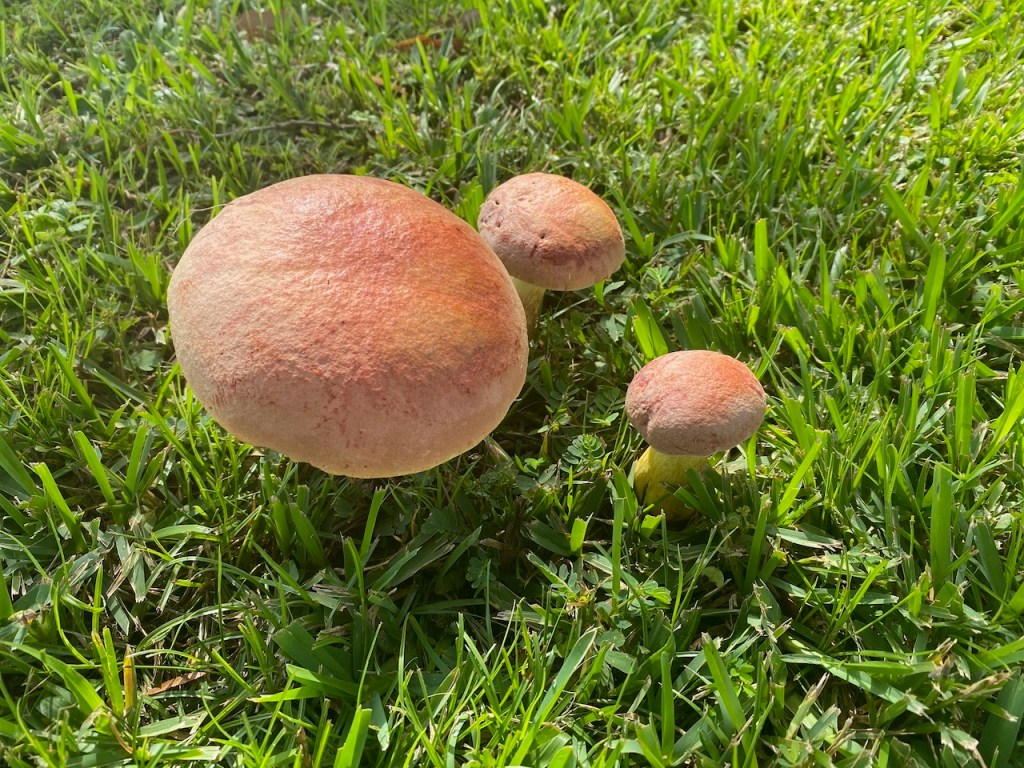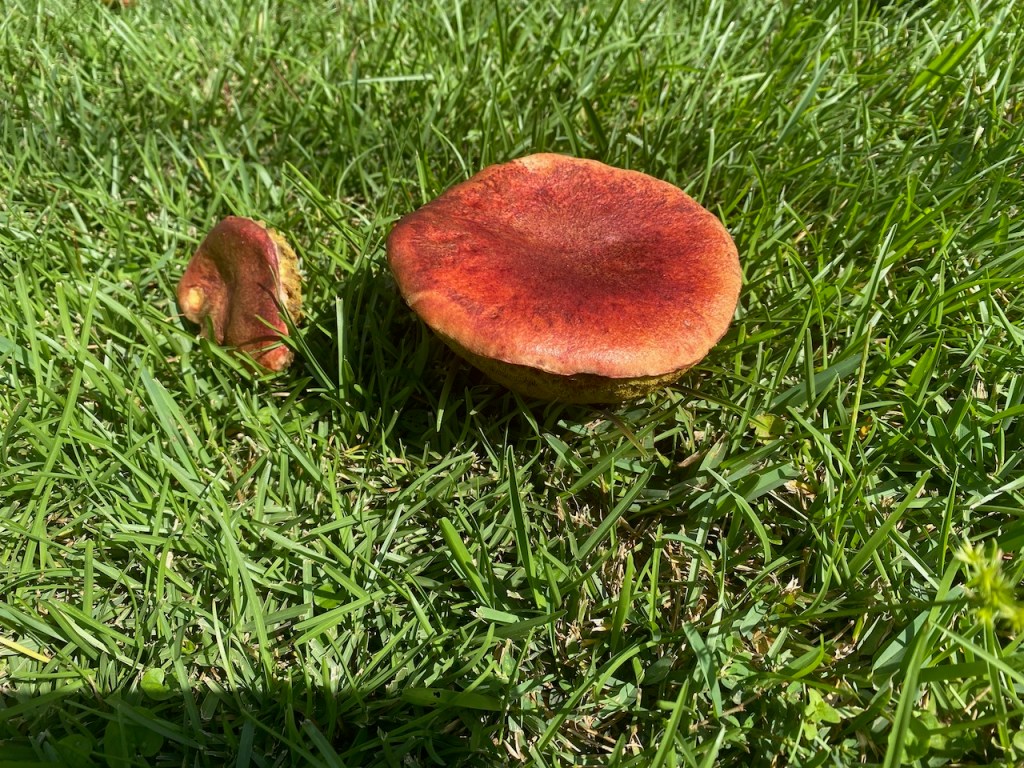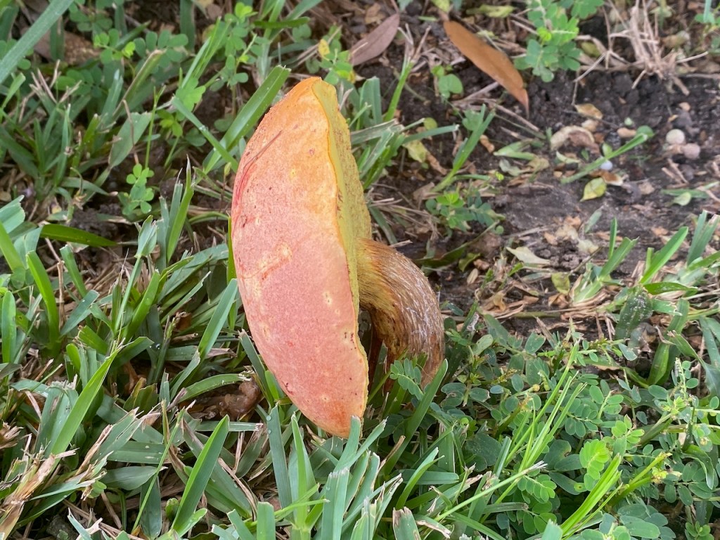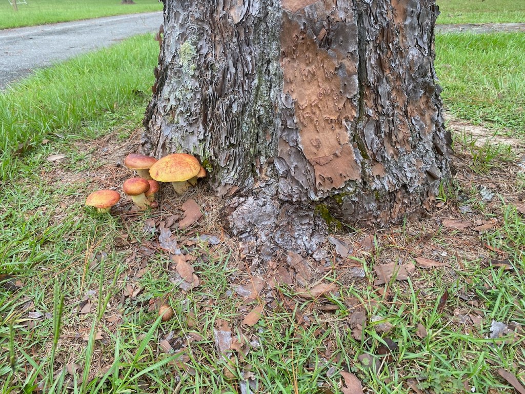 Large, orangish yellow, with a ring on the stalk. Grows in clusters on stumps and trunks, on ground, or over buried wood. August–October. Several species of mushrooms and plants are used, in many cultures, for their ability—to varying extents—to cause hallucinations. Most of these fungi and plants also commonly cause sickness or even death. This species is more likely to make you sick than “happy.” https://mdc.mo.gov/discover-nature/field-guide/big-laughing-gym-big-laughing-jim