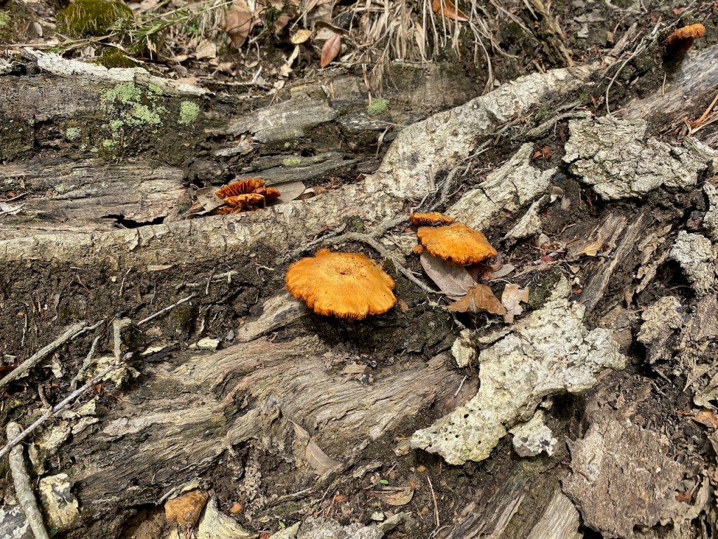 Don’t trust me on this mushroom identification. I used the Google app and it gave me multiple identification choices and none of them were identical to my photos. If this is Chicken of the Woods, then it is safe to eat. If this is Jack-o-Lantern fungus, then it is poisonous. I thought they were interesting, so I wanted to get a photo. They looked similar to the Laughing Gym mushrooms, but smaller and flatter.