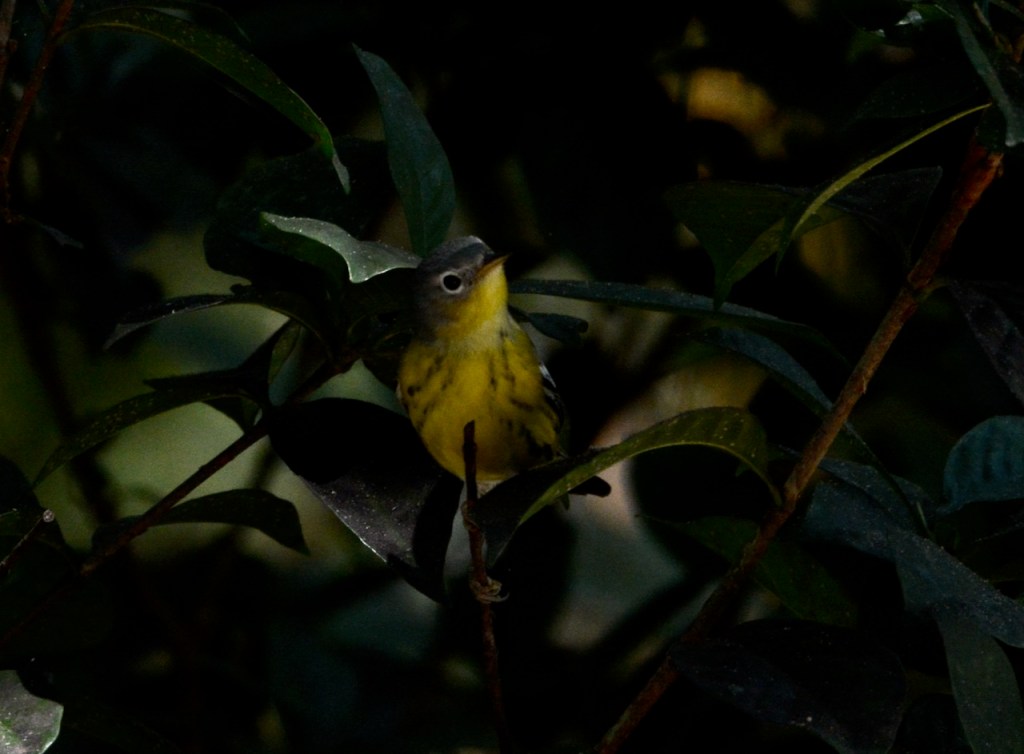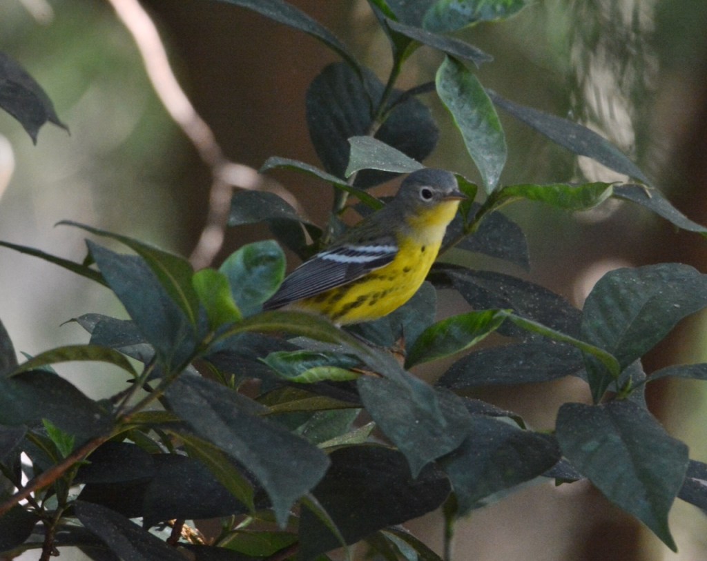 This female or immature Magnolia Warbler spent a day or two in my yard. The bright yellow made it easy to spot. It stayed in the bushes and did not come to my feeder. It looks for bugs on the undersides of leaves.