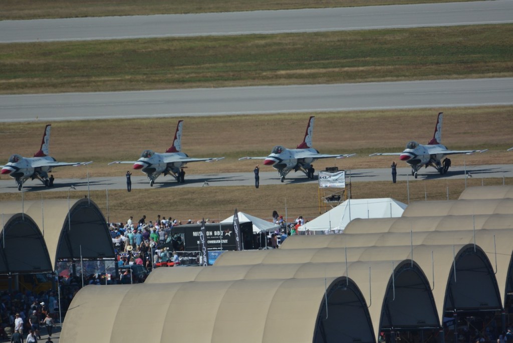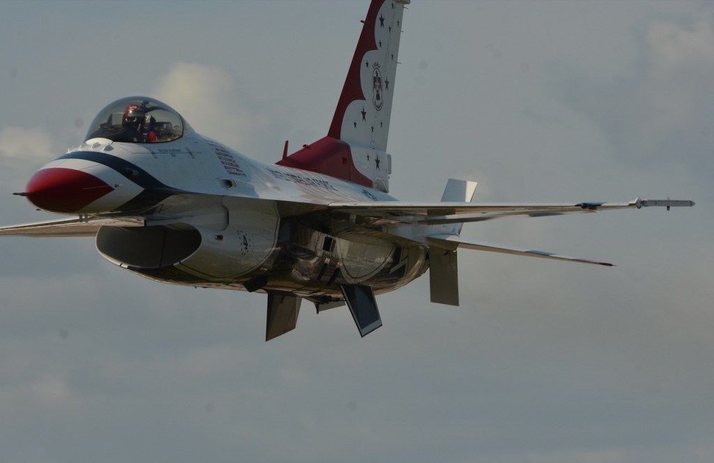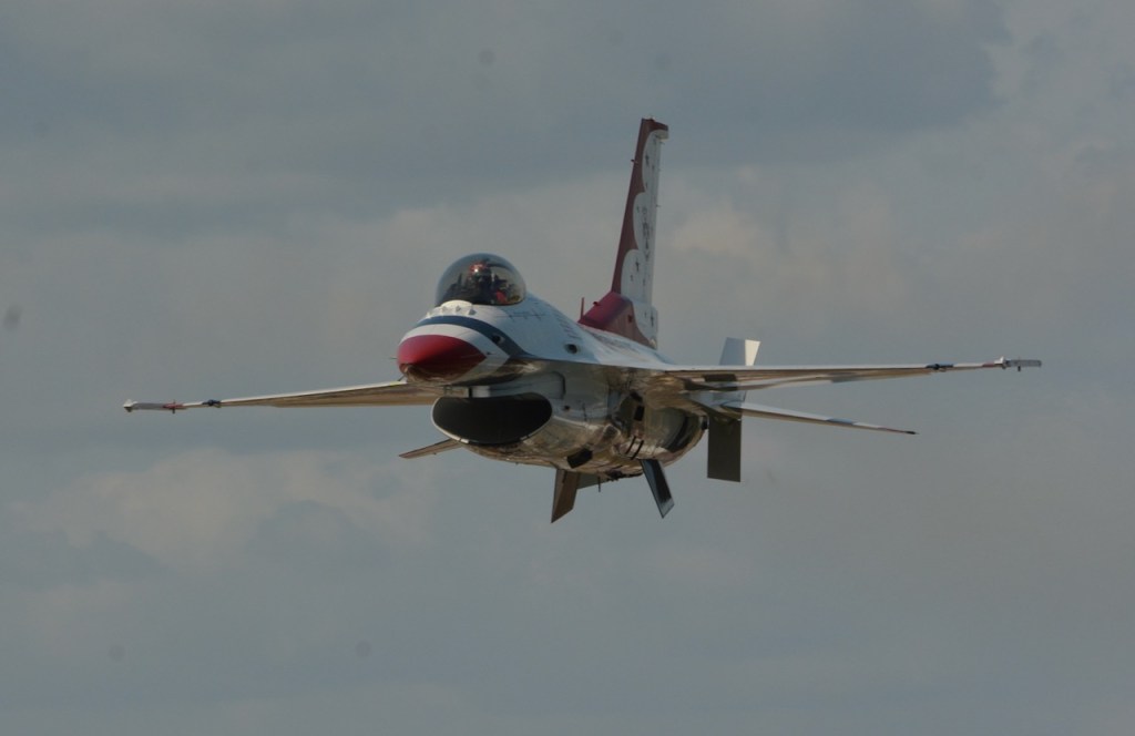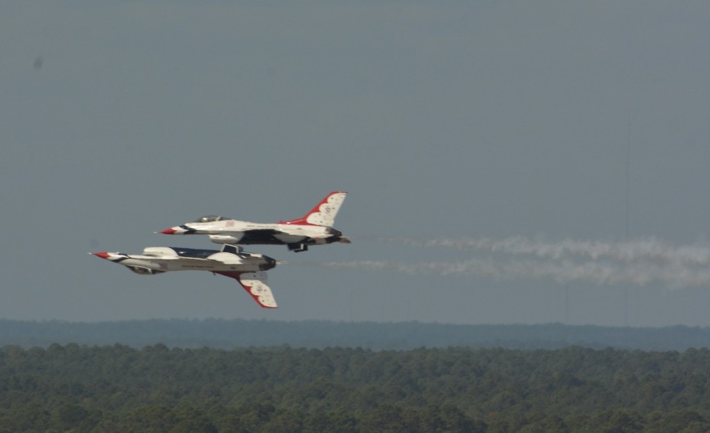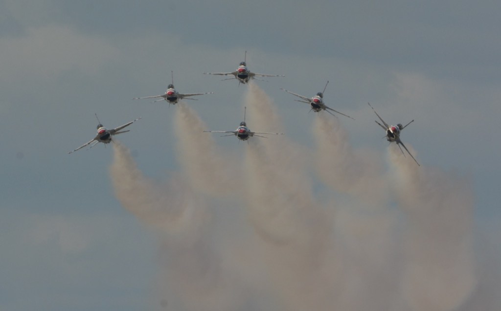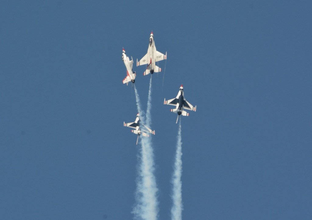 A Thunderbirds air demonstration is a mix of formation flying and solo routines. The four-aircraft diamond formation demonstrates the training and precision of Air Force pilots, while the solo aircraft highlight the maximum capabilities of the F-16 Fighting Falcon.