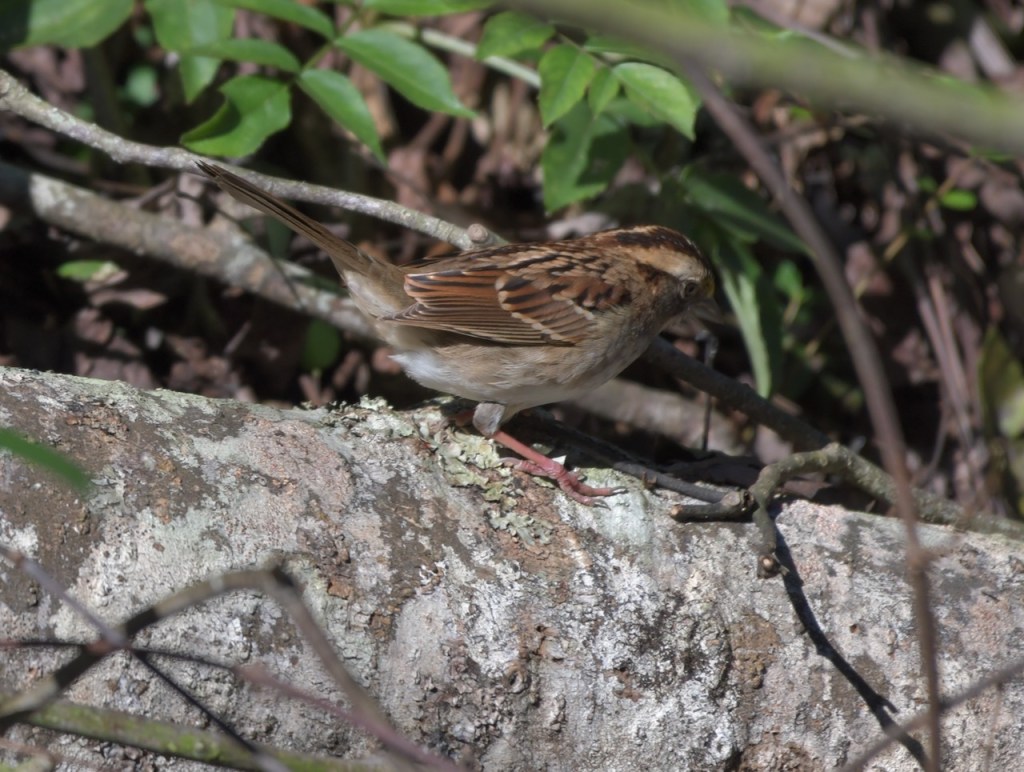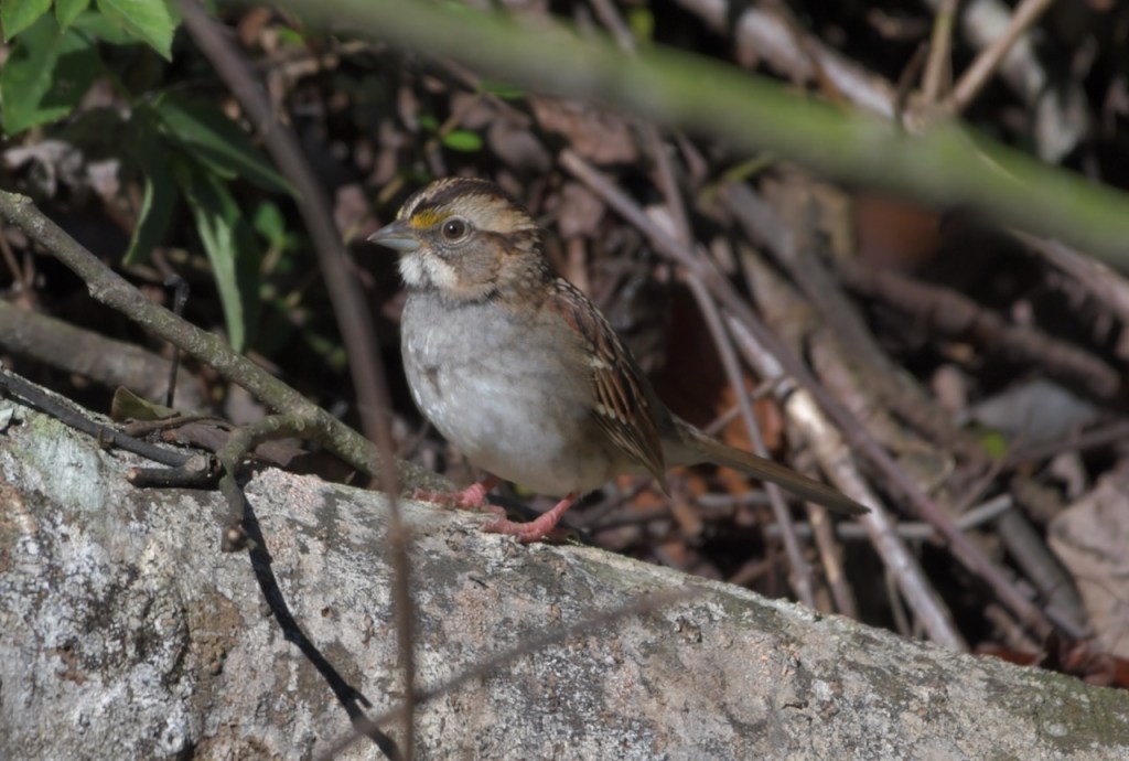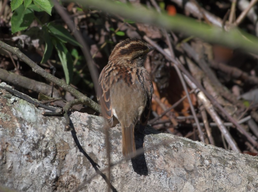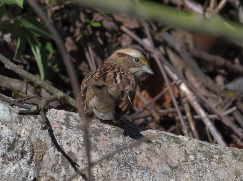 During winter months, White-throated Sparrows come to eat the bird feed I have in my yard. I spotted this one in the brush beside the creek in my back yard.