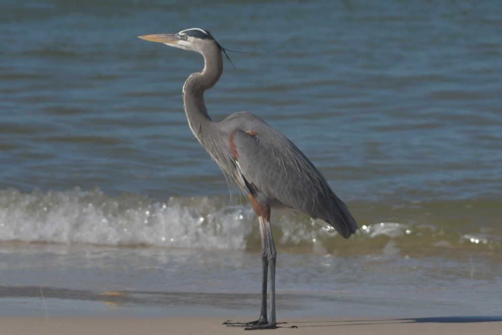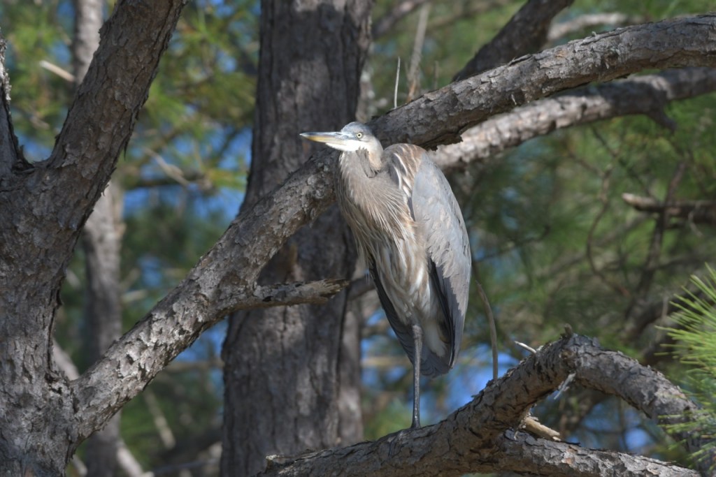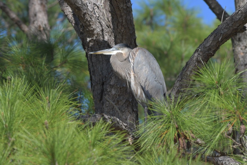 Not only will you see Great Blue Herons on the beach at Fort Morgan, but you can also find them in the pine trees. It is amazing that these large birds are able to fly through the trees in order to perch on a limb. The wingspan of a Great Blue Heron is 5.5 to 6.6 feet from wing tip to wing tip.