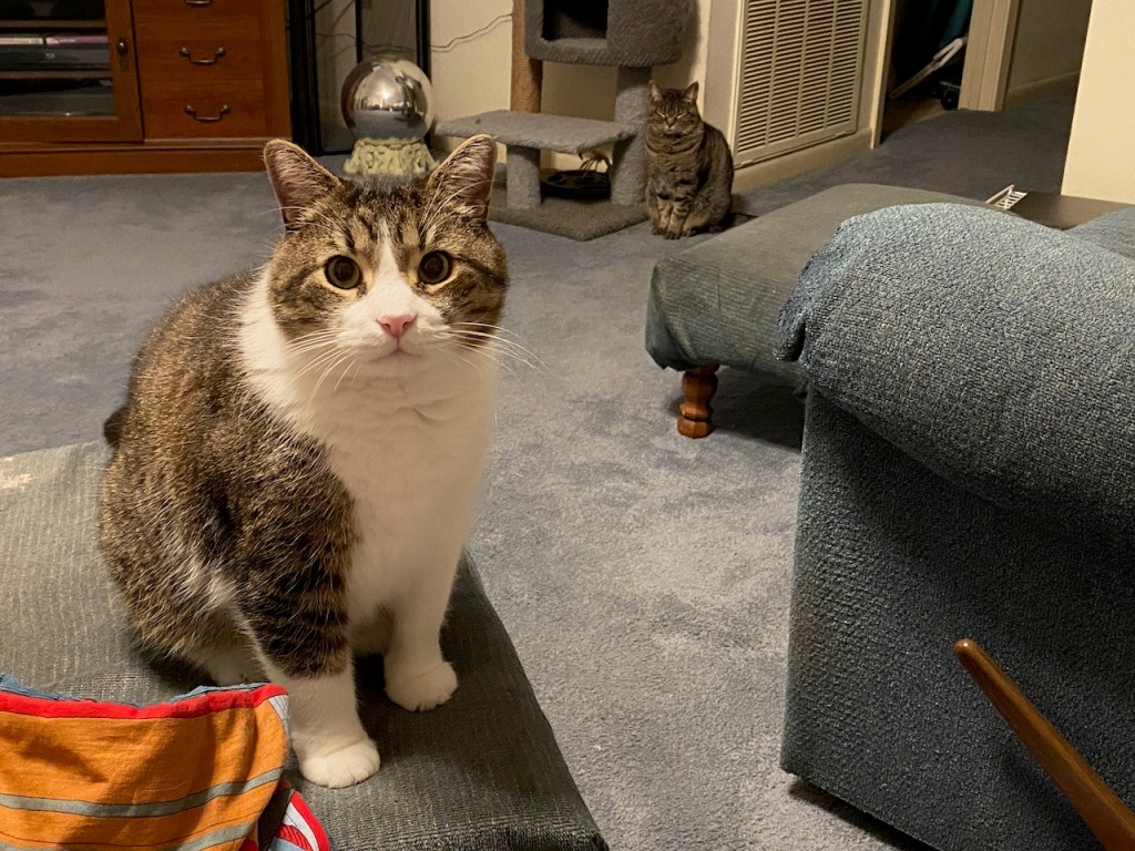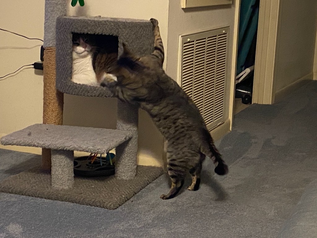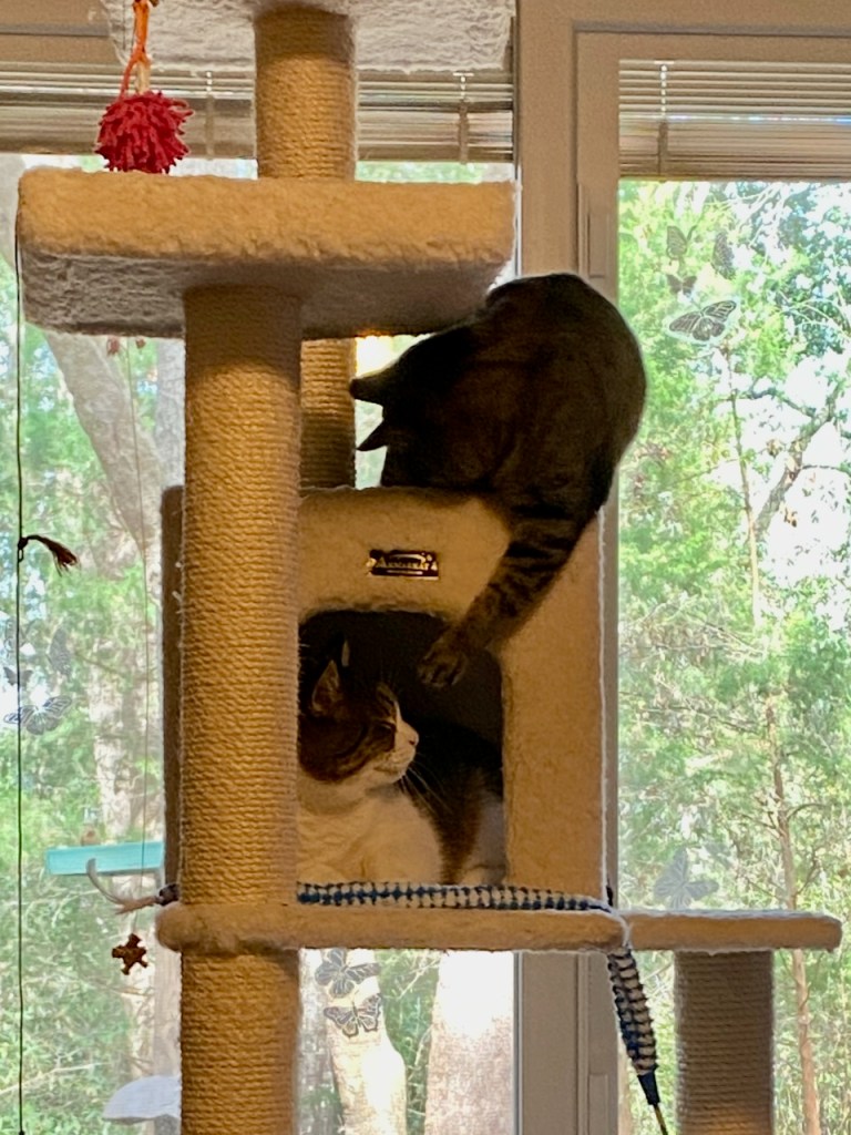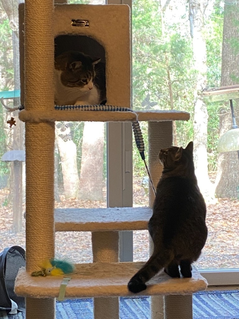 Oscar and LuLu Kitty are funny cats. Most of the time they totally ignore each other even when they are sitting side by side. Other times, one or the other will go out of their way to aggravate the other. LuLu Kitty apparently did not like Oscar sleeping on either of the cat trees because she proceeded to wake him up and swat at his face. He got up and left. All was well when I found them sleeping on my bed afterward.