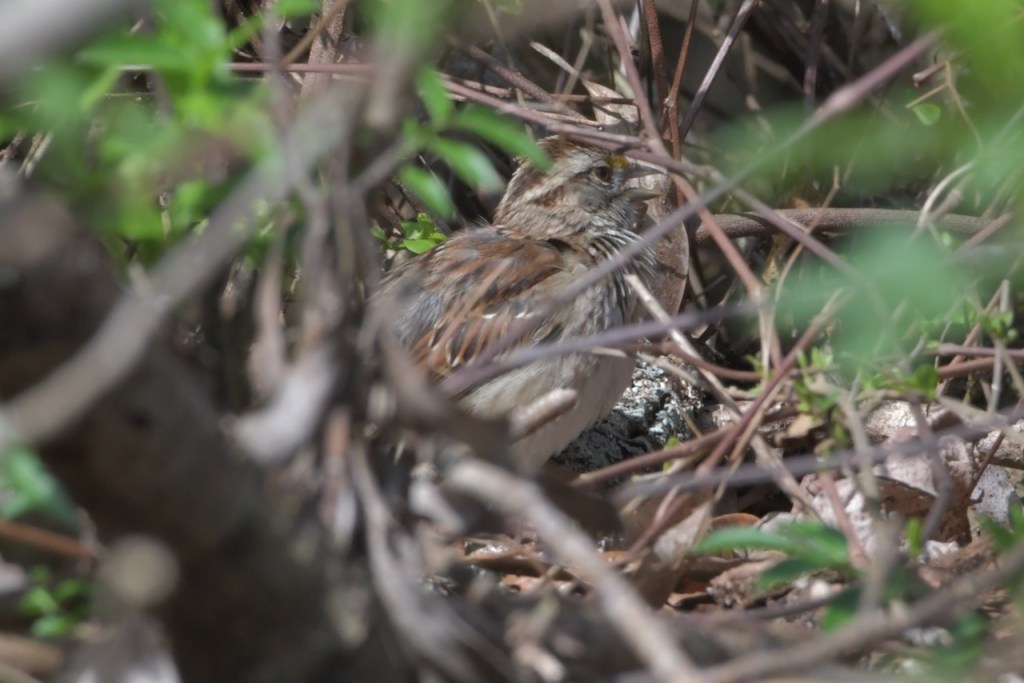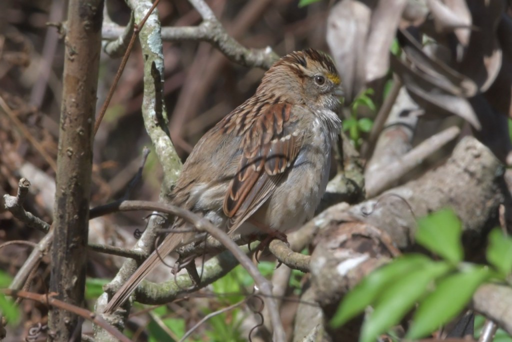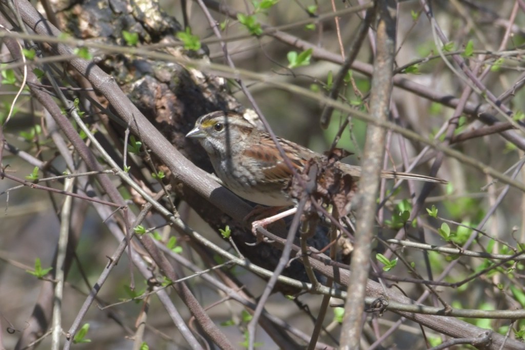 I’ve seen the White-throated Sparrow eating the seed on my path a lot during the winter. This winter, I’ve seen them down by the creek in the underbrush. They are a lot harder to spot because they blend in with the background.