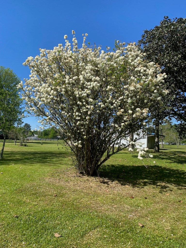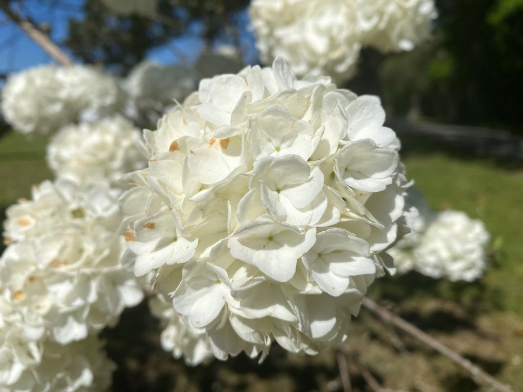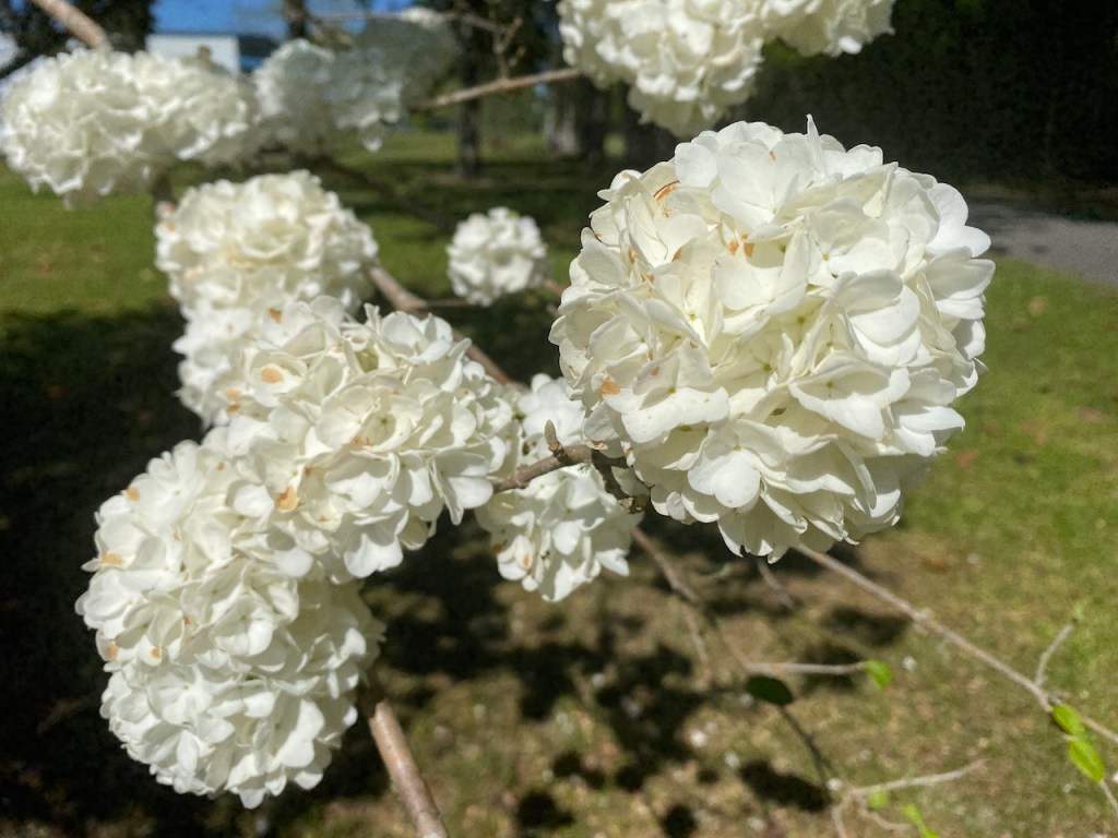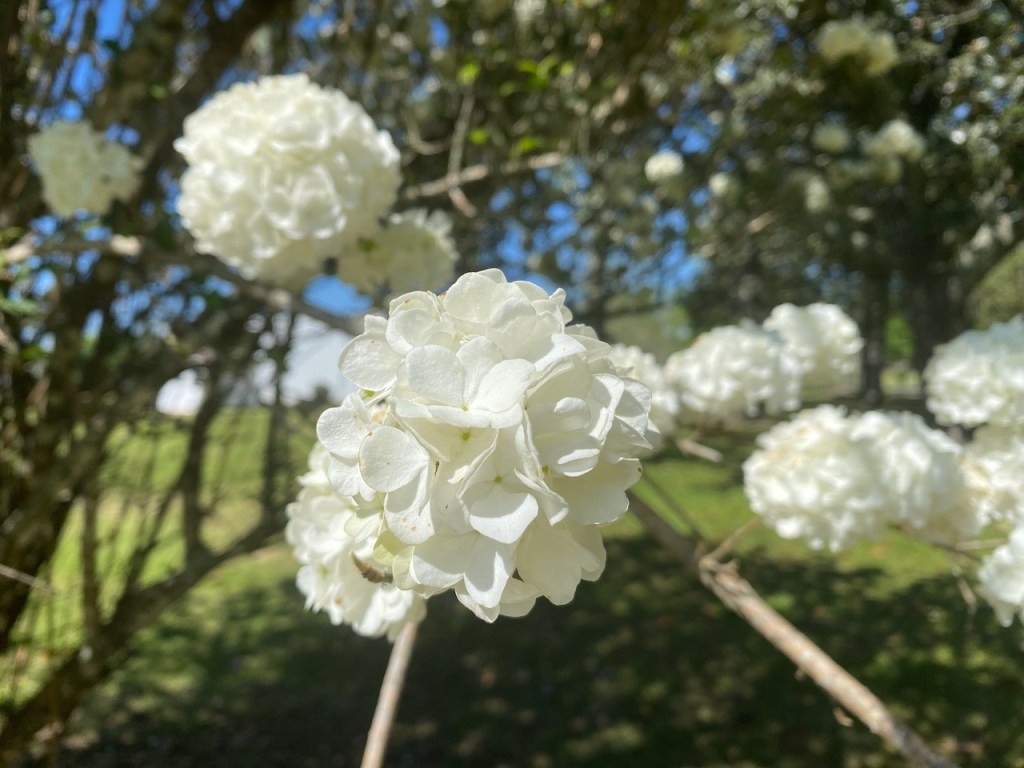 Without knowing the name of this bush, you would probably say the correct name: Snowball Bush. The blooms look just like snowballs.