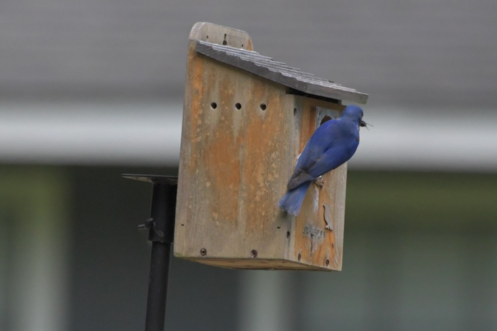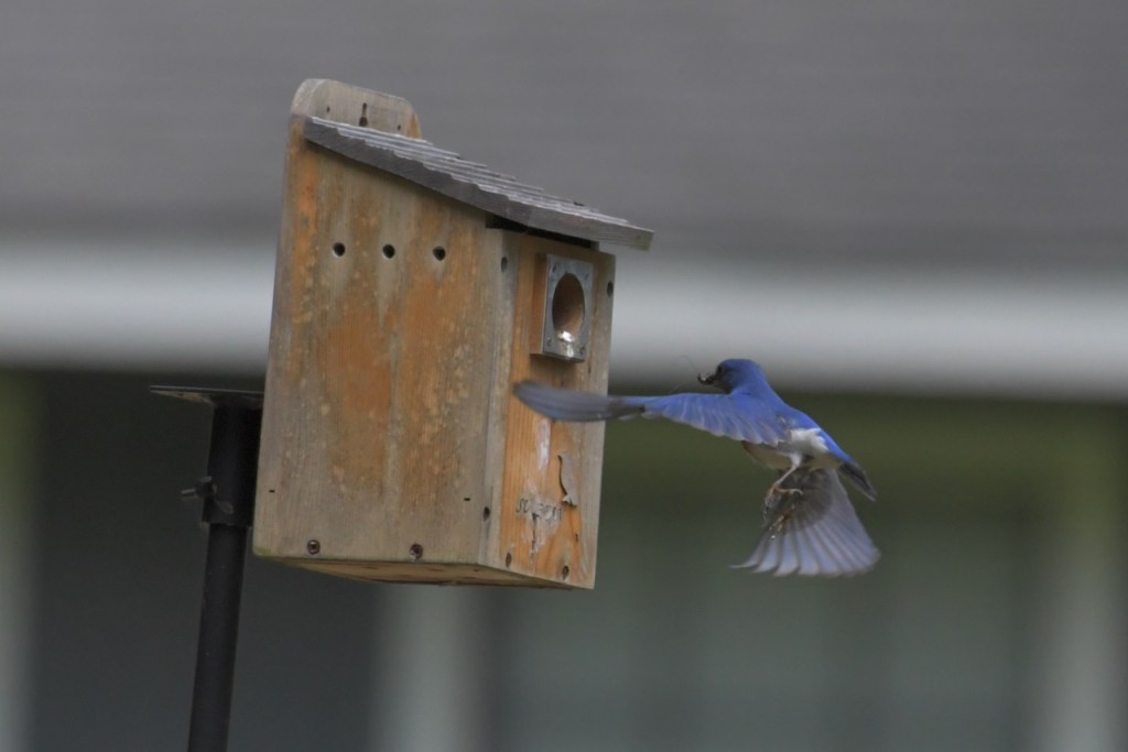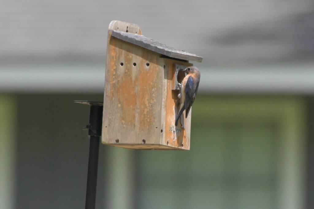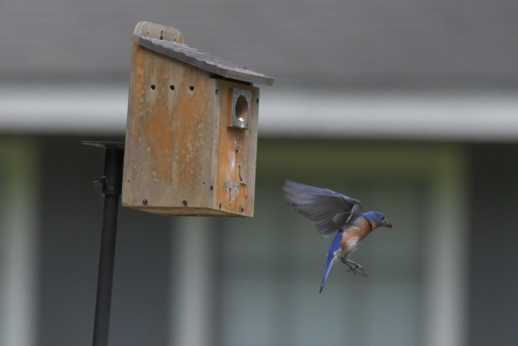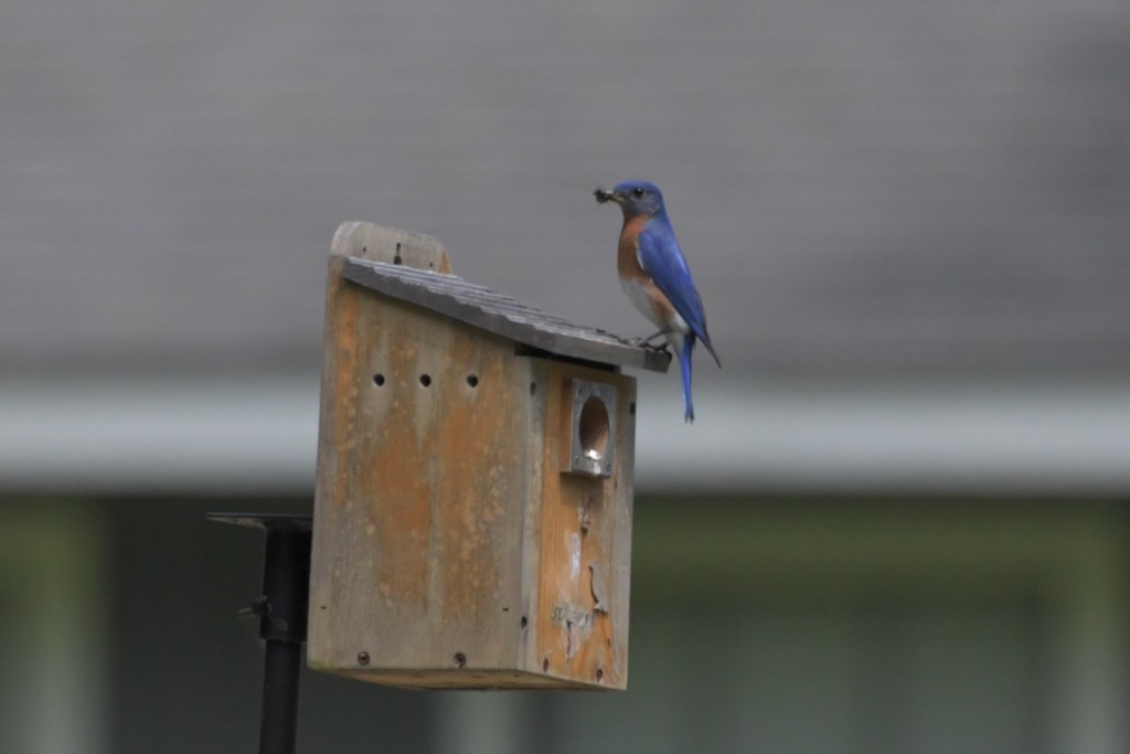 Both Eastern Bluebird parents bring food to the nestlings, and young from a previous brood also help to feed them in some cases. https://www.audubon.org/field-guide/bird/eastern-bluebird