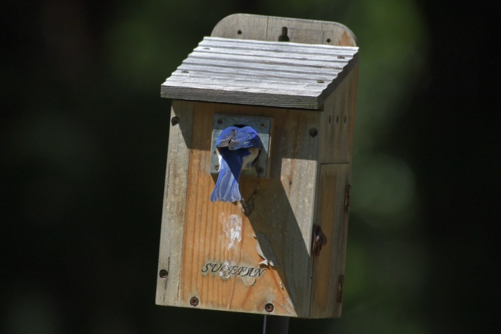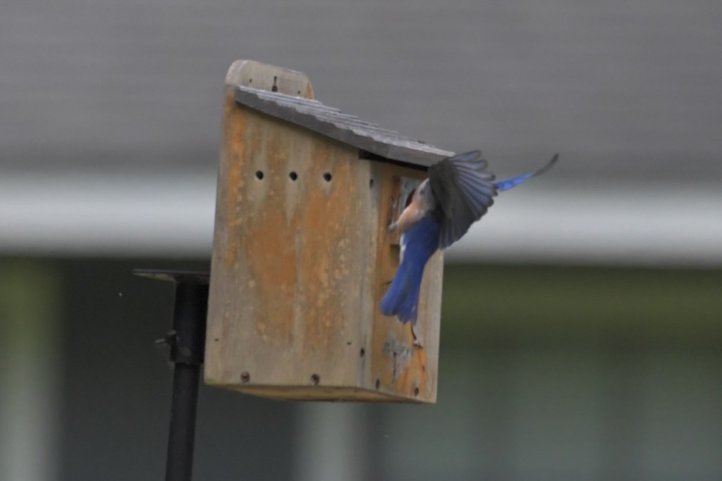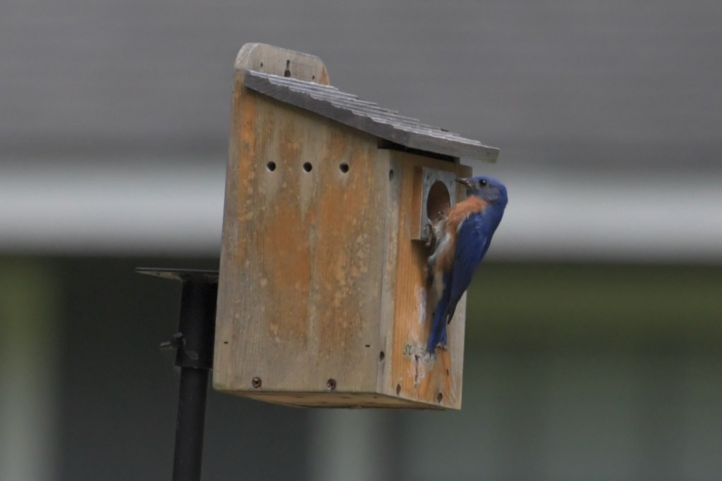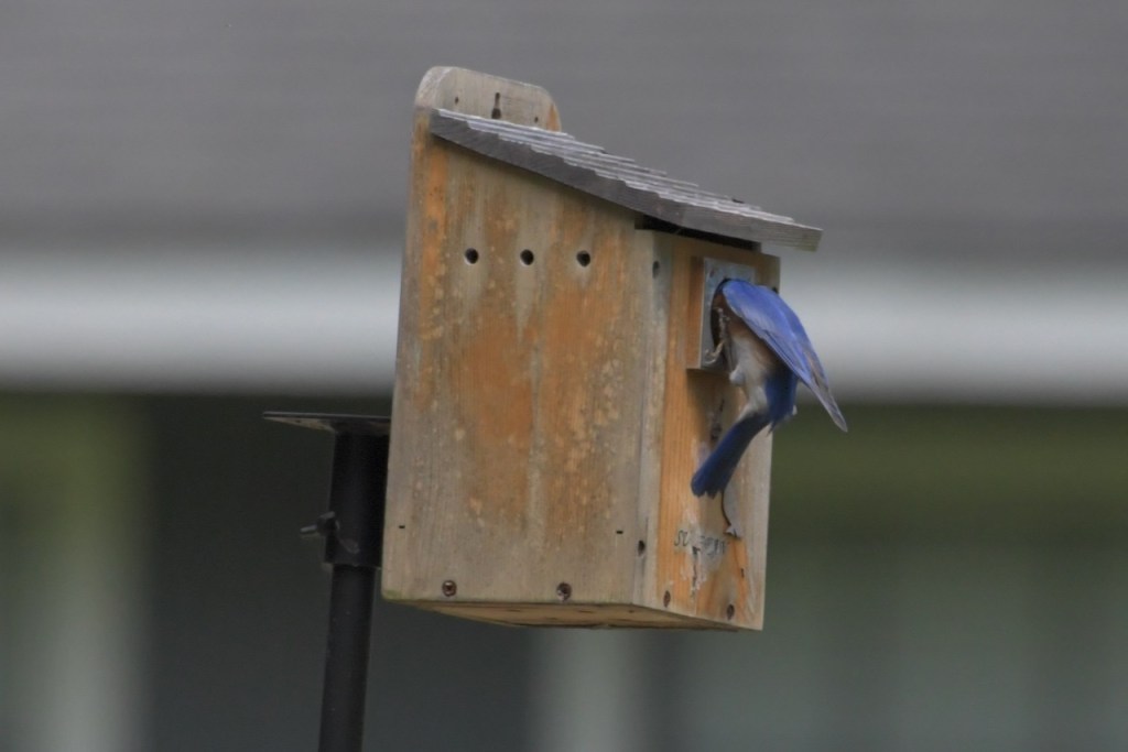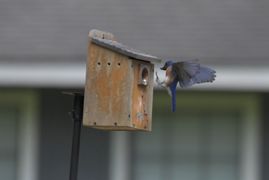 Both Eastern Bluebird parents bring food to the nestlings, and young from a previous brood also help to feed them in some cases. https://www.audubon.org/field-guide/bird/eastern-bluebird