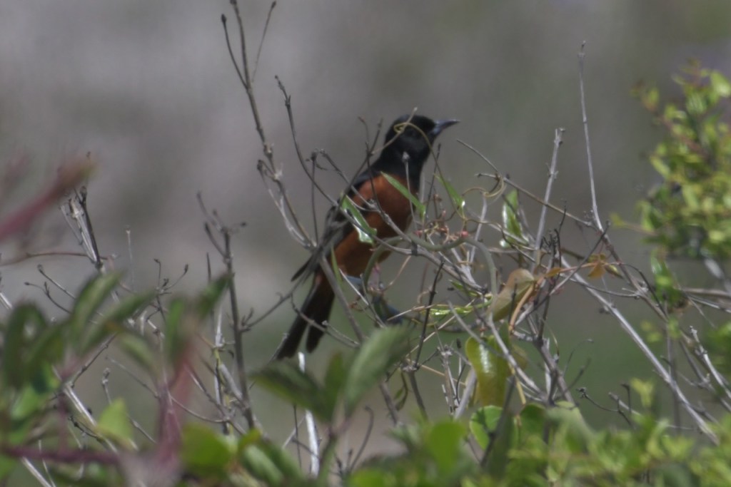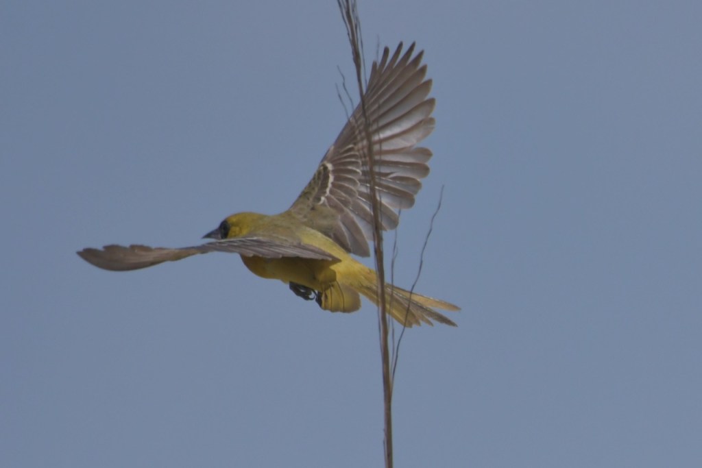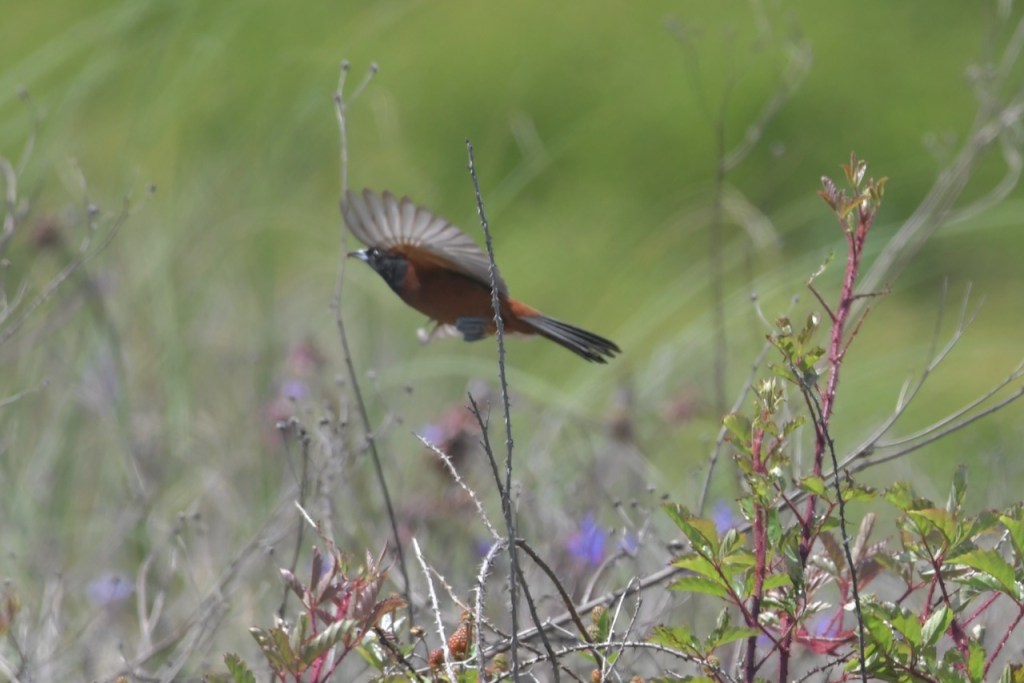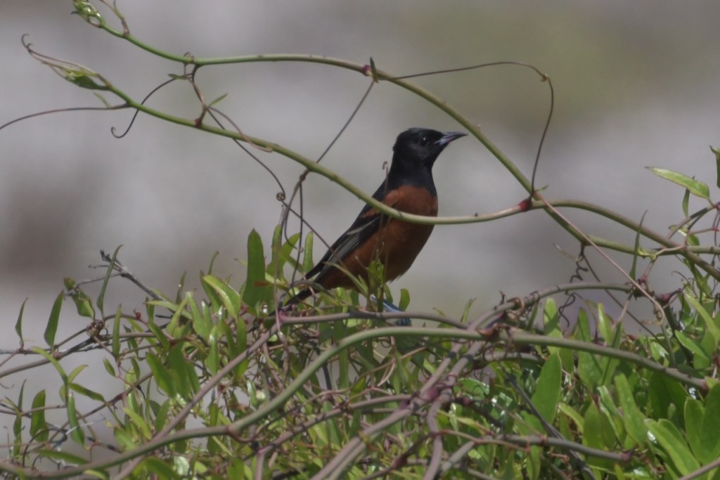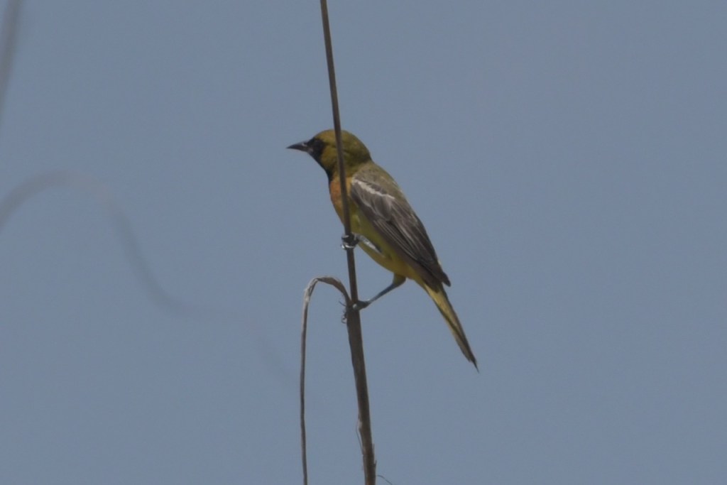Adult males are black above and rich reddish-chestnut below. They have a black head and throat, with a reddish-chestnut patch at the bend of the wing. Females are greenish yellow with two white wing bars and no black. Immature males look like females, but have black around the bill and throat. https://www.allaboutbirds.org/guide/Orchard_Oriole/id