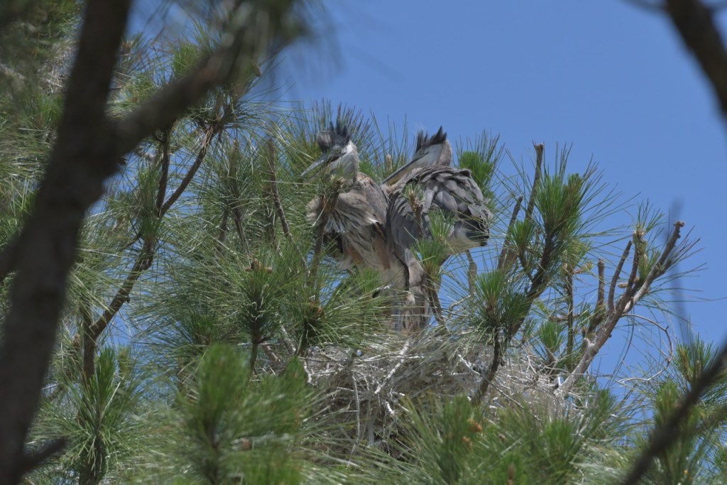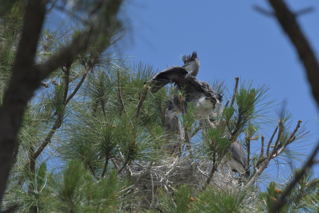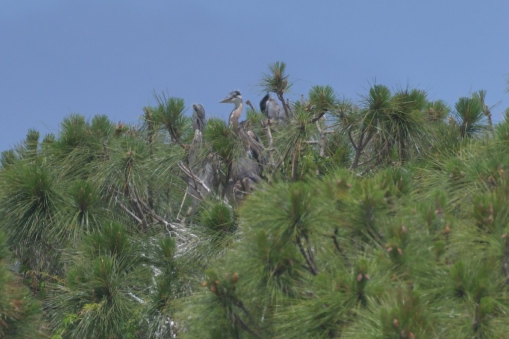 While on a new boardwalk on Dauphin Island, I noticed a couple looking up into the trees and hearing a lot of bird noises. They pointed out 2 nest of Great Blue Herons at the top of the pine trees. I kept looking and found at least 3 more nest. When herons nest in the same area it is called a heronry. If more than one type of water bird is nesting in an area it is called a rookery.